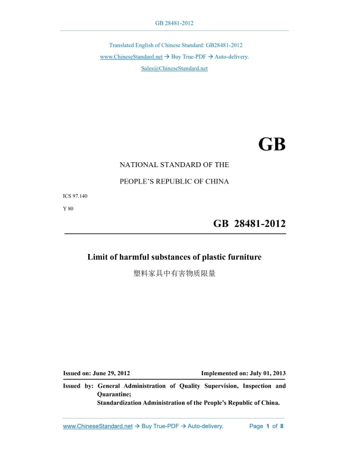 GB 28481-2012: Limit of harmful substances of plastic furniture Delivery: 9 seconds. True-PDF full-copy in English & invoice will be downloaded + auto-delivered via email. See step-by-step procedure Status: Valid