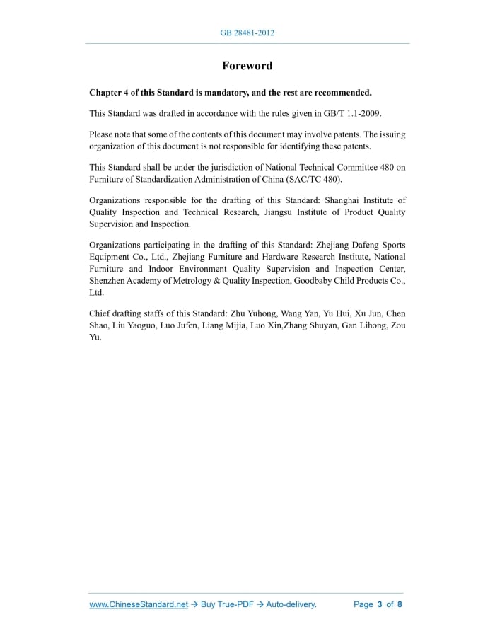 Similar standardsGB 28481-2012: Limit of harmful substances of plastic furniture---This is an excerpt. Full copy of true-PDF in English version (including equations, symbols, images, flow-chart, tables, and figures etc.), auto-downloaded/delivered in 9 seconds, can be purchased online: https://www.ChineseStandard.net/PDF.aspx/GB28481-2012GB NATIONAL STANDARD OF THE PEOPLE’S REPUBLIC OF CHINA ICS 97.140 Y 80 Limit of harmful substances of plastic furniture ISSUED ON: JUNE 29, 2012 IMPLEMENTED ON: JULY 01, 2013 Issued by: General Administration of Quality Supervision, Inspection and Quarantine; Standardization Administration of the People’s Republic of China. Table of ContentsForeword ... 3 1 Scope ... 4 2 Normative references ... 4 3 Terms and definitions ... 4 4 Requirements ... 6 5 Test methods ... 6 6 Inspection rules ... 7 7 Inspection report ... 8 8 Identification ... 8ForewordChapter 4 of this Standard is mandatory, and the rest are recommended. This Standard was drafted in accordance with the rules given in GB/T 1.1-2009. Please note that some of the contents of this document may involve patents. The issuing organization of this document is not responsible for identifying these patents. This Standard shall be under the jurisdiction of National Technical Committee 480 on Furniture of Standardization Administration of China (SAC/TC 480). Organizations responsible for the drafting of this Standard: Shanghai Institute of Quality Inspection and Technical Research, Jiangsu Institute of Product Quality Supervision and Inspection. Organizations participating in the drafting of this Standard: Zhejiang Dafeng Sports Equipment Co., Ltd., Zhejiang Furniture and Hardware Research Institute, National Furniture and Indoor Environment Quality Supervision and Inspection Center, Shenzhen Academy of Metrology & Quality Inspection, Goodbaby Child Products Co., Ltd. Chief drafting staffs of this Standard: Zhu Yuhong, Wang Yan, Yu Hui, Xu Jun, Chen Shao, Liu Yaoguo, Luo Jufen, Liang Mijia, Luo Xin,Zhang Shuyan, Gan Lihong, Zou Yu. Limit of harmful substances of plastic furniture1 ScopeThis Standard specifies the terms, requirements, test methods and inspection rules for the limit of harmful substances of plastic furniture. This Standard applies to all kinds of plastic furniture products used indoor and outdoor, as well as in public places.2 Normative referencesThe following referenced documents are indispensable for the application of this document. For dated references, only the edition cited applies to this document. For undated references, the latest edition (including any amendment) applies to this document. GB 5296.6-2004, Instructions for use of products of consumer interest - Part 6: furniture GB 6675-2003, National safety technical code for toys GB/T 16288-2008, Marking of plastics products GB/T 22048-2008, Toys and children’s products - Determination of phthalate plasticizers in polyvinyl chloride plastic SN/T 1877.2-2007, Determination of polycyclic aromatic hydrocarbons in plastic and plastic article SN/T 2005.2-2005, Determination of polybromobiphenyls and polybromobiphenyl ethers in electrical and electronic equipment - Part 2: GC-MS method3 Terms and definitionsThe following terms and definitions are applicable to this document. 3.1 Plastic furniture Furniture made entirely of plastic materials, or furniture made of frames or components mainly composed of plastic sheets, pipes, profiles, etc. 3.2 Phthalates Carry out according to the method specified in Appendix C of GB 6675-2003. 5.4 Determination of the total of benzo[α]pyrene and polycyclic aromatic hydrocarbons (PAH) Carry out according to method 1 specified in SN/T 1877.2-2007. 5.5 Determination of polybrominated biphenyls Carry out according to the method specified in SN/T 2005.2-2005. 5.6 Determination of polybrominated diphenyl ether Carry out according to the method specified in SN/T 2005.2-2005.6 Inspection rules6.1 Inspection items All technical contents listed in this Standard are type inspection items. 6.1.1 Under normal production conditions, type inspection shall be carried out at least once a year. 6.1.2 Type inspection shall be carried out in any of the following cases: -- when a new product is initially finalized; -- when the product is produced off-site; -- when there are major changes in product formula, production process and raw materials; -- when production is resumed after a suspension of three months and above. -- when it is requested by the client; -- when the national quality and technical supervision agency proposes type inspection requirements. 6.2 Determination of the test result 6.2.1 When the results of all inspection items meet the requirements of this Standard, the product is determined to be qualified; if any of the inspection results does not meet the requirements of this Standard, the product is determined to be unqualified. 6.2.2 Where the furniture contains different plastic materials, if all materials meet the requirements of this Standard, the product is judged to be qualified; if any one of the ......Source: Above contents are excerpted from the full-copy PDF -- translated/reviewed by: www.ChineseStandard.net / Wayne Zheng et al. Tips & Frequently Asked Questions:Question 1: How long will the true-PDF of English version of GB 28481-2012 be delivered?Answer: The full copy PDF of English version of GB 28481-2012 can be downloaded in 9 seconds, and it will also be emailed to you in 9 seconds (double mechanisms to ensure the delivery reliably), with PDF-invoice.Question 2: Can I share the purchased PDF of GB 28481-2012_English with my colleagues?Answer: Yes. The purchased PDF of GB 28481-2012_English will be deemed to be sold to your employer/organization who actually paid for it, including your colleagues and your employer's intranet.Question 3: Does the price include tax/VAT?Answer: Yes. Our tax invoice, downloaded/delivered in 9 seconds, includes all tax/VAT and complies with 100+ countries' 