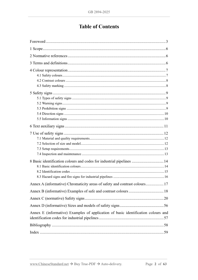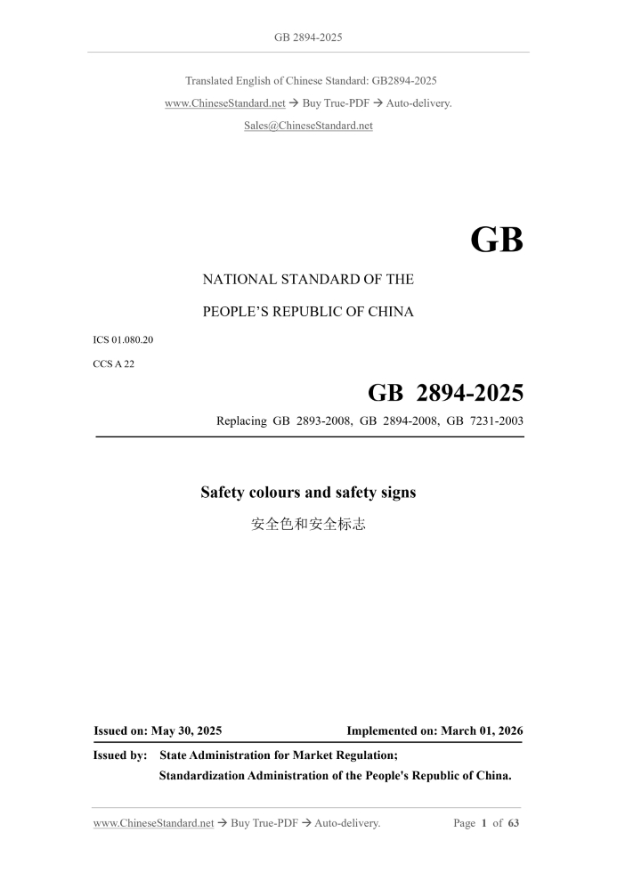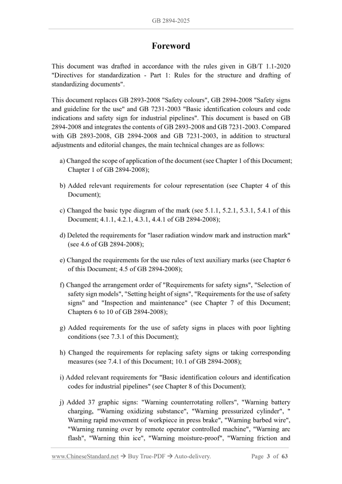 Similar standardsGB 2894-2025: Safety colours and safety signs---This is an excerpt. Full copy of true-PDF in English version (including equations, symbols, images, flow-chart, tables, and figures etc.), auto-downloaded/delivered in 9 seconds, can be purchased online: https://www.ChineseStandard.net/PDF.aspx/GB2894-2025GB NATIONAL STANDARD OF THE PEOPLE’S REPUBLIC OF CHINA ICS 01.080.20 CCS A 22 Replacing GB 2893-2008, GB 2894-2008, GB 7231-2003 Safety colours and safety signs Issued on: MAY 30, 2025 Implemented on: MARCH 01, 2026 Issued by. State Administration for Market Regulation; Standardization Administration of the People's Republic of China. Table of ContentsForeword... 3 1 Scope... 6 2 Normative references... 6 3 Terms and definitions... 6 4 Colour representation... 7 4.1 Safety colours... 7 4.2 Contrast colours... 8 4.3 Safety marking... 8 5 Safety signs... 9 5.1 Types of safety signs... 9 5.2 Warning signs... 9 5.3 Prohibition signs... 9 5.4 Direction signs... 10 5.5 Information signs... 10 6 Text auxiliary signs... 11 7 Use of safety signs... 12 7.1 Material and quality requirements... 12 7.2 Selection of size and model... 12 7.3 Setup requirements... 13 7.4 Inspection and maintenance... 13 8 Basic identification colours and codes for industrial pipelines... 14 8.1 Basic identification colours... 14 8.2 Identification codes... 15 8.3 Hazard signs and fire signs for industrial pipelines... 16 Annex A (informative) Chromaticity areas of safety and contrast colours... 17 Annex B (informative) Examples of safe and contrast colours... 18 Annex C (normative) Safety signs... 20 Annex D (informative) Sizes and models of safety signs... 56 Annex E (informative) Examples of application of basic identification colours and identification codes for industrial pipelines... 57 Bibliography... 58 Index... 59ForewordThis document was drafted in accordance with the rules given in GB/T 1.1-2020 "Directives for standardization - Part 1.Rules for the structure and drafting of standardizing documents". This document replaces GB 2893-2008 "Safety colours", GB 2894-2008 "Safety signs and guideline for the use" and GB 7231-2003 "Basic identification colours and code indications and safety sign for industrial pipelines". This document is based on GB 2894-2008 and integrates the contents of GB 2893-2008 and GB 7231-2003.Compared with GB 2893-2008, GB 2894-2008 and GB 7231-2003, in addition to structural adjustments and editorial changes, the main technical changes are as follows. a) Changed the scope of application of the document (see Chapter 1 of this Document; Chapter 1 of GB 2894-2008); b) Added relevant requirements for colour representation (see Chapter 4 of this Document); c) Changed the basic type diagram of the mark (see 5.1.1, 5.2.1, 5.3.1, 5.4.1 of this Document; 4.1.1, 4.2.1, 4.3.1, 4.4.1 of GB 2894-2008); d) Deleted the requirements for "laser radiation window mark and instruction mark" (see 4.6 of GB 2894-2008); e) Changed the requirements for the use rules of text auxiliary marks (see Chapter 6 of this Document; 4.5 of GB 2894-2008); f) Changed the arrangement order of "Requirements for safety signs", "Selection of safety sign models", "Setting height of signs", "Requirements for the use of safety signs" and "Inspection and maintenance" (see Chapter 7 of this Document; Chapters 6 to 10 of GB 2894-2008); g) Added requirements for the use of safety signs in places with poor lighting conditions (see 7.3.1 of this Document); h) Changed the requirements for replacing safety signs or taking corresponding measures (see 7.4.1 of this Document; 10.1 of GB 2894-2008); i) Added relevant requirements for "Basic identification colours and identification codes for industrial pipelines" (see Chapter 8 of this Document); j) Added 37 graphic signs. "Warning counterrotating rollers", "Warning battery charging, "Warning oxidizing substance", "Warning pressurized cylinder", " Warning rapid movement of workpiece in press brake", "Warning barbed wire", "Warning running over by remote operator controlled machine", "Warning arc flash", "Warning thin ice", "Warning moisture-proof", "Warning friction and Safety colours and safety signs1 ScopeThis document specifies the colour representation for conveying safety information, the types of safety signs and their settings, usage requirements, and the basic identification colours and identification codes for industrial pipelines. This document is applicable to the design, production and installation of safety signs in production and operation units and public places where there are safety risks or where it is necessary to remind people to pay attention to safety. This document does not apply to traffic signs used in railways, highways, inland waterways, sea and air transport.2 Normative referencesThis document has no normative references.3 Terms and definitionsFor the purposes of this document, the following terms and definitions apply. 3.1 safety colour Colours that convey safety information. NOTE. Include four colours. yellow, red, blue, and green. 3.2 contrast colour Contrast colours that contrast with safety colours to make them more eye-catching. NOTE. Include black and white. 3.3 safety sign safety warning sign A sign composed of graphic symbols, safety colours, geometric shapes (frames) or text to express specific safety information. 3.4 safety marking Signs that use safety colours and/or contrast colours to convey safety information or make an object or place stand out. 3.5 warning sign Safety signs that remind you to pay attention to the surrounding environment and things and avoid potential hazards. 3.6 prohibition sign Safety signs prohibiting certain unsafe behaviors or actions. 3.7 direction sign Safety signs that force you to take certain precautions or perform certain behaviors or actions. 3.8 information sign Safety signs that provide certain information (such as indicating safety facilities or places, etc.). 3.9 identification colour Colours that ar