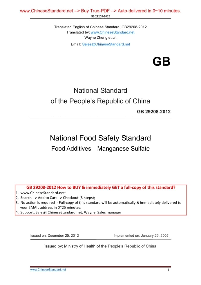 GB 29208-2012: National food safety standards -- Food additives -- Manganese sulfate Delivery: 9 seconds. True-PDF full-copy in English & invoice will be downloaded + auto-delivered via email. See step-by-step procedure Status: Valid