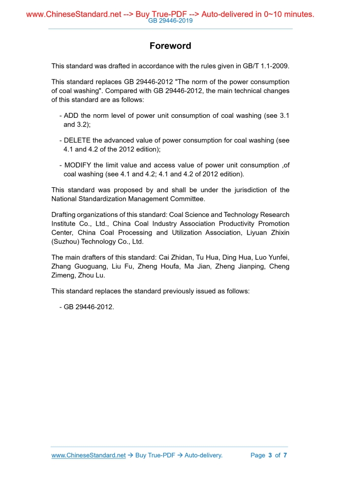 Similar standardsGB 29446-2019: The norm of the power consumption of coal washing---This is an excerpt. Full copy of true-PDF in English version (including equations, symbols, images, flow-chart, tables, and figures etc.), auto-downloaded/delivered in 9 seconds, can be purchased online: https://www.ChineseStandard.net/PDF.aspx/GB29446-2019NATIONAL STANDARD OF THE PEOPLE’S REPUBLIC OF CHINA ICS 27.010 F 10 Replacing GB 29446-2012 The norm of the power consumption of coal washing ISSUED ON: DECEMBER 17, 2019 IMPLEMENTED ON: JULY 01, 2020 Issued by: State Administration for Market Regulation; Standardization Administration of PRC. Table of ContentsForeword ... 3 1 Scope ... 4 2 Terms and definitions ... 4 3 Norm level of power consumption ... 4 4 Technical requirements ... 5 5 Statistical scope and calculation method ... 5 Appendix A (Normative) Conversion factor of coal washing process’s type ... 7ForewordThis standard was drafted in accordance with the rules given in GB/T 1.1-2009. This standard replaces GB 29446-2012 "The norm of the power consumption of coal washing". Compared with GB 29446-2012, the main technical changes of this standard are as follows: - ADD the norm level of power unit consumption of coal washing (see 3.1 and 3.2); - DELETE the advanced value of power consumption for coal washing (see 4.1 and 4.2 of the 2012 edition); - MODIFY the limit value and access value of power unit consumption ,of coal washing (see 4.1 and 4.2; 4.1 and 4.2 of 2012 edition). This standard was proposed by and shall be under the jurisdiction of the National Standardization Management Committee. Drafting organizations of this standard: Coal Science and Technology Research Institute Co., Ltd., China Coal Industry Association Productivity Promotion Center, China Coal Processing and Utilization Association, Liyuan Zhixin (Suzhou) Technology Co., Ltd. The main drafters of this standard: Cai Zhidan, Tu Hua, Ding Hua, Luo Yunfei, Zhang Guoguang, Liu Fu, Zheng Houfa, Ma Jian, Zheng Jianping, Cheng Zimeng, Zhou Lu. This standard replaces the standard previously issued as follows: - GB 29446-2012. The norm of the power consumption of coal washing1 ScopeThis standard specifies the technical requirements, statistical scope and calculation methods for the power unit consumption norm of coal washing in the coal washing process of the coal industry. This standard applies to the calculation and assessment of the power unit consumption of coal washing during the coal washing process in the coal industry, as well as the control of power unit consumption of newly built, rebuilt, expanded enterprises.2 Terms and definitionsThe following terms and definitions apply to this document. 2.1 The power unit consumption of coal washing During the statistical period, the ratio of the product of power consumption of coal washing and the conversion factor of the coal washing process type to the amount of raw coal selected.3 Norm level of power consumption3.1 Norm level of power unit consumption of coking coal washing enterprise Norm level of power unit consumption of coking coal washing enterprise is as shown in Table 1, of which level 1 has the lowest energy consumption. Table 1 -- Norm level of power unit consumption of coking coal washing enterprise Norm level of power unit consumption of coking coal washing Power unit consumption of coal washing, kW • h/t 1 ≤ 5.0 2 ≤ 7.0 3 ≤ 8.5 3.2 Norm level of power unit consumption of thermal coal washing ......Source: Above contents are excerpted from the full-copy PDF -- translated/reviewed by: www.ChineseStandard.net / Wayne Zheng et al. Tips & Frequently Asked Questions:Question 1: How long will the true-PDF of English version of GB 29446-2019 be delivered?Answer: The full copy PDF of English version of GB 29446-2019 can be downloaded in 9 seconds, and it will also be emailed to you in 9 seconds (double mechanisms to ensure the delivery reliably), with PDF-invoice.Question 2: Can I share the purchased PDF of GB 29446-2019_English with my colleagues?Answer: Yes. The purchased PDF of GB 29446-2019_English will be deemed to be sold to your employer/organization who actually paid for it, including your colleagues and your employer's intranet.Question 3: Does the price include tax/VAT?Answer: Yes. Our tax invoice, downloaded/delivered in 9 seconds, includes all tax/VAT and complies with 100+ countries' tax regulations (tax exempted in 100+ countries) -- See Avoidance of Double Taxation Agreements (DTAs): List of DTAs signed between Singapore and 100+ countriesQuestion 4: Do you accept my currency other than USD?Answer: Yes. www.ChineseStandard.us -- GB 29446-2019 -- Click this link and select your country/currency to pay, the exact amount in your currency will be printed on the invoice. Full PDF will also be downloaded/emailed in 9 seconds.Question 5: Should I purchase the latest version GB 29446-2019?Answer: Yes. Unless special scenarios such as technical constraints or academic study, you should always prioritize to purchase the latest version GB 29446-2019 even if the enforcement date is in future. Complying with the latest version means that, by default, it also complies with all the earlier versions, technically.How to buy and download a true PDF of English version of GB 29446-2019?A step-by-step guide to download PDF of GB 29446-2019_EnglishStep 1: Visit website https://www.ChineseStandard.net (Pay in USD), or https://www.ChineseStandard.us (Pay in any currencies such as Euro, KRW, JPY, AUD).Step 2: Search keyword "GB 29446-2019". Step 3: Click "Add to Cart". If multiple PDFs are required, repeat steps 2 and 3 to add up to 12 PDFs to cart. Step 4: Select payment option (Via payment agents Stripe or PayPal). Step 5: Customize Tax Invoice -- Fill up your email etc. Step 6: Click "Checkout". Step 7: Make payment by credit card, PayPal, Google Pay etc. After the payment is completed and in 9 seconds, you will receive 2 emails attached with the purchased PDFs and PDF-invo