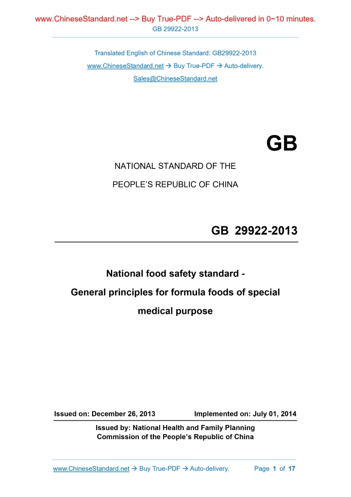 GB 29922-2013: National food safety standard - General principles for formula foods of special medical purpose Delivery: 9 seconds. True-PDF full-copy in English & invoice will be downloaded + auto-delivered via email. See step-by-step procedure Status: Valid