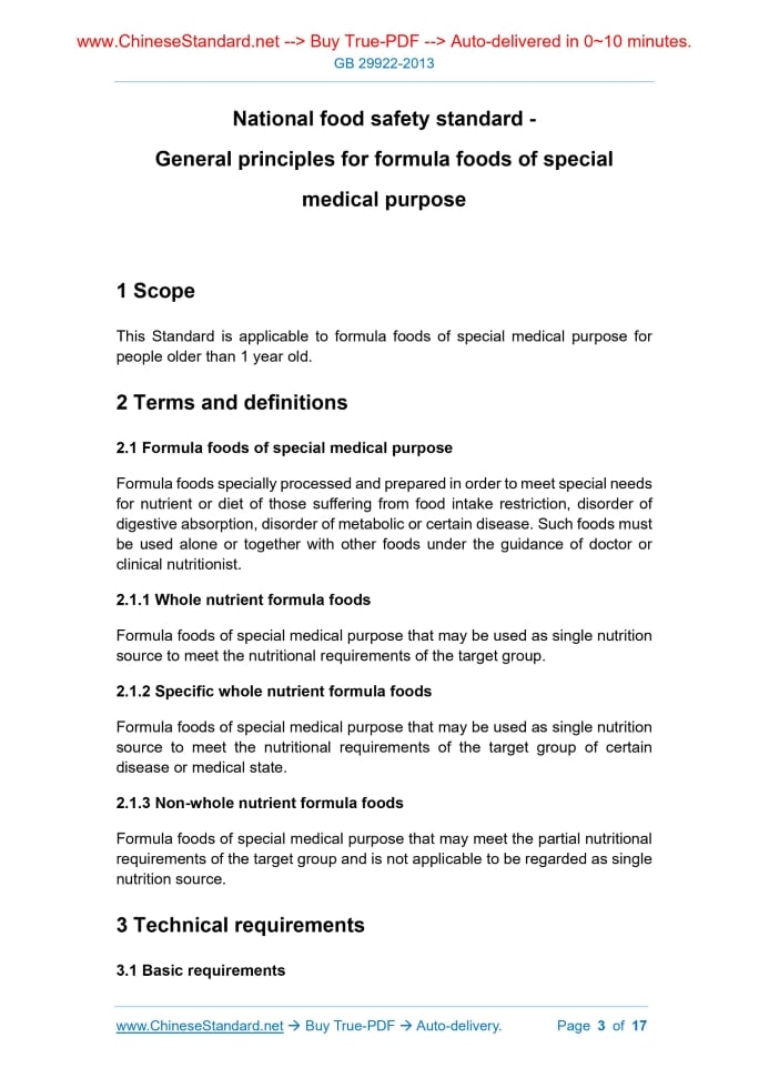 GB 29922-2013: National food safety standard - General principles for formula foods of special medical purpose---This is an excerpt. Full copy of true-PDF in English version (including equations, symbols, images, flow-chart, tables, and figures etc.), auto-downloaded/delivered in 9 seconds, can be purchased online: https://www.ChineseStandard.net/PDF.aspx/GB29922-2013 GB NATIONAL STANDARD OF THE PEOPLE’S REPUBLIC OF CHINA National food safety standard - General principles for formula foods of special medical purpose Issued on. DECEMBER 26, 2013 Implemented on. JULY 01, 2014 Issued by. National Health and Family Planning Commission of the People’s Republic of China Table of Contents1 Scope... 3 2 Terms and definitions... 3 3 Technical requirements... 3 4 Others... 11 Annex A Common specific whole nutrient formula foods... 13 Annex B Applicable amino acid for formula foods of special medical purpose ... 14 National food safety standard - General principles for formula foods of special medical purpose1 ScopeThis Standard is applicable to formula foods of special medical purpose for people older than 1 year old.2 Terms and definitions2.1 Formula foods of special medical purpose Formula foods specially processed and prepared in order to meet special needs for nutrient or diet of those suffering from food intake restriction, disorder of digestive absorption, disorder of metabolic or certain disease. Such foods must be used alone or together with other foods under the guidance of doctor or clinical nutritionist. 2.1.1 Whole nutrient formula foods Formula foods of special medical purpose that may be used as single nutrition source to meet the nutritional requirements of the target group.3 Technical requirements3.1 Basic requirements The formula of formula foods of special medical purpose shall be based on the research results of medicine and/or nutrition, and their safety and clinical application (effectiveness) shall be scientifically verified. 3.2 Material requirements The material adopted in formula foods of special medical purpose shall meet the corresponding standards and/or the relevant requirements, and any substance endangering the health of eaters is forbidden. 3.3 Sensory requirements The color and luster, taste, smell, texture state and reconstituability of formula foods of special medical purpose shall meet the characteristic of corresponding product which is free from the extrinsic impurity in normal sight. 3.4 Nutrient 3.4.1 Whole nutrient formula foods which are applicable to the group of 1 ~ 10 years old. 3.4.1.1 As for whole nutrient formula foods which are applicable to the group of 1 ~ 10 years old, the energy contained shall not be lower than 250 kJ (60 kcal) per 100 mL (liquid or dissolvable product under the instant state) or per 100 g (non-liquid product that can be eat directly). 3.4.2 Whole nutrient formula foods applicable to the group of over 10 years old 3.4.2.1 As for whole nutrient formula foods which are applicable to the group of over 10 years old, the energy contained shall not be lower than 250 kJ (60 kcal) per 100 mL (liquid or dissolvable product under the instant state) or per 100 g (non-liquid product that can be eat directly). 3.4.2.5 Except for those ingredients listed in Table 3, if one or more ingredients listed in Table 4 are added into the products or indicated in the label, the content shall be in accordance with those specified in Table 4. 3.4.4 Non-whole nutrient formula foods The common non-whole nutrient formula foods mainly contain such products as the nutrient module, electrolyte liquid, thickening module, liquid formula and formula for disorder of amino acid catabolism. 3.6 Limit for fungal toxin The limit for fungal toxin shall be in accordance with those specified in Table 8. 3.7 Limit for microorganism The limit for the microorganism in solid formula foods of special medical purpose shall be in accordance with those specified in Table 9, and the microorganism index of the liquid formula foods of special medical purpose shall meet the requirement of commercial sterility, and shall be inspected according to the method specified in GB/T 4789.26. 3.8 Food additive and nutrient supplement 3.8.1 For products which are applicable to the group of 1 ~ 10 years old, the variety and usage amount of food additive may refer to those specified in baby formula foods of GB 2760; for products which are applicable to the group of over 10 years old, the variety and usage amount of food additive may refer to those of the same or closed product specified in GB 2760.4 Others4.1 Label 4.1.1 The product label shall meet those specified in GB 13432.The “per 100 kilojoule (/100 kJ)” shall be added in the content indication of nutrient and optional ingredient. 4.1.2 The formula characteristic or nutrition feature of product shall be described on the label, and the category and applicable group as well as "not applicable to non-target group" shall be indicated. 4.2 Application instruction 4.2.1 The relevant usage, preparation instructions and illustrations and storage conditions of product shall be specified on the label. Where the maximum surface area of package is less than 100 cm2 or the mass of product is less than 100 g, the illustration may not be indicated. 4.3 Packaging The carbon dioxide and/or nitrogen of food grade and/or with purity ≥ 99.9 % may be used as the packaging medium. ......Source: Above contents are excerpted from the full-copy PDF -- translated/reviewed by: www.ChineseStandard.net / Wayne Zheng et al. Tips & Frequently Asked Questions:Question 1: How long will the true-PDF of English version of GB 29922-2013 be delivered?Answer: The full copy PDF of English version of GB 29922-2013 can be downloaded in 9 seconds, and it will also be emailed to you in 9 seconds (double mechanisms to ensure the delivery reliably), with PDF-invoice.Question 2: Can I share the purchased PDF of GB 29922-2013_English with my colleagues?Answer: Yes. The purch