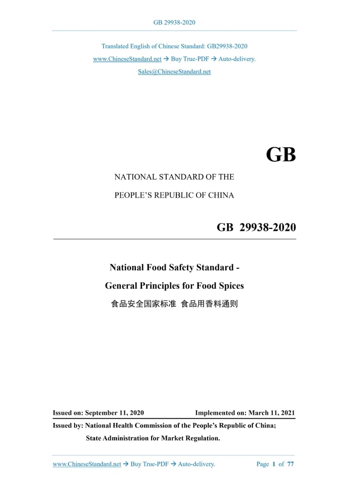 GB 29938-2020: National food safety standard - General Principles for Food Spices Delivery: 9 seconds. True-PDF full-copy in English & invoice will be downloaded + auto-delivered via email. See step-by-step procedure Status: Valid GB 29938: Historical versions