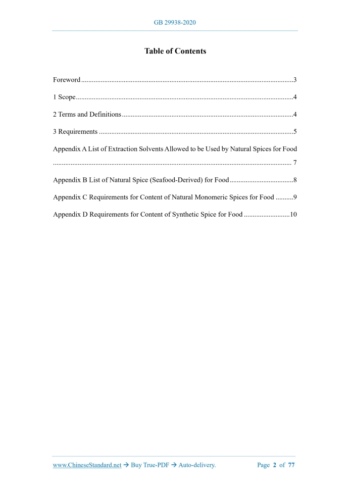 GB 29938-2020: National food safety standard - General Principles for Food Spices---This is an excerpt. Full copy of true-PDF in English version (including equations, symbols, images, flow-chart, tables, and figures etc.), auto-downloaded/delivered in 9 seconds, can be purchased online: https://www.ChineseStandard.net/PDF.aspx/GB29938-2020NATIONAL STANDARD OF THE PEOPLE’S REPUBLIC OF CHINA National Food Safety Standard - General Principles for Food Spices Issued on. SEPTEMBER 11, 2020 Implemented on. MARCH 11, 2021 Issued by. National Health Commission of the People’s Republic of China; State Administration for Market Regulation. Table of ContentsForeword... 3 1 Scope... 4 2 Terms and Definitions... 4 3 Requirements... 5 Appendix A List of Extraction Solvents Allowed to be Used by Natural Spices for Food ... 7 Appendix B List of Natural Spice (Seafood-Derived) for Food... 8 Appendix C Requirements for Content of Natural Monomeric Spices for Food... 9 Appendix D Requirements for Content of Synthetic Spice for Food... 10ForewordThis Standard replaced GB 29938-2013 National Food Safety Standard – General Principles for Food Species. Compared with GB 29938-2013, the major changes of this Standard are as follows. ---Modified the relevant content of the text. According to GB/T 21171-2018 Technical Terms of Fragrances and Flavor, "natural flavor compound for food" is unified to replace "natural synthetic spice for food" in the original text; --- Revise Appendix C "Requirements for the Content of Natural Monomeric Spice for Food". revise Table C.1 Detection Method of Oleic Acid in the Content Requirements of Natural Monomeric Spice for Food; --- Revise Appendix D "Requirements for the Content of Synthetic Spice for Food". a) According to the relevant announcement of the health administrative department, delete the existing food spices of national food safety standards; b) According to the characteristics of food spices, supplement suitable detection methods, such as GB/T 27579-2011 Essential Oils - Analysis by High Performance Liquid Chromatography - General Method, etc.; c) Refer to the information of JECFA to clarify the isomers, minor components, etc. of individual spices; d) Revise the content requirements of individual food spices. National Food Safety Standard - General Principles for Food Spices1 ScopeThis Standard applies to the food spices that are allowed to be used in GB 2760 and have no separate quality specification standards or relevant announcement specifications.2 Terms and DefinitionsThe following terms and definitions are applicable to this Document. 2.1 Food spices Substances that are added to food products to create, modify, or enhance flavor. Food spices include edible natural flavor substances, edible natural flavor compounds, synthetic spices for food, heat-processed spices for food, and smoked edible spices. 2.2 Natural spice for food Spicy preparation or spicy substance of specific chemical structure obtained from animals and plants through the process of physical method, enzyme method or microbiological method. It includes natural compound splice for food and natural monomeric spice for food. 2.3 Natural spice compound for food Spicy preparation (composed of multiple component/multicomponent) obtained from animals and plants through the process of physical method, enzyme method or microbiological method. The animals and plants as source materials may be either crude or processed through traditional food preparation procedure, 2.4 Natural monomeric spice for food Spicy substance with specific chemical structure obtained from animals and plants through the process of physical method, enzyme method or microbiological method. 2.5 Synthetic spice for food Spicy substances with specific chemical structure formed through chemosynthesis.3 Requirements3.1 General requirements of natural spice for food 3.1.1 During the production and processing of natural spice for food, if it is necessary to use an extraction solvent due to technological necessity, the amount of used solvent shall be reduced as much as possible under the premise of achieving the intended purpose. See Table A.1 in Appendix A for the list of extraction solvents allowed to be used by natural spices for food. 3.1.2 See Table B.1 in Appendix B for the list of seafood-derived natural spices for food. 3.1.4 The content of natural monomeric spice for food shall be in accordance with the provisions of Table C.1 in Appendix C. The detection method shall be in accordance with the provisions of GB/T 11539 or GB/T 11538.If special requirements are indicated, the detection shall be carried out in accordance with the special requirements. 3.1.5 Control heavy metals and arsenic in natural spice for food according to the safety limit values in Table 1. 3.2 Requirements for synthetic spice for food The content of synthetic spice for food shall be in accordance with the provisions of Table D.1 in Appendix D.Appendix AList of Extraction Solvents Allowed to be Used by Natural Spices for Food The list of extraction solvents allowed to be used by natural spices for food is shown in Table A.1.Appendix BList of Natural Spice (Seafood-Derived) for Food The list of seafood-derived natural spice for food is shown in Table B.1.Appendix CRequirements for Content of Natural Monomeric Spices for Food The requirements for content of natural monomeric spices for food is shown in Table C.1.Appendix DRequirements for Content of Synthetic Spice for Food The requirements for content of synthetic spice for food is shown in Table D.1. ......Source: Above contents are excerpted from the full-copy PDF -- translated/reviewed by: www.ChineseStandard.net / Wayne Zheng et al. Tips & Frequently Asked Questions:Question 1: How long will the true-PDF of English version of GB 29938-2020 be delivered?Answer: The full copy PDF of English version of GB 29938-2020 can be downloaded in 9 seconds, and it will also be emailed to you in 9 seconds (double mechanis