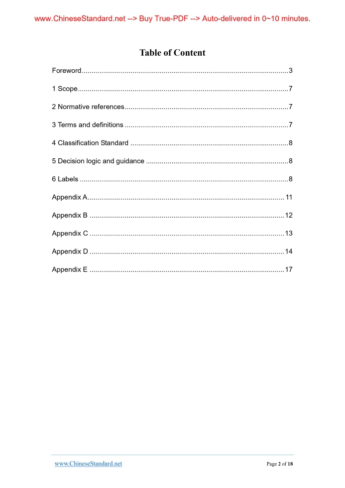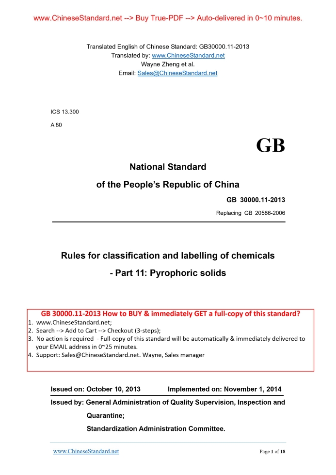 Similar standardsGB 30000.11-2013: Rules for classification and labelling of chemicals -- Part 11: Pyrophoric solids---This is an excerpt. Full copy of true-PDF in English version (including equations, symbols, images, flow-chart, tables, and figures etc.), auto-downloaded/delivered in 9 seconds, can be purchased online: https://www.ChineseStandard.net/PDF.aspx/GB30000.11-2013 ICS 13.300 A 80 GB National Standard of the People’s Republic of China Replacing GB 20586-2006 Rules for classification and labelling of chemicals - Part 11.Pyrophoric solids Issued on: OCTOBER 10, 2013 Implemented on: NOVEMBER 1, 2014 Issued by. General Administration of Quality Supervision, Inspection and Quarantine; Standardization Administration Committee. Table of Content Foreword... 3 1 Scope... 7 2 Normative references... 7 3 Terms and definitions... 7 4 Classification Standard... 8 5 Decision logic and guidance... 8 6 Labels... 8 Appendix A... 11 Appendix B... 12 Appendix C... 13 Appendix D... 14 Appendix E... 17 ForewordChapter 4 and Chapter 6 of this part are mandatory. The rest are recommended. The expected structure and the national standards to be replaced are as follows. Part 1.Rules for classification and labelling of chemicals. Part 1.General rules (replacing GB 13690-2009); Part 2.Rules for classification and labelling of chemicals. Part 2.Explosives (replacing GB 20576-2006); Part 3.Rules for classification and labelling of chemicals. Part 3.Flammable gases (replacing GB 20577-2006); Part 4.Rules for classification and labelling of chemicals. Part 4.Aerosols (replacing GB 20578-2006); Part 5.Rules for classification and labelling of chemicals. Part 5.Oxidizing gases (replacing GB 20579-2006); Part 6.Rules for classification and labelling of chemicals. Part 6.Gases under pressure (replacing GB 20580-2006); Part 7.Rules for classification and labelling of chemicals. Part 7.Flammable liquids (replacing GB 20581-2006); Part 8.Rules for classification and labelling of chemicals. Part 8.Flammable solids (replacing GB 20582-2006). Part 9.Rules for classification and labelling of chemicals. Part 9. Self-reactive substances and mixtures (replacing GB 20583-2006); Part 10.Rules for classification and labelling of chemicals. Part 10. Pyrophoric liquids (replacing GB 20585-2006); Part 11.Rules for classification and labelling of chemicals. Part 11. Pyrophoric solids (replacing GB 20586-2006); Part 12.Rules for classification and labelling of chemicals. Part 12. Self-heating substances and mixtures (replacing GB 20584-2006); Part 13.Rules for classification and labelling of chemicals. Part 13. Substances and mixtures which, in contact with water, emit flammable gases (replacing GB 20587-2006); Part 14.Rules for classification and labelling of chemicals. Part 14. Oxidizing liquids (replacing GB 20589-2006); Part 15.Rules for classification and labelling of chemicals. Part 15. Oxidizing solids (replacing GB 20590-2006); Part 16.Rules for classification and labelling of chemicals. Part 16.Organic peroxides (replacing GB 20591-2006); Part 17.Rules for classification and labelling of chemicals. Part 17. Corrosive to metals (replacing GB 20588-2006). Part 18.Rules for classification and labelling of chemicals. Part 18.Acute toxicity (replacing GB 20592-2006); Part 19.Rules for classification and labelling of chemicals. Part 19.Skin corrosion/irritation (replacing GB 20593-2006); Part 20.Rules for classification and labelling of chemicals. Part 20.Serious eye damage/eye irritation (replacing GB 20594 a 2006); Part 21.Rules for classification and labelling of chemicals. Part 21. Respiratory or skin sensitization (replacing GB 20595-2006); Part 22.Rules for classification and labelling of chemicals. Part 22.Germ cell mutagenicity (replacing GB 20596-2006); Part 23.Rules for classification and labelling of chemicals. Part 23. Carcinogenicity (replacing GB 20597-2006); Part 24.Rules for classification and labelling of chemicals. Part 24. Reproductive toxicity (replacing GB 20598-2006); Part 25.Rules for classification and labelling of chemicals. Part 25.Specific target organ toxicity. Single exposure (replacing GB 20599-2006); Part 26.Rules for classification and labelling of chemicals. Part 26.Specific target organ toxicity. Repeated exposure (replacing GB 20601-2006); Part 27.Rules for classification and labelling of chemicals. Part 27. Aspiration hazard; Part 28.Rules for classification and labelling of chemicals. Part 28. Hazardous to the aquatic environment (replacing GB 20602-2006); Part 29.Rules for classification and labelling of chemicals. Part 29. Hazardous to the ozone layer; Part 30.Rules for classification and labelling of chemicals. Part 29.Work safety warning signs. This part is part 11 of GB 30000. This part was drafted in accordance with the rules given in GB/T 1.1-2009. This part shall replace GB 20586-2006 “Rules for classification and labelling of chemicals Pyrophoric solids”. This part is consistent with the relevant technical content of the United Nations "Globally Harmonized System of Classification and Labelling of Chemicals, GHS" (Fourth revised edition). Compared with GB 20586-2006, the major technical changes are as follows. - MODIFY the standard prime. Chinese name is changed to “Rules for classification and labelling of chemicals. Part 11.Pyrophoric solids”. English name is changed to “Rules for classification and labelling of chemicals. Part 11. Pyrophoric solids”; - MODIFY the content of Chapter 1 “Scope”. The "warning label" is changed to "label". DELETE "precautionary statements"; - MODIFY the introductory phrase in Chapter 2 "Normative references". And ADD "United Nation, Globally Harmonized System of Classification and Labelling of Chemicals, GHS (Fourth revised edition)" as a reference document; - ADD introductory phrase in Chapter 3 "Terms and definitions". - The Figure 1 "decision logic diagram" and “guidance” in Chapter 5 are as informative Appendix A; - DELETE