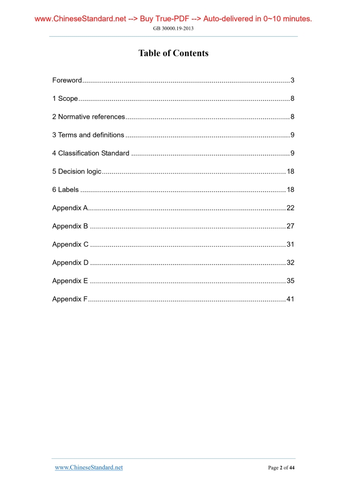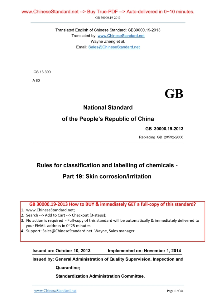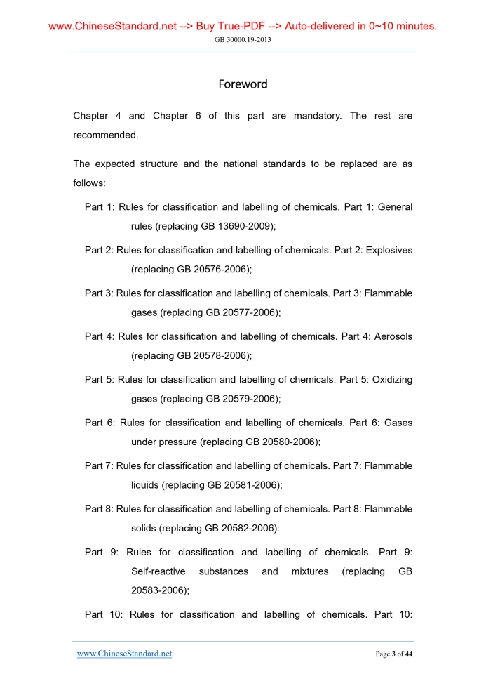 Similar standardsGB 30000.19-2013: Rules for classification and labelling of chemicals -- Part 19: Skin corrosion/irritation---This is an excerpt. Full copy of true-PDF in English version (including equations, symbols, images, flow-chart, tables, and figures etc.), auto-downloaded/delivered in 9 seconds, can be purchased online: https://www.ChineseStandard.net/PDF.aspx/GB30000.19-2013 ICS 13.300 A 80 GB National Standard of the People’s Republic of China Replacing GB 20592-2006 Rules for classification and labelling of chemicals - Part 19.Skin corrosion/irritation Issued on: OCTOBER 10, 2013 Implemented on: NOVEMBER 1, 2014 Issued by. General Administration of Quality Supervision, Inspection and Quarantine; Standardization Administration Committee. Table of ContentsForeword... 3 1 Scope... 8 2 Normative references... 8 3 Terms and definitions... 9 4 Classification Standard... 9 5 Decision logic... 18 6 Labels... 18 Appendix A... 22 Appendix B... 27 Appendix C... 31 Appendix D... 32 Appendix E... 35 Appendix F... 41ForewordChapter 4 and Chapter 6 of this part are mandatory. The rest are recommended. The expected structure and the national standards to be replaced are as follows. Part 1.Rules for classification and labelling of chemicals. Part 1.General rules (replacing GB 13690-2009); Part 2.Rules for classification and labelling of chemicals. Part 2.Explosives (replacing GB 20576-2006); Part 3.Rules for classification and labelling of chemicals. Part 3.Flammable gases (replacing GB 20577-2006); Part 4.Rules for classification and labelling of chemicals. Part 4.Aerosols (replacing GB 20578-2006); Part 5.Rules for classification and labelling of chemicals. Part 5.Oxidizing gases (replacing GB 20579-2006); Part 6.Rules for classification and labelling of chemicals. Part 6.Gases under pressure (replacing GB 20580-2006); Part 7.Rules for classification and labelling of chemicals. Part 7.Flammable liquids (replacing GB 20581-2006); Part 8.Rules for classification and labelling of chemicals. Part 8.Flammable solids (replacing GB 20582-2006). Part 9.Rules for classification and labelling of chemicals. Part 9. Self-reactive substances and mixtures (replacing GB 20583-2006); Part 10.Rules for classification and labelling of chemicals. Part 10. Pyrophoric liquids (replacing GB 20585-2006); Part 11.Rules for classification and labelling of chemicals. Part 11. Pyrophoric solids (replacing GB 20586-2006); Part 12.Rules for classification and labelling of chemicals. Part 12. Self-heating substances and mixtures (replacing GB 20584-2006); Part 13.Rules for classification and labelling of chemicals. Part 13. Substances and mixtures which, in contact with water, emit flammable gases (replacing GB 20587-2006); Part 14.Rules for classification and labelling of chemicals. Part 14. Oxidizing liquids (replacing GB 20589-2006); Part 15.Rules for classification and labelling of chemicals. Part 15. Oxidizing solids (replacing GB 20590-2006); Part 16.Rules for classification and labelling of chemicals. Part 16.Organic peroxides (replacing GB 20591-2006); Part 17.Rules for classification and labelling of chemicals. Part 17. Corrosive to metals (replacing GB 20588-2006). Part 18.Rules for classification and labelling of chemicals. Part 18.Acute toxicity (replacing GB 20592-2006); Part 19.Rules for classification and labelling of chemicals. Part 19.Skin corrosion/irritation (replacing GB 20593-2006); Part 20.Rules for classification and labelling of chemicals. Part 20.Serious eye damage/eye irritation (replacing GB 20594 a 2006); Part 21.Rules for classification and labelling of chemicals. Part 21. Respiratory or skin sensitization (replacing GB 20595-2006); Part 22.Rules for classification and labelling of chemicals. Part 22.Germ cell mutagenicity (replacing GB 20596-2006); Part 23.Rules for classification and labelling of chemicals. Part 23. Carcinogenicity (replacing GB 20597-2006); Part 24.Rules for classification and labelling of chemicals. Part 24. Reproductive toxicity (replacing GB 20598-2006); Part 25.Rules for classification and labelling of chemicals. Part 25.Specific target organ toxicity. Single exposure (replacing GB 20599-2006); Part 26.Rules for classification and labelling of chemicals. Part 26.Specific target organ toxicity. Repeated exposure (replacing GB 20601-2006); Part 27.Rules for classification and labelling of chemicals. Part 27. Aspiration hazard; Part 28.Rules for classification and labelling of chemicals. Part 28. Hazardous to the aquatic environment (replacing GB 20602-2006); Part 29.Rules for classification and labelling of chemicals. Part 29. Hazardous to the ozone layer; Part 30.Rules for classification and labelling of chemicals. Part 29.Work safety warning signs. This part is part 19 of GB 30000. This part was drafted in accordance with the rules given in GB/T 1.1-2009. This part shall replace GB 20593-2006. This part is consistent with the relevant technical content of the United Nations "Globally Harmonized System of Classification and Labelling of Chemicals, GHS” (Fourth revised edition). Compared with GB 20593-2006, the major technical changes are as follows. - MODIFY the standard name. Chinese name is changed to “Rules for classification and labelling of chemicals. Part 19.Skin corrosion/irritation”. English name is changed to “Rules for classification and labelling of chemicals. Part 19.Skin corrosion/irritation”; - MODIFY the content of Chapter 1 “Scope”. The "warning label" is changed to "label". DELETE "precautionary statements"; - MODIFY the introductory phrase in Chapter 2 "Normative references". - MODIFY some sentences of “Classification Standard of Substance” in Chapter 4, and the Figure 1 is as Appendix A; - MODIFY some sentences of “Decision Process ” in Chapter 5, and the Figure 2 and Figure 3 are as Appendix B; - DELETE the original Chapter 7.Table 6 in original Chapter 7 is modified as normative Appendix C according to the United Nations “