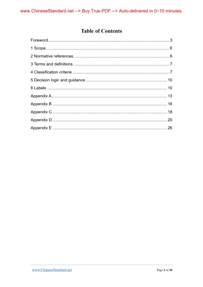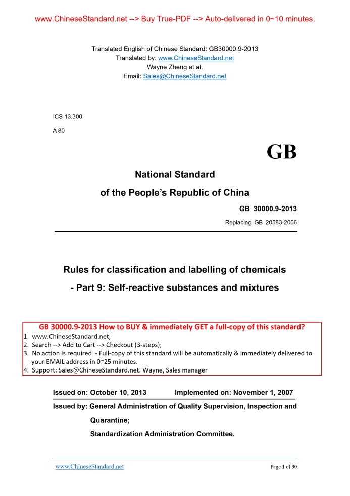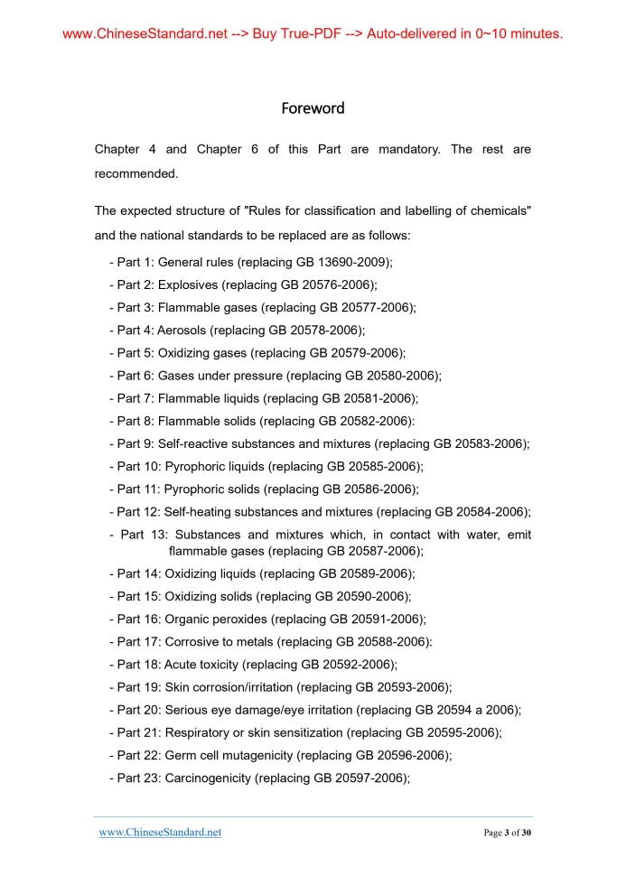 Similar standardsGB 30000.9-2013: Rules for classification and labelling of chemicals -- Part 9: Self-reactive substances and mixtures---This is an excerpt. Full copy of true-PDF in English version (including equations, symbols, images, flow-chart, tables, and figures etc.), auto-downloaded/delivered in 9 seconds, can be purchased online: https://www.ChineseStandard.net/PDF.aspx/GB30000.9-2013 ICS 13.300 A 80 GB National Standard of the People’s Republic of China Replacing GB 20583-2006 Rules for classification and labelling of chemicals - Part 9. Self-reactive substances and mixtures Issued on: OCTOBER 10, 2013 Implemented on: NOVEMBER 1, 2007 Issued by. General Administration of Quality Supervision, Inspection and Quarantine; Standardization Administration Committee. Table of ContentsForeword ... 3 1 Scope ... 6 2 Normative references ... 6 3 Terms and definitions ... 7 4 Classification criteria ... 7 5 Decision logic and guidance ... 10 6 Labels ... 10 Appendix A ... 13 Appendix B ... 16 Appendix C ... 18 Appendix D ... 20 Appendix E ... 26ForewordChapter 4 and Chapter 6 of this Part are mandatory. The rest are recommended. The expected structure of "Rules for classification and labelling of chemicals" and the national standards to be replaced are as follows. - Part 1. General rules (replacing GB 13690-2009); - Part 2. Explosives (replacing GB 20576-2006); - Part 3. Flammable gases (replacing GB 20577-2006); - Part 4. Aerosols (replacing GB 20578-2006); - Part 5. Oxidizing gases (replacing GB 20579-2006); - Part 6. Gases under pressure (replacing GB 20580-2006); - Part 7. Flammable liquids (replacing GB 20581-2006); - Part 8. Flammable solids (replacing GB 20582-2006). - Part 9. Self-reactive substances and mixtures (replacing GB 20583-2006); - Part 10. Pyrophoric liquids (replacing GB 20585-2006); - Part 11. Pyrophoric solids (replacing GB 20586-2006); - Part 12. Self-heating substances and mixtures (replacing GB 20584-2006); - Part 13. Substances and mixtures which, in contact with water, emit flammable gases (replacing GB 20587-2006); - Part 14. Oxidizing liquids (replacing GB 20589-2006); - Part 15. Oxidizing solids (replacing GB 20590-2006); - Part 16. Organic peroxides (replacing GB 20591-2006); - Part 17. Corrosive to metals (replacing GB 20588-2006). - Part 18. Acute toxicity (replacing GB 20592-2006); - Part 19. Skin corrosion/irritation (replacing GB 20593-2006); - Part 20. Serious eye damage/eye irritation (replacing GB 20594 a 2006); - Part 21. Respiratory or skin sensitization (replacing GB 20595-2006); - Part 22. Germ cell mutagenicity (replacing GB 20596-2006); - Part 23. Carcinogenicity (replacing GB 20597-2006); - Part 24. Reproductive toxicity (replacing GB 20598-2006); - Part 25. Specific target organ toxicity. Single exposure (replacing GB 20599-2006); - Part 26. Specific target organ toxicity. Repeated exposure (replacing GB 20601-2006); - Part 27. Aspiration hazard; - Part 28. Hazardous to the aquatic environment (replacing GB 20602-2006); - Part 29. Hazardous to the ozone layer; - Part 30. Work safety warning signs. This Part is Part 9 of GB 30000. This Part was drafted in accordance with the rules given in GB/T 1.1-2009. This Part shall replace GB 20583-2006 "Safety rules for classification, precautionary labelling and precautionary statements of chemicals - Self-reactive substances and mixtures ". This Part is consistent with the relevant technical content of the United Nations "Globally Harmonized System of Classification and Labelling of Chemicals, GHS" (Fourth revised edition). Compared with GB 20583-2006, the major technical changes are as follows. - MODIFY the standard name. Chinese name is changed to "Rules for classification and labelling of chemicals. Part 9. Self-reactive substances and mixtures". English name is changed to "Rules for classification and labelling of chemicals. Part 9. Self-reactive substances and mixtures"; - MODIFY the content of Chapter 1 "Scope". The "warning label" is changed to "label". DELETE "precautionary statements"; - MODIFY the introductory phrase in Chapter 2 "Normative references". And ADD "United Nation, Globally Harmonized System of Classification and Labelling of Chemicals, GHS (Fourth revised edition)" as a reference document; - ADD introductory phrase in Chapter 3 "Terms and definitions". - The Figure 1 "decision logic diagram" and “guidance” in Chapter 5 are as informative Appendix A; - DELETE the original Chapter 7. Table 3 in original Chapter 7 is modified as normative Appendix B according to the United Nations “Globally Harmonized System of Classification and Labelling of Chemicals, GHS” (Fourth revised edition); - MODIFY and INTEGRATE the original Chapters 6, 7 and 8 as Chapter 6 according to the United Nations “Globally Harmonized System of Classification and Labelling of Chemicals, GHS” (Fourth revised edition). Original Table 2 is modified as normative Appendix C; - DELETE the original Chapter 8. The relevant contents "hazard statements" and "precautionary statements" are as informative Appendix D; - ADD informative Appendix E "Label examples". This Part was proposed by and shall be centralized by National Standardization Technical Committee on Dangerous Chemicals Management (SAC / TC 251). Drafting organizations of this Part. China National Chemical Economic and Technical Development Center, Shanghai Research Institute of Chemical Industry, China National Chemical Information Center, Pony Testing International Group, and Huafeng Group Co.,Ltd. The main drafters of this Part. Wang Xiaobing, Fan Bin, Liang Jin, Zhu Tao, Song Wei, Yang Ting, Guan Shitai, Xiang Chaoli, Cao Mengran, Gao Shuxia, and Wen Tao. The previous version replaced by this Part is. - GB 20583-2006. Rules for classification and labelling of chemicals - Part 9. Self-reactive substances and mixtures1 ScopeThis Part of GB 30000 specifies the terms and definitions, classification criteria, decision logic and guidance, and labels of 