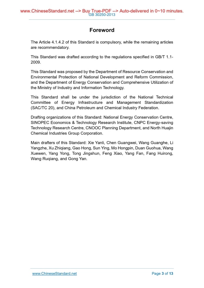 GB 30250-2013: The norm of energy consumption per unit product of ethylene plant---This is an excerpt. Full copy of true-PDF in English version (including equations, symbols, images, flow-chart, tables, and figures etc.), auto-downloaded/delivered in 9 seconds, can be purchased online: https://www.ChineseStandard.net/PDF.aspx/GB30250-2013GB ICS 27.010 F 01 ATIONAL STANDARD OF THE PEOPLE’S REPUBLIC OF CHINA The norm of energy consumption per unit product of ethylene plant Issued on: DECEMBER 18, 2013 Implemented on: SEPTEMBER 1, 2014 Issued by. General Administration of Quality Supervision, Inspection and Quarantine of the People’s Republic of China; Committee of Standardization Administration of the People’s Republic of China. Table of ContentsForeword ... 3 1 Scope ... 4 2 Normative references ... 4 3 Terms and definitions ... 4 4 Technical requirements ... 5 5 Statistical range and calculation method ... 6 6 Energy-saving management and measures ... 8 Appendix A ... 10 Appendix B ... 11 Appendix C ... 13ForewordThe Article 4.1.4.2 of this Standard is compulsory, while the remaining articles are recommendatory. This Standard was drafted according to the regulations specified in GB/T 1.1- 2009. This Standard was proposed by the Department of Resource Conservation and Environmental Protection of National Development and Reform Commission, and the Department of Energy Conservation and Comprehensive Utilization of the Ministry of Industry and Information Technology. This Standard shall be under the jurisdiction of the National Technical Committee of Energy Infrastructure and Management Standardization (SAC/TC 20), and China Petroleum and Chemical Industry Federation. Drafting organizations of this Standard. National Energy Conservation Centre, SINOPEC Economics & Technology Research Institute, CNPC Energy-saving Technology Research Centre, CNOOC Planning Department, and North Huajin Chemical Industries Group Corporation. Main drafters of this Standard. Xie Yanli, Chen Guangwei, Wang Guanghe, Li Yangzhe, Xu Zhiqiang, Gao Hong, Sun Ying, Mo Hongpin, Duan Guohua, Wang Xuewen, Yang Yong, Tong Jingshun, Feng Xiao, Yang Fan, Fang Huirong, Wang Ruqiang, and Gong Yan. The norm of energy consumption per unit product of ethylene plant1 ScopeThis Standard specifies the technical requirements, statistical range, calculation method, energy-saving management and measures of the norm of energy consumption per unit of product of ethylene plant. This Standard applies to the calculation and evaluation of the energy consumption for the ethylene plant that uses petroleum hydrocarbons as the materials for producing ethylene, propylene, mixed C4, pyrolysis gasoline, hydrogen, and other products after being processed by steam pyrolysis, quenching, compression and separation, and the energy consumption control of new projects.2 Normative referencesThe following documents are essential for the application of this document. For dated references, only the versions with the dates indicated are applicable to this document. For undated references, only the latest versions (including all the amendments) are applicable to this document. GB 17167 General principle for equipping and managing of the measuring instrument of energy in organization of energy using GB/T 12723 General principles for establishing allowance of energy consumption per unit throughput GB/T 23331 Energy management systems - Requirements3 Terms and definitionsThe following terms and definitions defined according to the GB/T 12723 are applicable to this document. 3.1 Energy consumption for ethylene plant It refers to the sum of the physical quantity of various fuels, steam, electricity and energy-consuming working medium actually consumed in the manufacturing process of ethylene plant, within the statistical reporting period, 4.3 Advanced value of energy consumption per unit product of ethylene plant The advanced value of energy consumption per unit product of ethylene plant shall meet the requirements for the advanced value of energy consumption for unit output of ethylene or energy consumption for unit output of ethylene and propylene, specified in Table 3. Table 3 Advanced value of energy consumption per unit product of ethylene plant Type Advanced Value of Energy Consumption for Unit Output of Ethylene Advanced Value of Energy Consumption for Unit Output of Ethylene and Propylene Ethylene plant ≤ 610kgoe/t ≤ 400kgoe/t5 Statistical range and calculation method5.1 Statistical range The statistical boundary of energy consumption for ethylene plant includes various units, such as the zones for material desulfurization and dearsenication, cracking furnaces, quenching, compression and separation, the flare gas recovery compressor, the storage tanks of ethylene products, etc.; it does not include the gasoline hydrogenation unit, auxiliary boilers, main torch, spent caustic processing unit, storage tanks of other products, circulating water field, air compression station, etc. See Appendix A for the sketch map for the statistical boundary of energy consumption for ethylene plant. 5.2 Statistical requirements 5.2.1 The energy consumption statistics for ethylene plant includes fuels, electricity, steam and energy-consuming working medium. The energy- consuming working medium includes fresh water, circulating water, demineralized water, deoxygenated water, condensation water, nitrogen, and compressed air. 5.2.2 The fuels consumed by ethylene plant refer to the sum of various fuels consumed in the statistical boundary. 5.2.3 The energy consumption includes the energies consumed in the process of manufacturing, plant operation and shutdown, overhaul and maintenance; it does not include the energies consumed for basic infrastructure. 5.2.4 The magnitudes of output energies shall be consistent with those of output and input energies obtained from the statistical calculation. The output energies that have not been consumed yet shall not be used for energy 