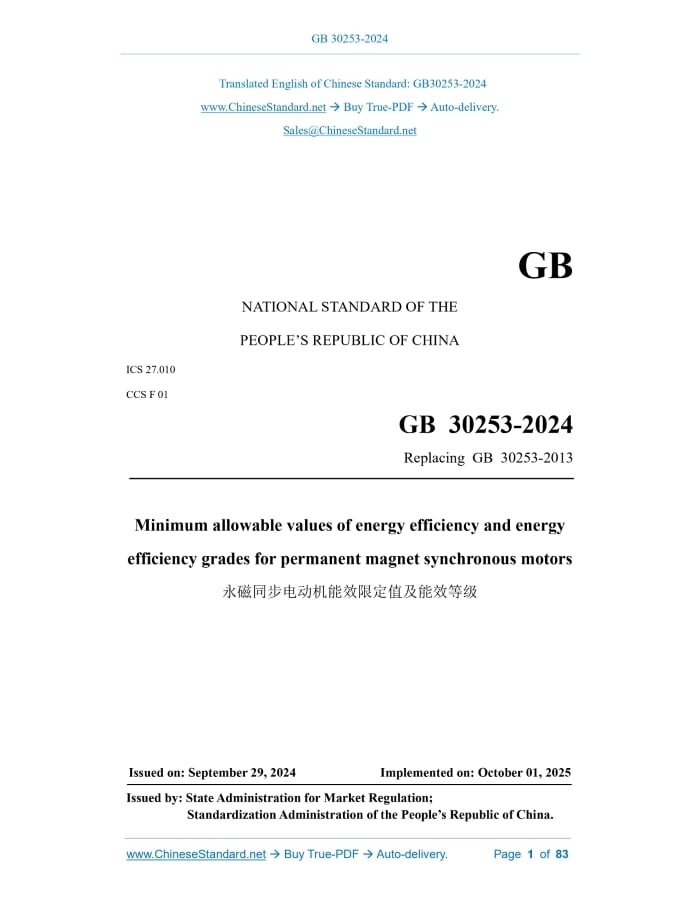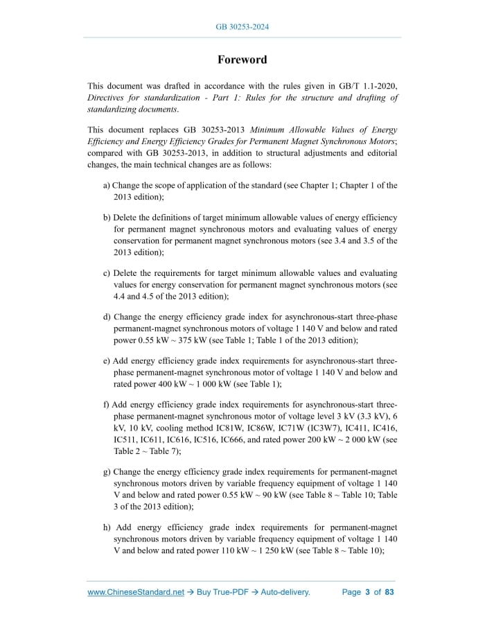GB 30253-2024: Minimum allowable values of energy efficiency and energy efficiency grades for permanent magnet synchronous motors---This is an excerpt. Full copy of true-PDF in English version (including equations, symbols, images, flow-chart, tables, and figures etc.), auto-downloaded/delivered in 9 seconds, can be purchased online: https://www.ChineseStandard.net/PDF.aspx/GB30253-2024 GB NATIONAL STANDARD OF THE PEOPLE’S REPUBLIC OF CHINA ICS 27.010 CCS F 01 Replacing GB 30253-2013 Minimum allowable values of energy efficiency and energy efficiency grades for permanent magnet synchronous motors Issued on. SEPTEMBER 29, 2024 Implemented on. OCTOBER 01, 2025 Issued by. State Administration for Market Regulation; Standardization Administration of the People’s Republic of China. Table of ContentsForeword... 3 1 Scope... 5 2 Normative references... 5 3 Terms and definitions... 6 4 Energy efficiency grades... 6 5 Technical requirements... 7 6 Test methods... 8ForewordThis document was drafted in accordance with the rules given in GB/T 1.1-2020, Directives for standardization - Part 1.Rules for the structure and drafting of standardizing documents. This document replaces GB 30253-2013 Minimum Allowable Values of Energy Efficiency and Energy Efficiency Grades for Permanent Magnet Synchronous Motors; compared with GB 30253-2013, in addition to structural adjustments and editorial changes, the main technical changes are as follows. a) Change the scope of application of the standard (see Chapter 1; Chapter 1 of the 2013 edition); b) Delete the definitions of target minimum allowable values of energy efficiency for permanent magnet synchronous motors and evaluating values of energy conservation for permanent magnet synchronous motors (see 3.4 and 3.5 of the 2013 edition); c) Delete the requirements for target minimum allowable values and evaluating values for energy conservation for permanent magnet synchronous motors (see 4.4 and 4.5 of the 2013 edition); d) Change the energy efficiency grade index for asynchronous-start three-phase permanent-magnet synchronous motors of voltage 1 140 V and below and rated power 0.55 kW ~ 375 kW (see Table 1; Table 1 of the 2013 edition); e) Add energy efficiency grade index requirements for asynchronous-start three- phase permanent-magnet synchronous motor of voltage 1 140 V and below and rated power 400 kW ~ 1 000 kW (see Table 1); f) Add energy efficiency grade index requirements for asynchronous-start three- phase permanent-magnet synchronous motor of voltage level 3 kV (3.3 kV), 6 kV, 10 kV, cooling method IC81W, IC86W, IC71W (IC3W7), IC411, IC416, IC511, IC611, IC616, IC516, IC666, and rated power 200 kW ~ 2 000 kW (see Table 2 ~ Table 7); g) Change the energy efficiency grade index requirements for permanent-magnet synchronous motors driven by variable frequency equipment of voltage 1 140 V and below and rated power 0.55 kW ~ 90 kW (see Table 8 ~ Table 10; Table 3 of the 2013 edition); h) Add energy efficiency grade index requirements for permanent-magnet synchronous motors driven by variable frequency equipment of voltage 1 140 V and below and rated power 110 kW ~ 1 250 kW (see Table 8 ~ Table 10); i) Add energy efficiency grade index requirements for permanent-magnet synchronous motors driven by variable frequency equipment of voltage level 3 kV (3.3 kV), 6 kV, 10 kV, cooling method IC81W, IC86W, IC71W (IC3W7), IC411, IC416, IC511, IC611, IC616, IC516, IC666, and rated power 200 kW ~ 2 000 kW (see Table 11 ~ Table 28); j) Change the requirements for minimum allowable values of energy efficiency for permanent magnet synchronous motors for elevators (see Table 29; Table 2 of the 2013 edition); k) Change the test method for asynchronous-start three-phase permanent-magnet synchronous motors [see Chapter 6a); Chapter 5 of the 2013 edition]; l) Add the test method for permanent-magnet synchronous motors driven by variable frequency equipment [see Chapter 6 b)]. Please note that some of the contents of this document may involve patents. The issuing organization of this document is not responsible for identifying patents. This document shall be under the jurisdiction of Standardization Administration of the People’s Republic of China. This document was first published in 2013, and this is the first revision. Minimum allowable values of energy efficiency and energy efficiency grades for permanent magnet synchronous motors1 ScopeThis document specifies the energy efficiency grades, technical requirements and test methods for permanent magnet synchronous motors. This document is applicable to permanent magnet synchronous motors for general or explosion-proof purposes in continuous working mode, including the following scope. a) Asynchronous-start three-phase permanent-magnet synchronous motor powered by 50 Hz three-phase AC power supply, of voltage level 1 140 V and below, rated power 0.55 kW ~ 1 000 kW, and pole number 2 poles ~ 16 poles; b) Asynchronous-start three-phase permanent-magnet synchronous motor powered by 50 Hz three-phase AC power supply, of voltage 3 kV (3.3 kV), 6 kV and 10 kV, cooling method IC81W, IC86W, IC71W (IC3W7), IC411, IC416, IC511, IC611, IC616, IC516 and IC666, rated power 200 kW ~ 2 000 kW and pole number 4 poles ~ 12 poles; c) Permanent-magnet synchronous motor driven by variable frequency equipment powered by variable frequency power supply, of voltage 1 140 V and below, rated power 0.55 kW ~ 1 250 kW, and rated speed 45 r/min ~ 6 000 r/min; d) Permanent-magnet synchronous motor driven by variable frequency equipment powered by variable frequency power supply, of voltage 3 kV (3.3 kV) and 6 kV, 10 kV, cooling method IC81W, IC86W, IC71W (IC3W7), IC411, IC416, IC511, IC611, IC616, IC516, IC666, rated power 200 kW and above, and rated speed 45 r/min ~ 3 000 r/min; e) Permanent magnet synchronous motor for elevators powered by variable frequency power supply, of voltage 1 140 V and below, and rated power 0.55 kW ~ 110 kW.2 Normative 