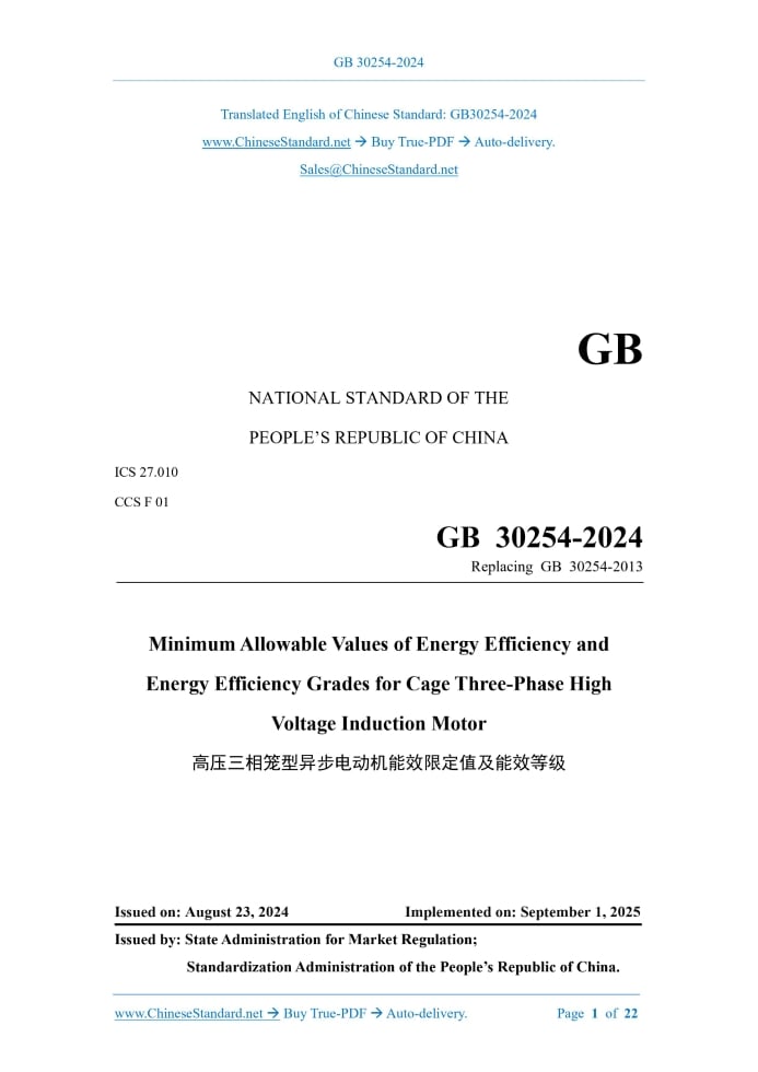 GB 30254-2024: Minimum allowable values of energy efficiency and energy efficiency grades for cage three-phase high voltage induction motor Delivery: 9 seconds. True-PDF full-copy in English & invoice will be downloaded + auto-delivered via email. See step-by-step procedure Status: Valid GB 30254: Historical versions