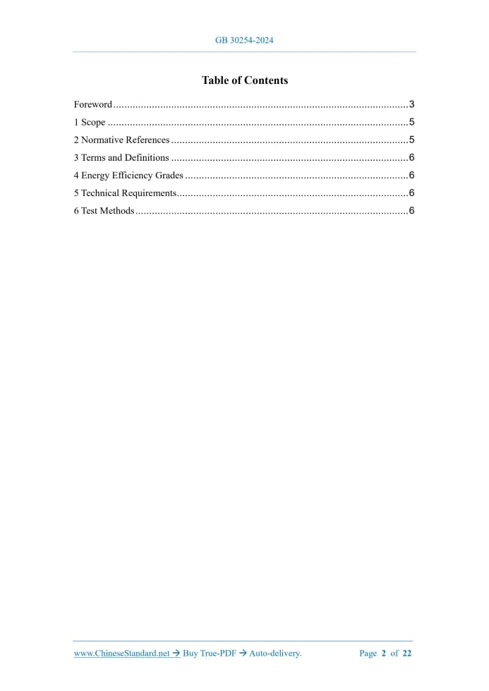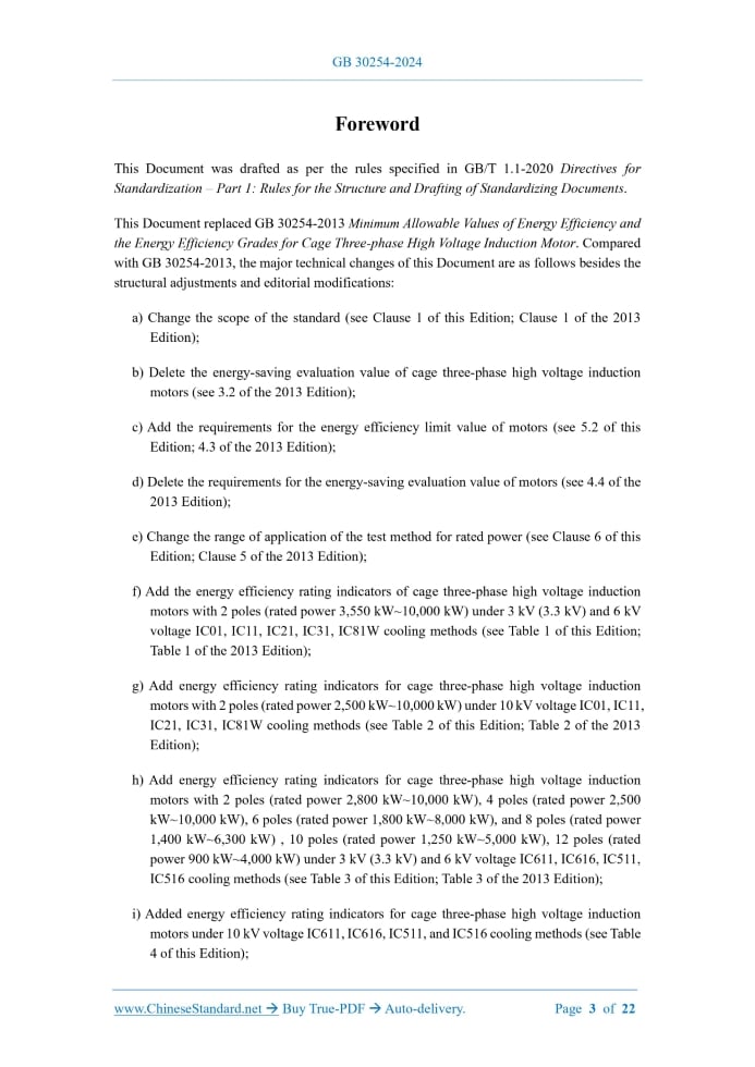 GB 30254-2024: Minimum allowable values of energy efficiency and energy efficiency grades for cage three-phase high voltage induction motor---This is an excerpt. Full copy of true-PDF in English version (including equations, symbols, images, flow-chart, tables, and figures etc.), auto-downloaded/delivered in 9 seconds, can be purchased online: https://www.ChineseStandard.net/PDF.aspx/GB30254-2024 GB NATIONAL STANDARD OF THE PEOPLE’S REPUBLIC OF CHINA ICS 27.010 CCS F 01 Replacing GB 30254-2013 Minimum Allowable Values of Energy Efficiency and Energy Efficiency Grades for Cage Three-Phase High Voltage Induction Motor Issued on. AUGUST 23, 2024 Implemented on. SEPTEMBER 1, 2025 Issued by. State Administration for Market Regulation; Standardization Administration of the People’s Republic of China. Table of ContentsForeword... 3 1 Scope... 5 2 Normative References... 5 3 Terms and Definitions... 6 4 Energy Efficiency Grades... 6 5 Technical Requirements... 6 6 Test Methods... 6ForewordThis Document was drafted as per the rules specified in GB/T 1.1-2020 Directives for Standardization – Part 1.Rules for the Structure and Drafting of Standardizing Documents. This Document replaced GB 30254-2013 Minimum Allowable Values of Energy Efficiency and the Energy Efficiency Grades for Cage Three-phase High Voltage Induction Motor. Compared with GB 30254-2013, the major technical changes of this Document are as follows besides the structural adjustments and editorial modifications. a) Change the scope of the standard (see Clause 1 of this Edition; Clause 1 of the 2013 Edition); b) Delete the energy-saving evaluation value of cage three-phase high voltage induction motors (see 3.2 of the 2013 Edition); c) Add the requirements for the energy efficiency limit value of motors (see 5.2 of this Edition; 4.3 of the 2013 Edition); d) Delete the requirements for the energy-saving evaluation value of motors (see 4.4 of the 2013 Edition); e) Change the range of application of the test method for rated power (see Clause 6 of this Edition; Clause 5 of the 2013 Edition); f) Add the energy efficiency rating indicators of cage three-phase high voltage induction motors with 2 poles (rated power 3,550 kW~10,000 kW) under 3 kV (3.3 kV) and 6 kV voltage IC01, IC11, IC21, IC31, IC81W cooling methods (see Table 1 of this Edition; Table 1 of the 2013 Edition); g) Add energy efficiency rating indicators for cage three-phase high voltage induction motors with 2 poles (rated power 2,500 kW~10,000 kW) under 10 kV voltage IC01, IC11, IC21, IC31, IC81W cooling methods (see Table 2 of this Edition; Table 2 of the 2013 Edition); h) Add energy efficiency rating indicators for cage three-phase high voltage induction motors with 2 poles (rated power 2,800 kW~10,000 kW), 4 poles (rated power 2,500 kW~10,000 kW), 6 poles (rated power 1,800 kW~8,000 kW), and 8 poles (rated power 1,400 kW~6,300 kW), 10 poles (rated power 1,250 kW~5,000 kW), 12 poles (rated power 900 kW~4,000 kW) under 3 kV (3.3 kV) and 6 kV voltage IC611, IC616, IC511, IC516 cooling methods (see Table 3 of this Edition; Table 3 of the 2013 Edition); i) Added energy efficiency rating indicators for cage three-phase high voltage induction motors under 10 kV voltage IC611, IC616, IC511, and IC516 cooling methods (see Table 4 of this Edition); j) Add energy efficiency rating indicators for cage three-phase high voltage induction motors under 3 kV (3.3 kV) and 6 kV voltage IC411 cooling methods (rated power 1,800 kW~3,150 kW) (see Table 5 of this Edition); k) Add energy efficiency rating indicators for cage three-phase high voltage induction motors under 10 kV voltage IC411 cooling methods (see Table 6 of this Edition). Please note that some contents of this Document may involve patents. The issuing agency of this Document shall not assume the responsibility to identify these patents. This Document was proposed by and under the jurisdiction of Standardization Administration of the People’s Republic of China. This Document was first-time published in 2013; it is first-time revised hereby. Minimum Allowable Values of Energy Efficiency and Energy Efficiency Grades for Cage Three-Phase High Voltage Induction Motor1 ScopeThis document specifies the energy efficiency level, technical requirements and test methods of high-voltage three-phase cage-type asynchronous motors (hereinafter referred to as "motors"). This document is applicable to 50 Hz three-phase AC power supply, continuous working vertical, horizontal motors and explosion-proof motors, with 2 poles to 12 poles, voltage, cooling method, rated power range as follows. a) Under 3 kV (3.3 kV) and 6 kV voltage, IC01, IC11, IC21, IC31, IC81W cooling method, rated power is 200 kW to 25,000 kW; b) Under 10 kV voltage, IC01, IC11, IC21, IC31, IC81W cooling method, rated power is 200 kW to 22,400 kW; c) Under 3 kV (3.3 kV) and 6 kV voltage, IC611, IC616, IC511, IC516 cooling method, rated power is 200 kW to 10,000 kW; d) Under 10 kV voltage, IC611, IC616, IC511, IC516 cooling method, rated power is 200 kW~10,000 kW; e) Under 3 kV (3.3 kV) and 6 kV voltage, IC411 cooling method, rated power is 200 kW~3,150 kW; f) Under 10 kV voltage, IC411 cooling method, rated power is 200 kW~2,800 kW.2 Normative ReferencesThe provisions in following documents become the essential provisions of this Document through reference in this Document. For the dated documents, only the versions with the dates indicated are applicable to this Document; for the undated documents, only the latest version (including all the amendments) is applicable to this Document. GB/T 755 Rotating electrical machines - Rating and performance GB/T 1032-2023 Test methods of three-phase induction motors3 Terms and DefinitionsFor the purposes of this Document, the following terms and definitions apply. 3.1 Minimum allowable values of energy efficiency for cage three-phase high voltage induction motor4 Energy Efficiency GradesThe energy efficiency grade of motors is divided