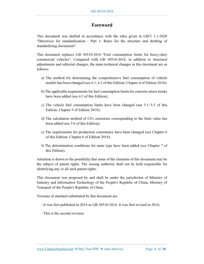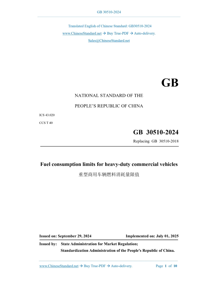 Similar standardsGB 30510-2024: Fuel consumption limits for heavy-duty commercial vehicles---This is an excerpt. Full copy of true-PDF in English version (including equations, symbols, images, flow-chart, tables, and figures etc.), auto-downloaded/delivered in 9 seconds, can be purchased online: https://www.ChineseStandard.net/PDF.aspx/GB30510-2024GB NATIONAL STANDARD OF THE PEOPLE’S REPUBLIC OF CHINA ICS 43.020 CCS T 40 Replacing GB 30510-2018 Fuel consumption limits for heavy-duty commercial vehicles ISSUED ON: SEPTEMBER 29, 2024 IMPLEMENTED ON: JULY 01, 2025 Issued by: State Administration for Market Regulation; Standardization Administration of the People's Republic of China. Table of ContentsForeword ... 3 1 Scope ... 4 2 Normative references ... 4 3 Terms and definitions ... 4 4 General requirements ... 5 5 Fuel consumption limits ... 5 6 Production consistency ... 8 8 Implementation of the Standard ... 10ForewordThis document was drafted in accordance with the rules given in GB/T 1.1-2020 "Directives for standardization - Part 1: Rules for the structure and drafting of standardizing documents". This document replaces GB 30510-2018 "Fuel consumption limits for heavy-duty commercial vehicles". Compared with GB 30510-2018, in addition to structural adjustments and editorial changes, the main technical changes in this document are as follows: a) The method for determining the comprehensive fuel consumption of vehicle models has been changed (see 4.1, 4.2 of this Edition; Chapter 4 of Edition 2018); b) The applicable requirements for fuel consumption limits for concrete mixer trucks have been added (see 4.3 of this Edition); c) The vehicle fuel consumption limits have been changed (see 5.1~5.5 of this Edition; Chapter 5 of Edition 2018); d) The calculation method of CO2 emissions corresponding to the limit value has been added (see 5.6 of this Edition); e) The requirements for production consistency have been changed (see Chapter 6 of this Edition; Chapter 6 of Edition 2018); f) The determination conditions for same type have been added (see Chapter 7 of this Edition). Attention is drawn to the possibility that some of the elements of this document may be the subject of patent rights. The issuing authority shall not be held responsible for identifying any or all such patent rights. This document was proposed by and shall be under the jurisdiction of Ministry of Industry and Information Technology of the People's Republic of China, Ministry of Transport of the People's Republic of China. Versions of standard substituted by this document are: - It was first published in 2014 as GB 30510-2014. It was first revised in 2018; - This is the second revision. Fuel consumption limits for heavy-duty commercial vehicles1 ScopeThis document specifies the fuel consumption limits, production consistency, type determination and implementation of the standard for heavy-duty commercial vehicles. This document applies to commercial vehicles that can be fueled by gasoline or diesel fuel and have a maximum design gross mass greater than 3,500 kg, including trucks, semi-trailer tractors, ordinary buses, dump trucks and city buses. This document does not apply to special purpose vehicles.2 Normative referencesThe following referenced documents are indispensable for the application of this document. For dated references, only the edition cited applies. For undated references, the latest edition of the referenced document (including any amendments) applies. GB/T 3730.1, Terms and definitions of motor vehicles, trailers and combination vehicle -- Part 1: Types GB/T 3730.2, Road vehicle. Masses. Vocabulary and codes GB/T 17350, Terms marks and designation for special purpose vehicles and special trailers GB/T 19596, Terminology of electric vehicles GB/T 19754-2021, Test methods for energy consumption of heavy-duty hybrid electric vehicles GB/T 27840-2021, Fuel consumption test methods for heavy-duty commercial vehicles3 Terms and definitionsFor the purposes of this document, the terms and definitions defined in GB/T 3730.1, GB/T 3730.2, GB/T 17350 and GB/T 19596 apply. NOTE 1: No difference in body type means that there is no obvious difference in the structure, shape and size of the body, but does not include changes in the body structure, shape and size caused by optional front and rear anti-collision bars, lighting fixtures, additional/optional roof air conditioning, roof luggage racks, rear luggage ladders, indirect vision devices, body cameras, radars, changes in the number and position of doors and windows, and changes in the opening and closing methods of doors and windows. h) There is no difference in the type of truck cab; NOTE 2: No difference in cab type means that there is no obvious difference in the structure and shape of the cab, but does not include changes in shape and size caused by optional front hood, front bumper, additional/optional deflector, additional lighting and indicator lights, indirect vision devices, body cameras, radars, etc. A series of cabs consisting of ordinary cabs, semi-high-top cabs, high-top cabs, or single-row cabs, row-and-a-half cabs, and double-row cabs can be considered to have no difference in cab type. i) The frontal area is the same or reduced, or increased by no more than 5% (except for the increase in frontal area caused by the installation/option of a deflector); j) The vehicle width and height are the same or reduced, or increased by no more than 5% (except for the increase in width and height caused by the installation/option of a deflector); k) The maximum design total mass is the same or reduced, or increases by no more than 5% within the same mass range; l) The drive type is the same; m) The transmission type is the same. The number of gears is the same or increased; n) The minimum overall transmission ratio is the same or reduced, or increased by no more than 8%; o) The static load radius of the tire is the same or increases; p) Radial tires and bias tir