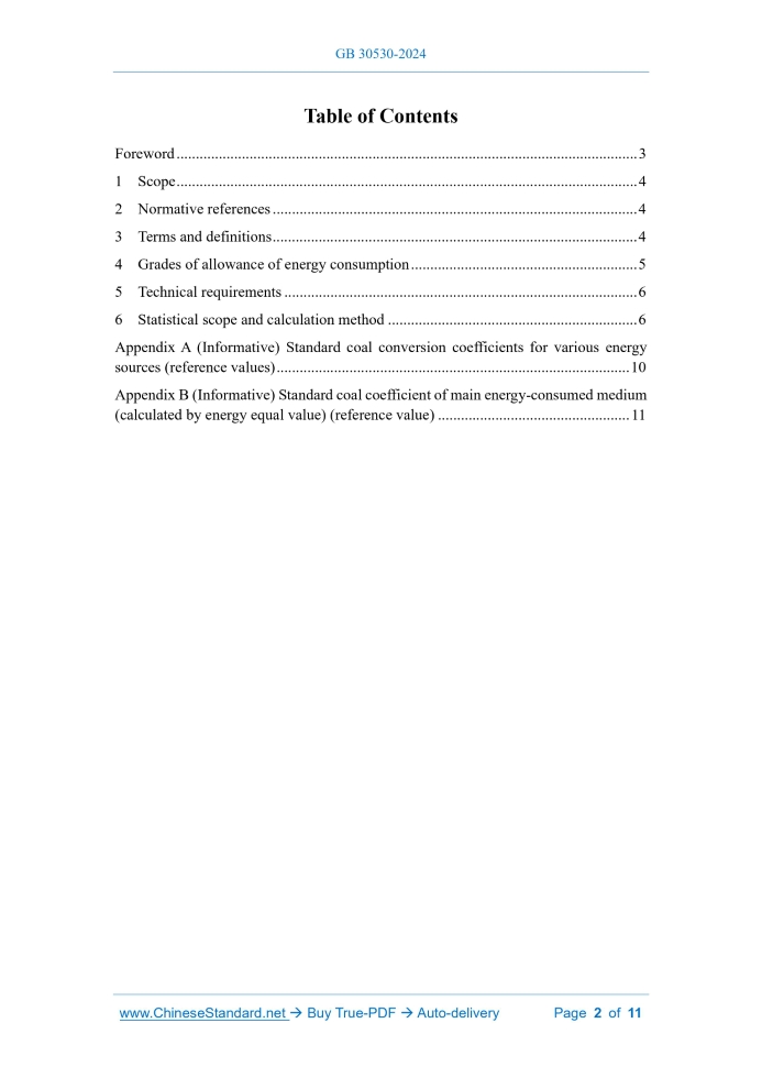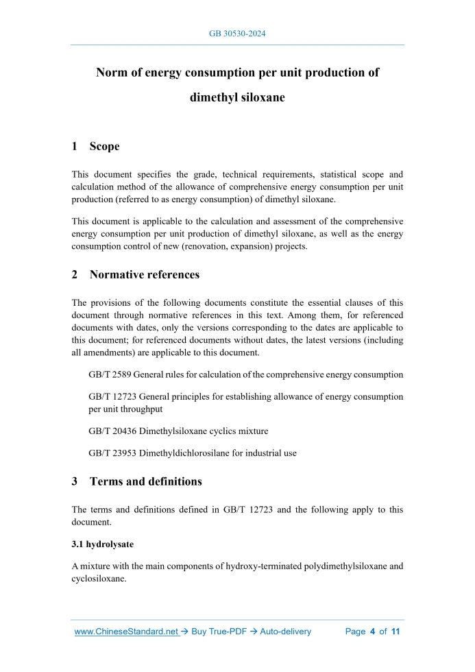 GB 30530-2024: Norm of energy consumption per unit production of dimethyl siloxane---This is an excerpt. Full copy of true-PDF in English version (including equations, symbols, images, flow-chart, tables, and figures etc.), auto-downloaded/delivered in 9 seconds, can be purchased online: https://www.ChineseStandard.net/PDF.aspx/GB30530-2024GB NATIONAL STANDARD OF THE PEOPLE'S REPUBLIC OF CHINA ICS 27.010 CCS F 01 Replacing GB 30530-2014 Norm of energy consumption per unit production of dimethyl siloxane Issued on: APRIL 29, 2024 Implemented on: MAY 1, 2025 Issued by. State Administration for Market Regulation; Standardization Administration of PRC. Table of ContentsForeword... 3 1 Scope... 4 2 Normative references... 4 3 Terms and definitions... 4 4 Grades of allowance of energy consumption... 5 5 Technical requirements... 6 6 Statistical scope and calculation method... 6 Appendix A (Informative) Standard coal conversion coefficients for various energy sources (reference values)... 10 Appendix B (Informative) Standard coal coefficient of main energy-consumed medium (calculated by energy equal value) (reference value)... 11 Norm of energy consumption per unit production of dimethyl siloxane1 ScopeThis document specifies the grade, technical requirements, statistical scope and calculation method of the allowance of comprehensive energy consumption per unit production (referred to as energy consumption) of dimethyl siloxane. This document is applicable to the calculation and assessment of the comprehensive energy consumption per unit production of dimethyl siloxane, as well as the energy consumption control of new (renovation, expansion) projects.2 Normative referencesThe provisions of the following documents constitute the essential clauses of this document through normative references in this text. Among them, for referenced documents with dates, only the versions corresponding to the dates are applicable to this document; for referenced documents without dates, the latest versions (including all amendments) are applicable to this document. GB/T 2589 General rules for calculation of the comprehensive energy consumption GB/T 12723 General principles for establishing allowance of energy consumption per unit throughput GB/T 20436 Dimethylsiloxane cyclics mixture GB/T 23953 Dimethyldichlorosilane for industrial use3 Terms and definitionsThe terms and definitions defined in GB/T 12723 and the following apply to this document. 3.1 hydrolysate A mixture with the main components of hydroxy-terminated polydimethylsiloxane and cyclosiloxane.5 Technical requirements5.1 Limit value of comprehensive energy consumption per unit production of dimethyl siloxane The limit value of comprehensive energy consumption per unit product of existing dimethyl siloxane production enterprises shall comply with Grade 3 in Table 1. 5.2 Access value of comprehensive energy consumption per unit production of dimethyl siloxane The access value of comprehensive energy consumption per unit product of new (expanded, renovated) dimethyl siloxane production enterprises shall comply with Grade 2 in Table 1.6 Statistical scope and calculation method6.1 Statistical scope of comprehensive energy consumption of dimethyl siloxane 6.1.1 The comprehensive energy consumption of dimethyl siloxane mainly includes the energy consumption of the production system, the energy consumption of the auxiliary production system and the energy consumption of the ancillary production system. 6.1.2 The energy consumption of the production system refers to the total amount of various energy actually consumed by the complete process including the silicon powder processing, monochloromethane synthesis, organosilicon monomer synthesis, organosilicon monomer distillation, organosilicon high-boiling cracking, the comprehensive utilization of dimethyldichlorosilane, dimethyldichlorosilane hydrolysis, dimethyl siloxane refining, cracking, dimethyl cyclosiloxane distillation, storage of finished dimethyl siloxane, and pre-treatment and discharge of waste liquid, waste residue and waste gas, as well as energy consumption by equipment. 6.1.3 The energy consumption of auxiliary production systems refers to the total amount of energy consumed by the processes, facilities and equipment of the production system services, including the total amount of energy consumed by the power supply, water supply, gas supply, heating, refrigeration, machine repair, instrument repair, lighting, warehouses and raw material sites within the factory, as well as safety and environmental protection facilities. 6.1.4 The energy consumption of ancillary production systems refers to the total amount of energy consumed by departments and units that provide services for production during the production process, including the total amount of energy consumed by facilities such as offices, operation rooms, lounges, changing rooms, bathhouses, central control analysis, finished product inspection and maintenance. 6.1.5 The comprehensive energy consumption of dimethyl siloxane does not include the energy consumed in the construction of infrastructure, technological transformation and other projects, as well as the energy recycled and exported during the production process. 6.2 Calculation method 6.2.1 General The actual consumption of various fuel energies shall be converted into standard coal according to its lower heating value as received in accordance with GB/T 2589.The lower heating value of energy and the energy consumption of the energy-consumed medium shall be converted into standard coal according to the measured values or the data provided by the supply unit. If the measured values cannot be obtained, the conversion coefficient can be referred to in Appendix A and Appendix B. 6.2.2 Calculation of comprehensive energy consumption of dimethyl siloxane products The energy consumption of dimethyl siloxane shall be calculated based on the actual measured value. The measurement readings of