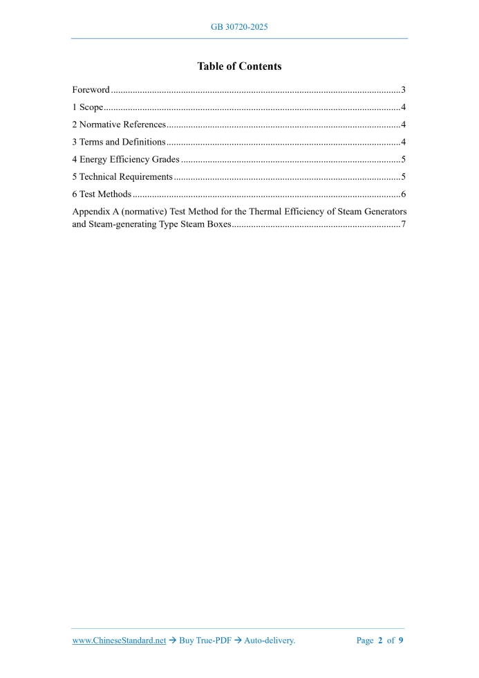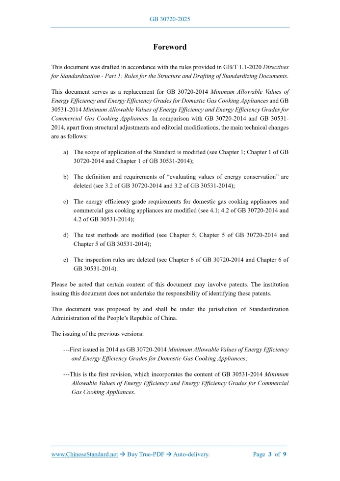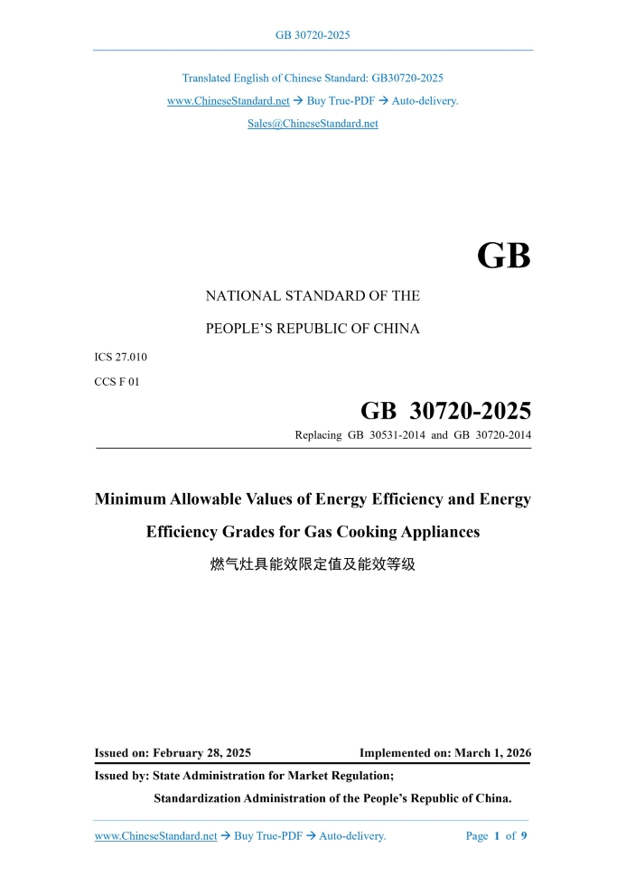 Similar standardsGB 30720-2025: Minimum allowable values of energy efficiency and energy efficiency grades for gas cooking appliances---This is an excerpt. Full copy of true-PDF in English version (including equations, symbols, images, flow-chart, tables, and figures etc.), auto-downloaded/delivered in 9 seconds, can be purchased online: https://www.ChineseStandard.net/PDF.aspx/GB30720-2025 GB NATIONAL STANDARD OF THE PEOPLE’S REPUBLIC OF CHINA ICS 27.010 CCS F 01 Replacing GB 30531-2014 and GB 30720-2014 Minimum Allowable Values of Energy Efficiency and Energy Efficiency Grades for Gas Cooking Appliances Issued on. FEBRUARY 28, 2025 Implemented on. MARCH 1, 2026 Issued by. State Administration for Market Regulation; Standardization Administration of the People’s Republic of China. Table of ContentsForeword... 3 1 Scope... 4 2 Normative References... 4 3 Terms and Definitions... 4 4 Energy Efficiency Grades... 5 5 Technical Requirements... 5 6 Test Methods... 6 Appendix A (normative) Test Method for the Thermal Efficiency of Steam Generators and Steam-generating Type Steam Boxes... 7ForewordThis document was drafted in accordance with the rules provided in GB/T 1.1-2020 Directives for Standardization - Part 1.Rules for the Structure and Drafting of Standardizing Documents. This document serves as a replacement for GB 30720-2014 Minimum Allowable Values of Energy Efficiency and Energy Efficiency Grades for Domestic Gas Cooking Appliances and GB 30531-2014 Minimum Allowable Values of Energy Efficiency and Energy Efficiency Grades for Commercial Gas Cooking Appliances. In comparison with GB 30720-2014 and GB 30531- 2014, apart from structural adjustments and editorial modifications, the main technical changes are as follows. a) The scope of application of the Standard is modified (see Chapter 1; Chapter 1 of GB 30720-2014 and Chapter 1 of GB 30531-2014); b) The definition and requirements of “evaluating values of energy conservation” are deleted (see 3.2 of GB 30720-2014 and 3.2 of GB 30531-2014); c) The energy efficiency grade requirements for domestic gas cooking appliances and commercial gas cooking appliances are modified (see 4.1; 4.2 of GB 30720-2014 and 4.2 of GB 30531-2014); d) The test methods are modified (see Chapter 5; Chapter 5 of GB 30720-2014 and Chapter 5 of GB 30531-2014); e) The inspection rules are deleted (see Chapter 6 of GB 30720-2014 and Chapter 6 of GB 30531-2014). Please be noted that certain content of this document may involve patents. The institution issuing this document does not undertake the responsibility of identifying these patents. This document was proposed by and shall be under the jurisdiction of Standardization Administration of the People’s Republic of China. The issuing of the previous versions. ---First issued in 2014 as GB 30720-2014 Minimum Allowable Values of Energy Efficiency and Energy Efficiency Grades for Domestic Gas Cooking Appliances; ---This is the first revision, which incorporates the content of GB 30531-2014 Minimum Allowable Values of Energy Efficiency and Energy Efficiency Grades for Commercial Gas Cooking Appliances. Minimum Allowable Values of Energy Efficiency and Energy Efficiency Grades for Gas Cooking Appliances1 ScopeThis document specifies the energy efficiency grades, technical requirements and test methods for gas cooking appliances. This document is applicable to domestic gas stoves and integrated stoves with a rated heat load of not greater than 5.23 kw using town gas (hereinafter collectively referred to as “domestic gas cooking appliances”), and is also applicable to cooking stoves with a rated heat load of not greater than 60 kw, large pot stoves with a rated heat load of not greater than 80 kw, water-tank type and steam-generating type steam boxes and steam generators with a rated heat load of not greater than 80 kw (hereinafter collectively referred to as “commercial gas cooking appliances”). This document does not apply to gas cooking appliances used in means of transportation. NOTE. the rated heat load of domestic gas stoves and integrated stoves refers to the heat load of a single combustor; the rated heat load of cooking stoves, large pot stoves, steam boxes and steam generators refers to the heat load of a single combustion unit.2 Normative ReferencesThe contents of the following documents constitute indispensable clauses of this document through the normative references in the text. In terms of references with a specified date, only versions with a specified date are applicable to this document. In terms of references without a specified date, the latest version (including all the modifications) is applicable to this document. GB 16410 Domestic Gas Cooking Appliances GB 35848-2024 Commercial Gas-burning Appliance3 Terms and DefinitionsThe terms and definitions defined in GB 16410 and GB 35848, and the following are applicable to this document. 3.1 minimum allowable values of energy efficiency for gas cooking appliances Under the test conditions specified in this document, the minimum thermal efficiency that a gas cooking appliance is allowed to achieve.4 Energy Efficiency Grades4.1 Domestic Gas Cooking Appliances The energy efficiency grades of domestic gas cooking appliances are divided into 3 grades, among which, Grade 1 signifies the highest energy efficiency.5 Technical Requirements5.1 Domestic Gas Cooking Appliances The minimum allowable values of energy efficiency of domestic gas cooking appliances shall comply with Grade 3 in Table 1.6 Test Methods6.1 Domestic Gas Cooking Appliances 6.2 Commercial Gas Cooking Appliances 6.2.1 The test method for the thermal efficiency of steam generators and steam-generating type steam boxes shall be carried out in accordance with Appendix A. 6.2.2 The test conditions and test methods for water-tank type steam boxes, cooking stoves and large pot stoves shall be in accordance with GB 35848.Appendix A(normative) Test Method for the Thermal Efficiency of S