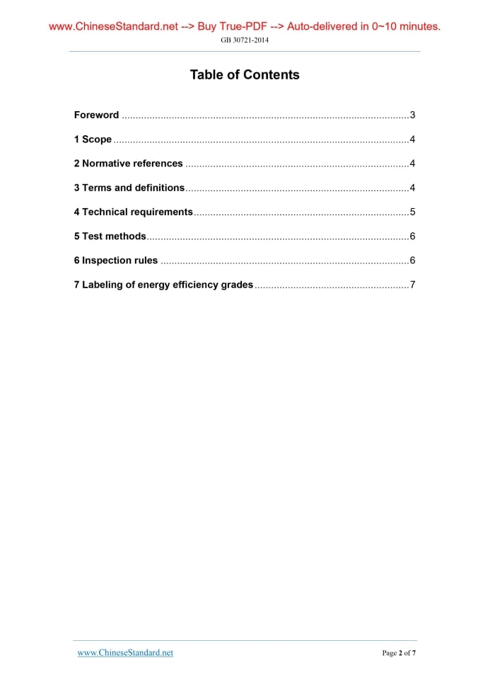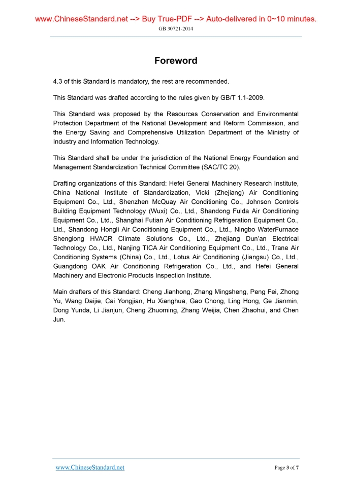 Similar standardsGB 30721-2014: Minimum allowable values of energy efficiency and energy efficiency grades for water-source (ground-source) heat pumps---This is an excerpt. Full copy of true-PDF in English version (including equations, symbols, images, flow-chart, tables, and figures etc.), auto-downloaded/delivered in 9 seconds, can be purchased online: https://www.ChineseStandard.net/PDF.aspx/GB30721-2014 GB ICS 27.010 F 01 National Standard of the People’s Republic of China Minimum allowable values of energy efficiency and energy efficiency grades for water-source (ground-source) heat pumps Issued on: JUNE 9, 2014 Implemented on: APRIL 1, 2014 Issued by. General Administration of Quality Supervision, Inspection and Quarantine of the People's Republic of China; Standardization Administration Committee of the People's Republic of China. Table of ContentsForeword ... 3 1 Scope ... 4 2 Normative references ... 4 3 Terms and definitions ... 4 4 Technical requirements ... 5 5 Test methods ... 6 6 Inspection rules ... 6 7 Labeling of energy efficiency grades ... 7Foreword4.3 of this Standard is mandatory, the rest are recommended. This Standard was drafted according to the rules given by GB/T 1.1-2009. This Standard was proposed by the Resources Conservation and Environmental Protection Department of the National Development and Reform Commission, and the Energy Saving and Comprehensive Utilization Department of the Ministry of Industry and Information Technology. This Standard shall be under the jurisdiction of the National Energy Foundation and Management Standardization Technical Committee (SAC/TC 20). Drafting organizations of this Standard. Hefei General Machinery Research Institute, China National Institute of Standardization, Vicki (Zhejiang) Air Conditioning Equipment Co., Ltd., Shenzhen McQuay Air Conditioning Co., Johnson Controls Building Equipment Technology (Wuxi) Co., Ltd., Shandong Fulda Air Conditioning Equipment Co., Ltd., Shanghai Futian Air Conditioning Refrigeration Equipment Co., Ltd., Shandong Hongli Air Conditioning Equipment Co., Ltd., Ningbo WaterFurnace Shenglong HVACR Climate Solutions Co., Ltd., Zhejiang Dun’an Electrical Technology Co., Ltd., Nanjing TICA Air Conditioning Equipment Co., Ltd., Trane Air Conditioning Systems (China) Co., Ltd., Lotus Air Conditioning (Jiangsu) Co., Ltd., Guangdong OAK Air Conditioning Refrigeration Co., Ltd., and Hefei General Machinery and Electronic Products Inspection Institute. Main drafters of this Standard. Cheng Jianhong, Zhang Mingsheng, Peng Fei, Zhong Yu, Wang Daijie, Cai Yongjian, Hu Xianghua, Gao Chong, Ling Hong, Ge Jianmin, Dong Yunda, Li Jianjun, Cheng Zhuoming, Zhang Weijia, Chen Zhaohui, and Chen Jun. Minimum allowable values of energy efficiency and energy efficiency grades for water-source (ground-source) heat pumps1 ScopeThis Standard specifies the minimum allowable values of energy efficiency, evaluation values of energy conservation, energy efficiency grades, test methods, and inspection rules for water-source (ground-source) heat pumps. This Standard applies to the water-source (ground-source) heat pumps of household, commercial and industrial uses, and other similar uses that use electrical and mechanical compression systems and use water as cold (hot) source. This Standard does not apply to cooling-only-type and heating-only-type water-source (ground-source) heat pumps.2 Normative referencesThe following documents are essential for the application of this document. For dated references, only dated edition applies to this document. For undated references, the latest edition (including all amendments) applies. GB/T 19409 Water-source (ground-source) heat pumps3 Terms and definitionsThe terms and definitions defined in GB/T 19409 AND the following terms and definitions apply to this document. 3.1 Annual coefficient of performance for water-source (ground-source) heat pumps; ACOP The annual coefficient of performance obtained by comprehensively WEIGHTING the efficiency for water-source (ground-source) heat pumps when operating at full-load under nominal cooling conditions and nominal heating conditions WITH several office7 Labeling of energy efficiency gradesManufacturers shall determine the energy efficiency grades for water-source (ground-source) heat pumps according to the requirements and the test results of this Standard. Manufacturers shall indicate the energy efficiency grades for water-source (ground-source) heat pumps and the standard number it bases in the factory-exit documents of products. ......Source: Above contents are excerpted from the full-copy PDF -- translated/reviewed by: www.ChineseStandard.net / Wayne Zheng et al. Tips & Frequently Asked Questions:Question 1: How long will the true-PDF of English version of GB 30721-2014 be delivered?Answer: The full copy PDF of English version of GB 30721-2014 can be downloaded in 9 seconds, and it will also be emailed to you in 9 seconds (double mechanisms to ensure the delivery reliably), with PDF-invoice.Question 2: Can I share the purchased PDF of GB 30721-2014_English with my colleagues?Answer: Yes. The purchased PDF of GB 30721-2014_English will be deemed to be sold to your employer/organization who actually paid for it, including your colleagues and your employer's intranet.Question 3: Does the price include tax/VAT?Answer: Yes. Our tax invoice, downloaded/delivered in 9 seconds, includes all tax/VAT and complies with 100+ countries' tax regulations (tax exempted in 100+ countries) -- See Avoidance of Double Taxation Agreements (DTAs): List of DTAs signed between Singapore and 100+ countriesQuestion 4: Do you accept my currency other than USD?Answer: Yes. www.ChineseStandard.us -- GB 30721-2014 -- Click this link and select your country/currency to pay, the exact amount in your currency will be printed on the invoice. Full PDF will also be downloaded/emailed in 9 seconds.How to buy and download a true PDF of English version of GB 30721-2014?A s