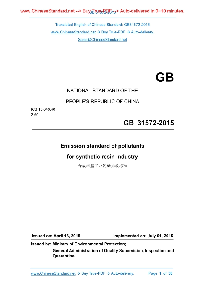 GB 31572-2015: Emission standard of pollutants for synthetic resin industry Delivery: 9 seconds. True-PDF full-copy in English & invoice will be downloaded + auto-delivered via email. See step-by-step procedure Status: Valid