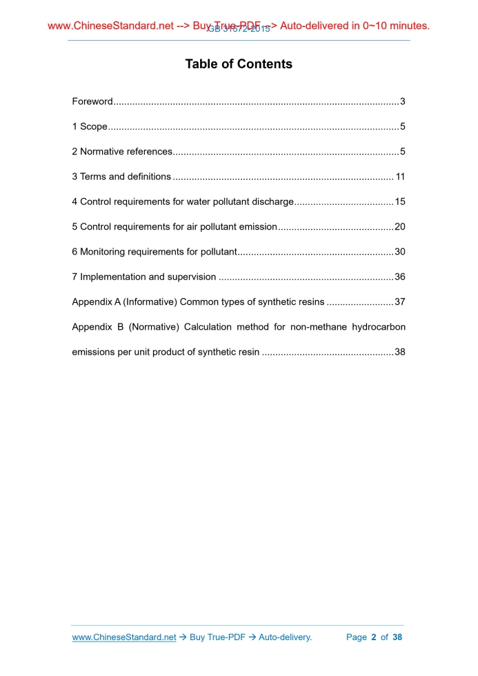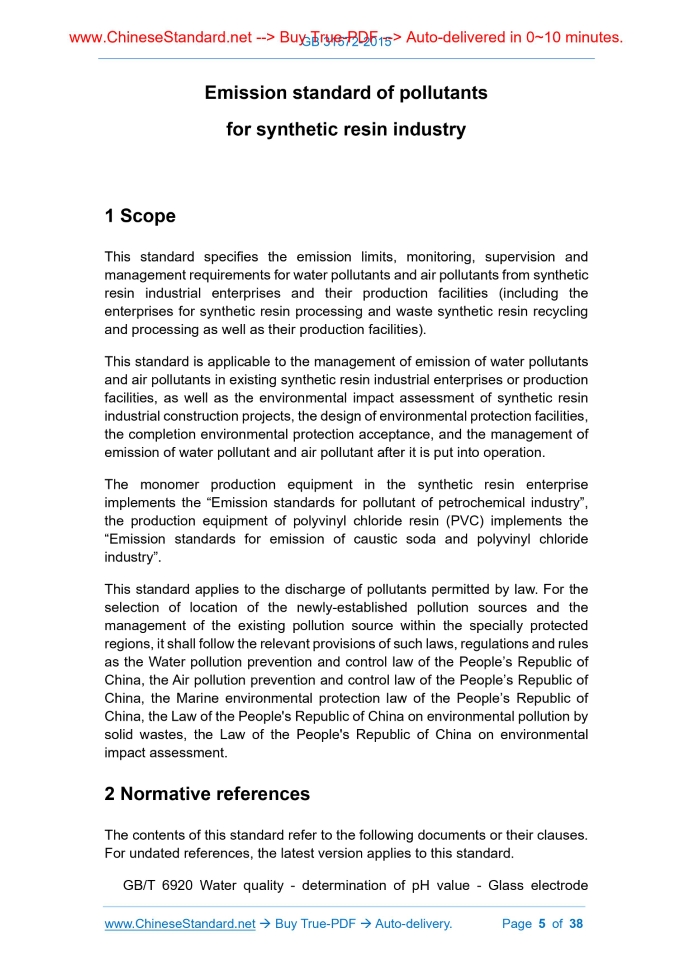 Similar standardsGB 31572-2015: Emission standard of pollutants for synthetic resin industry---This is an excerpt. Full copy of true-PDF in English version (including equations, symbols, images, flow-chart, tables, and figures etc.), auto-downloaded/delivered in 9 seconds, can be purchased online: https://www.ChineseStandard.net/PDF.aspx/GB31572-2015GB NATIONAL STANDARD OF THE PEOPLE’S REPUBLIC OF CHINA ICS 13.040.40 Z 60 Emission standard of pollutants for synthetic resin industry Issued on. APRIL 16, 2015 Implemented on. JULY 01, 2015 Issued by. Ministry of Environmental Protection; General Administration of Quality Supervision, Inspection and Quarantine. Table of ContentsForeword... 3 1 Scope... 5 2 Normative references... 5 3 Terms and definitions... 11 4 Control requirements for water pollutant discharge... 15 5 Control requirements for air pollutant emission... 20 6 Monitoring requirements for pollutant... 30 7 Implementation and supervision... 36 Appendix A (Informative) Common types of synthetic resins... 37 Appendix B (Normative) Calculation method for non-methane hydrocarbon emissions per unit product of synthetic resin... 38ForewordTo implement the laws and regulations such as “Environmental protection law of the People’s Republic of China”, “Water pollution prevention and control law of the People’s Republic of China”, “Air pollution prevention and control law of the People’s Republic of China”, to protect environment and prevent and control pollution, to promote technological progress and sustainable development in the synthetic resin industry, this standard is hereby developed. This standard specifies the emission limits, monitoring, supervision and management requirements for water pollutants and air pollutants in industrial enterprises and their production facilities of synthetic resins (except for polyvinyl chloride resins). For the synthetic resin industrial enterprise’s emission of odorous pollutants and environmental noises, the corresponding national pollutant discharge standards apply. For the identification, treatment and disposal of solid wastes, the corresponding national solid waste pollution control standards apply. The supporting boiler and heat-transfer oil-furnace follows the “Emission standard of air pollutants for boilers”. This standard is the first release. Starting from July 1, 2015 for the new facility, and from July 1, 2017 for the existing facility, the emission of water pollutant and air pollutant shall be controlled in accordance with the provisions of this standard, at the same time it will stop implementing the relevant provisions of the “Integrated wastewater discharge standard” (GB 8978-1996) and the “Comprehensive emission standard of air pollutants” (GB 16297-1996). Each region may, in accordance with the local environmental protection needs as well as the economic & technical conditions, implement this standard in advance after being approved by provincial people’s government. This standard provides the basic requirements for the control of emission of water pollutants and air pollutants in synthetic resin industry. For the items which are not specified in this standard, the local provincial people's government may formulate local pollutant discharge standards; for the items which have been specified in this standard, the local provincial people's government may formulate local pollutant discharge standards that are stricter than this standard. Where the requirements of environmental impact assessment or the discharge permit are stricter than this standard or local standard, it shall be implemented in accordance with the approved environmental impact assessment or discharge permit. This standard was formulated by the Science and Technology Standards Department of the Ministry of Environmental Protection. Drafting organizations of this standard. China Petroleum and Chemical Exploration and Design Association Environmental Protection Design Committee, China Tianchen Engineering Co., Ltd., Zhonglan Lianhai Design and Research Institute. This standard was approved by the Ministry of Environmental Protection on April 3, 2015. This standard is implemented from July 1, 2015. For this standard, the Ministry of Environmental Protection shall be responsible for its interpretation. Emission standard of pollutants for synthetic resin industry1 ScopeThis standard specifies the emission limits, monitoring, supervision and management requirements for water pollutants and air pollutants from synthetic resin industrial enterprises and their production facilities (including the enterprises for synthetic resin processing and waste synthetic resin recycling and processing as well as their production facilities). This standard is applicable to the management of emission of water pollutants and air pollutants in existing synthetic resin industrial enterprises or production facilities, as well as the environmental impact assessment of synthetic resin industrial construction projects, the design of environmental protection facilities, the completion environmental protection acceptance, and the management of emission of water pollutant and air pollutant after it is put into operation. The monomer production equipment in the synthetic resin enterprise implements the “Emission standards for pollutant of petrochemical industry”, the production equipment of polyvinyl chloride resin (PVC) implements the “Emission standards for emission of caustic soda and polyvinyl chloride industry”. This standard applies to the discharge of pollutants permitted by law. For the selection of location of the newly-established pollution sources and the management of the existing pollution source within the specially protected regions, it shall follow the relevant provisions of such laws, regulations and rules as the Water pollution prevention and control law of the People’s Republic of China, the Air pollution prevention and control law of the 