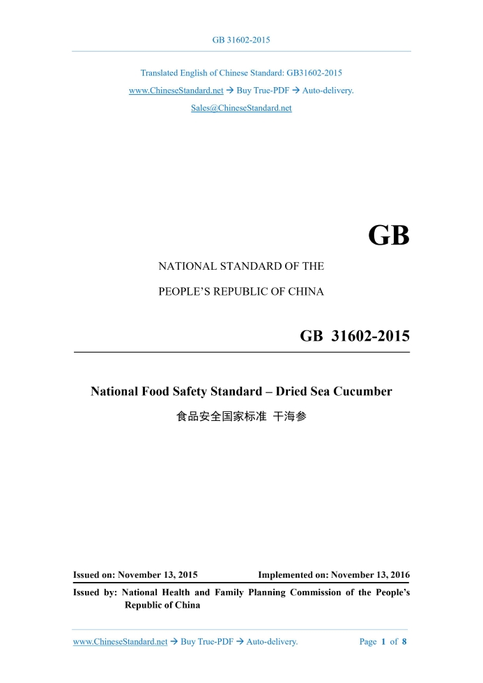 GB 31602-2015: National food safety standard -- Dried sea cucumber Delivery: 9 seconds. True-PDF full-copy in English & invoice will be downloaded + auto-delivered via email. See step-by-step procedure Status: Valid