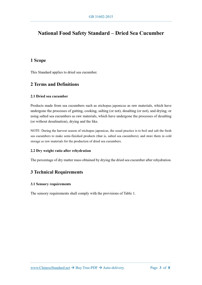 Similar standardsGB 31602-2015: National food safety standard -- Dried sea cucumber---This is an excerpt. Full copy of true-PDF in English version (including equations, symbols, images, flow-chart, tables, and figures etc.), auto-downloaded/delivered in 9 seconds, can be purchased online: https://www.ChineseStandard.net/PDF.aspx/GB31602-2015NATIONAL STANDARD OF THE PEOPLE’S REPUBLIC OF CHINA National Food Safety Standard – Dried Sea Cucumber Issued on: NOVEMBER 13, 2015 Implemented on: NOVEMBER 13, 2016 Issued by. National Health and Family Planning Commission of the People’s Republic of China Table of Contents1 Scope... 3 2 Terms and Definitions... 3 3 Technical Requirements... 3 4 Others... 4 National Food Safety Standard – Dried Sea Cucumber1 ScopeThis Standard applies to dried sea cucumber.2 Terms and Definitions2.1 Dried sea cucumber Products made from sea cucumbers such as stichopus japonicus as raw materials, which have undergone the processes of gutting, cooking, salting (or not), desalting (or not), and drying; or using salted sea cucumbers as raw materials, which have undergone the processes of desalting (or without desalination), drying and the like. NOTE. During the harvest season of stichopus japonicus, the usual practice is to boil and salt the fresh sea cucumbers to make semi-finished products (that is, salted sea cucumbers); and store them in cold storage as raw materials for the production of dried sea cucumbers. 2.2 Dry weight ratio after rehydration The percentage of dry matter mass obtained by drying the dried sea cucumber after rehydration.3 Technical Requirements3.1 Sensory requirements The sensory requirements shall comply with the provisions of Table 1.Appendix AInspection Method A.1 General Unless otherwise specified in this Standard, the purity of all reagents shall be above analytically pure; and the standard solutions, preparations and products used for the determination of standard titration solutions and impurities shall be prepared in accordance with the provisions of GB/T 601, GB/T 602 and GB/T 603.The water used in the experiment shall meet the requirements of Class-III water in GB/T 6682.The solution used in the test refers to the aqueous solution when the reagent is not specified. A.2 Pre-treatment of sample A.2.1 Take at least 3 dried sea cucumbers, put them into a high-speed pulverizer for pulverization (25 000r/min, 10s/time~15s/time); and pulverize them for several times until all the specimens pass through the 830μm (20 mesh) sieve. The specimen after treatment shall be sealed and ready for use. A.2.2 The samples processed by this method are mainly used for the detection of protein, moisture, salt and other indicators. A.3 Rehydration of dried sea cucumbers A.3.1 Pre-soaking Take 2~3 pieces of dried sea cucumbers; weigh about 10g (m1, accurate to 0.01g); put them in a 1000mL beaker; pour in water (the amount of water is about 50 times the mass of the sea cucumber; and the sea cucumber body should be submerged); then cover the watch glass; soak at room temperature for 24h. A.3.2 Cleaning The sea cucumber body was cut in the soaking solution; the mud and sand attached to the sea cucumber body are cleaned; after the calcareous in the mouth is removed, and then cut into strips with a width of about 5 mm; the sea cucumber body, mud sand and calcareous in the mouth are all retained in the original soaking solution. A.3.3 Boiling Place the sample treated as per A.3.2 and the immersion solution in the original beaker; cover with a watch glass; boil over high heat; then reduce to low heat; keep boiling and continue to boil for 30 min; let it cool to room temperature; and place it in a 0℃~10℃ refrigerator; place it for 20h. During the boiling and soaking process, the amount of water shall be kept submerging the sea cucumber body. A.3.4 Specimen A.3.4.1 Pour all the leaching solution and sea cucumber body treated as per A.3.3 into a 1000mL graduated cylinder, make constant volume to 600mL; and mix well. A.3.4.2 Take out the sea cucumber and put it into a beaker; add 600mL of water; boil it again according to the method in A.3.3.Take out the sea cucumber after it has been placed in the refrigerator; absorb the surface moisture with filter paper; mince it for later use of testing the pollutants and veterinary drug residue. A.3.4.3 Filter the soaking liquid and transfer it to ashless filter paper for the detection of sand content. A.3.4.4 The obtained filtrate is used for the detection of water-soluble total sugar. When the sugar content in the test solution is high, it shall be diluted with water before testing; the appropriate sugar content in the test solution is 30μg/mL~70μg/mL. A.4 Test method for dry weight ratio after rehydration in dried sea cucumber A.4.1 Principle The dried sea cucumber is rehydrated to remove various water-soluble substances from the sea cucumber; and then the dry matter mass fraction obtained by drying the sea cucumber. A.4.2 Instruments and equipment A.4.2.1 Beaker. Tall-type, 1000mL. A.4.2.2 Weighing flask. A.4.2.3 Electric heating constant temperature drying oven. A.4.2.4 Dryer. With effective desiccant. A.4.2.5 Balance. the sensory amount is 0.1mg. A.4.3 Analysis procedures A.4.3.1 Take the whole dried sea cucumber; weigh it (m2, accurate to 0.0001g); put it in a 1000mL beaker; pour in water (the amount of water is about 50 times the mass of the sea cucumber; and the sea cucumber body shall be submerged); cover it with watch glass; soak at room temperature for 24 h; cut the sea cucumber body; the mud and sand attached to the sea cucumber body are cleaned in the original soaking solution; and the limestone in the mouth is carefully removed. ......Source: Above contents are excerpted from the full-copy PDF -- translated/reviewed by: www.ChineseStandard.net / Wayne Zheng et al. Tips & Frequently Asked Questions:Question 1: How long will the true-PDF of English version of GB 31602-2015 be delivered?Answer: The full cop