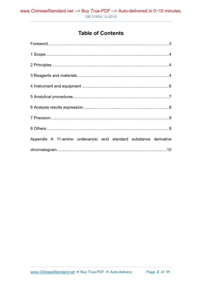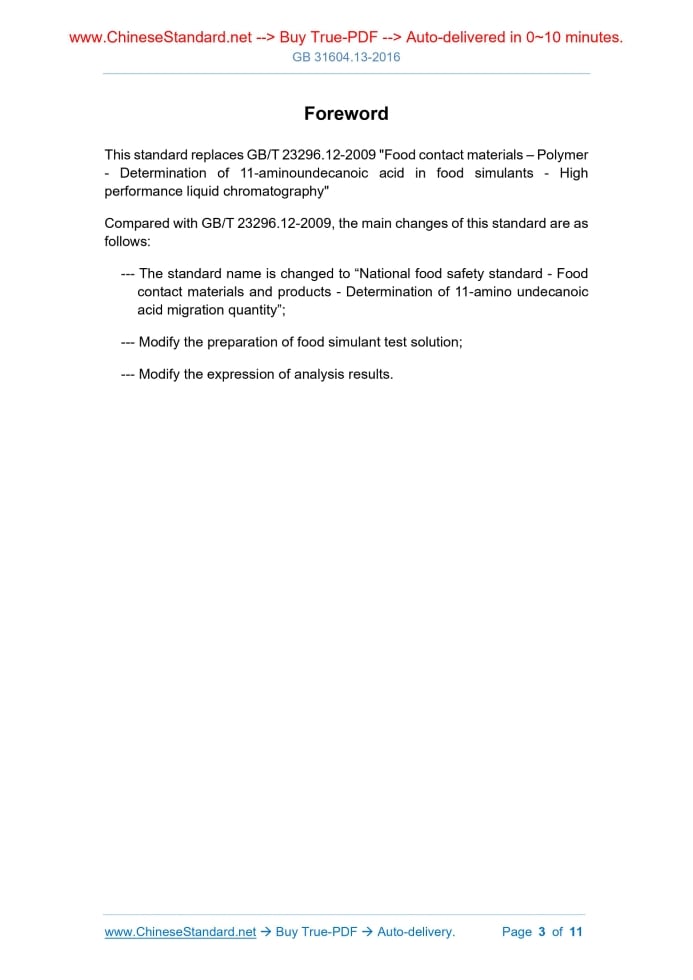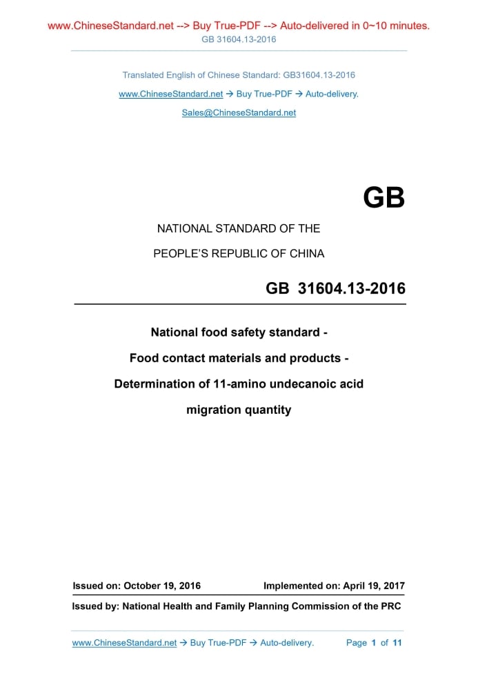 GB 31604.13-2016: National food safety standard - Food contact materials and products - Determination of 11- amino undecanoic acid migration quantity Delivery: 9 seconds. True-PDF full-copy in English & invoice will be downloaded + auto-delivered via email. See step-by-step procedure Status: Valid