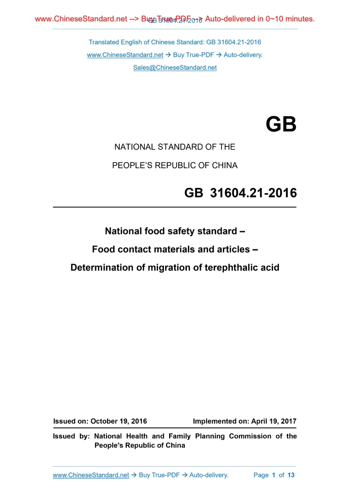 GB 31604.21-2016: National food safety standard - Food contact materials and articles - Determination of migration of terephthalic acid Delivery: 9 seconds. True-PDF full-copy in English & invoice will be downloaded + auto-delivered via email. See step-by-step procedure Status: Valid