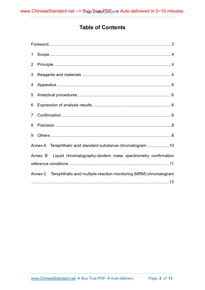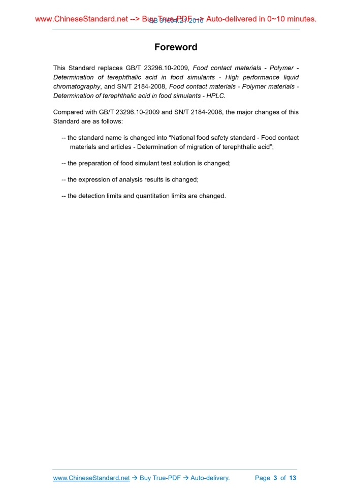 Similar standardsGB 31604.21-2016: National food safety standard - Food contact materials and articles - Determination of migration of terephthalic acid---This is an excerpt. Full copy of true-PDF in English version (including equations, symbols, images, flow-chart, tables, and figures etc.), auto-downloaded/delivered in 9 seconds, can be purchased online: https://www.ChineseStandard.net/PDF.aspx/GB31604.21-2016 GB NATIONAL STANDARD OF THE PEOPLE’S REPUBLIC OF CHINA National food safety standard – Food contact materials and articles – Determination of migration of terephthalic acid Issued on: OCTOBER 19, 2016 Implemented on: APRIL 19, 2017 Issued by. National Health and Family Planning Commission of the People's Republic of China Table of ContentsForeword . 3 1 Scope .. 4 2 Principle . 4 3 Reagents and materials .. 4 4 Apparatus . 6 5 Analytical procedures . 6 6 Expression of analysis results .. 8 7 Confirmation . 8 8 Precision . 8 9 Others . 8 Annex A Terephthalic acid standard substance chromatogram . 10 Annex B Liquid chromatography-tandem mass spectrometry confirmation reference conditions . 11 Annex C Terephthalic acid multiple-reaction monitoring (MRM) chromatogram . 13 Foreword This Standard replaces GB/T 23296.10-2009, Food contact materials - Polymer - Determination of terephthalic acid in food simulants - High performance liquid chromatography, and SN/T 2184-2008, Food contact materials - Polymer materials - Determination of terephthalic acid in food simulants - HPLC. Compared with GB/T 23296.10-2009 and SN/T 2184-2008, the major changes of this Standard are as follows. -- the standard name is changed into “National food safety standard - Food contact materials and articles - Determination of migration of terephthalic acid”; -- the preparation of food simulant test solution is changed; -- the expression of analysis results is changed; -- the detection limits and quantitation limits are changed. National food safety standard – Food contact materials and articles – Determination of migration of terephthalic acid1 ScopeThis Standard specifies the method for the determination of migration of terephthalic acid in food contact materials and articles. This Standard applies to the determination of migration of terephthalic acid in food contact materials and articles.2 PrincipleTerephthalic acid in food simulants is separated using high performance liquid chromatograph and then tested using ultraviolet detector. The food simulants of water- based, acidic and alcoholic types are sampled and tested directly; and the food simulants of olive oil medium is extracted using diluted hydrochloric acid solution before being sampled and tested. Phthalic acid is used as the internal standard and the internal standard method is used for quantitation.3 Reagents and materialsUnless indicated otherwise, all reagents used for this method are analytically pure and the water is grade one water specified in GB/T 6682. 3.1 Reagents 3.1.1 Sodium acetate trihydrate (C2H3O2Na·3H2O). 3.1.2 Sodium bicarbonate (NaHCO3). 3.1.3 Normal heptane (n-C7H16). 3.1.4 Methyl alcohol (CH3OH). chromatographically pure. 3.1.5 Isopropyl alcohol (C3H8O). 3.1.6 Phosphoric acid (H3PO4). water-based, acidic and alcoholic food simulants are respectively 0.0 mg/L, 0.8 mg/L, 1.6 mg/L, 4.0 mg/L, 8.0 mg/L and 16.0 mg/L; and the internal standard concentrations are all 8.0 mg/L. 3.4.4 Olive oil medium standard working solution. weigh respectively 50 g of olive oil to pour in six 250 mL separating funnels; accurately transfer 2.0 mL of terephthalic acid standard intermediate solution in; add 50 mL of normal heptane after mixing up; and then mix up. Then add 20 mL of sodium bicarbonate solution; fully shake up for 1 min; and allow to stand for layering. Use a 100 mL beaker to collect the lower layer water phase; then add 20 mL of sodium bicarbonate solution to extract the upper layer oil phase once again. Allow to stand after shaking up, use a beaker to collect the lower layer water phase after two phases separates; and combine the two water-phase extraction solutions. Use an injection syringe or vacuum pump (flow velocity 10 mL/min~20 mL/min) to make the extraction solution pass through the solid-phase extraction C18 column. Collect the filtrate in a 50 mL volumetric flask; add 1.0 mL of 50% acetic acid solution; and use water to add to scale. Take 1 mL~2 mL of the filtrate to filter using a filter membrane. The concentrations of the standard working solutions of terephthalic acid are respectively 0 mg/kg, 0.8 mg/kg, 1.6 mg/kg, 4.0 mg/kg, 8.0 mg/kg and 16.0 mg/kg; and the internal standard concentrations are all 8.0 mg/kg. 3.4.5 Phthalic acid internal standard stock solution (1 000 mg/L). accurately weigh 0.1 g (accurate to 0.1 mg) of phthalic acid standard substance; use 10 mL of isopropyl alcohol to dissolve; and then transfer the solution to a 100 mL volumetric flask and add isopropyl alcohol to scale. The period of validity is 6 months. 3.4.6 Terephthalic acid internal standard intermediate solution (200 mg/L). take 5 mL of phthalic acid internal standard stock solution to pour into a 25 mL volumetric flask; and use methyl alcohol to add to scale.4 Apparatus4.1 High performance liquid chromatograph. equipped with ultraviolet detector and 10 μL quantitative loops. 4.2 Analytical balance. of sensitivity 0.1 mg and 0.1 g. 4.3 pH meter. 4.4 Solid-phase extraction C18 column. octadecyl silane (ODS) 400 mg. 4.5 Hydrophilic microporous filter membrane. 0.45 μm.5 Analytical procedures5.1 Sample migration test e) sample volume. 10 μL; f) ultraviolet detector. of wavelength 242 nm. 5.4.2 Plotting of standard working curves Carry out determination of standard working solutions in turn in accordance with the determination conditions listed in 5.4.1. Plot respectively standard working curves using the terephthalic acid concentrations in standard working solutions as the abscissa, in mg/L or mg/kg, and the peak area ratio of terep