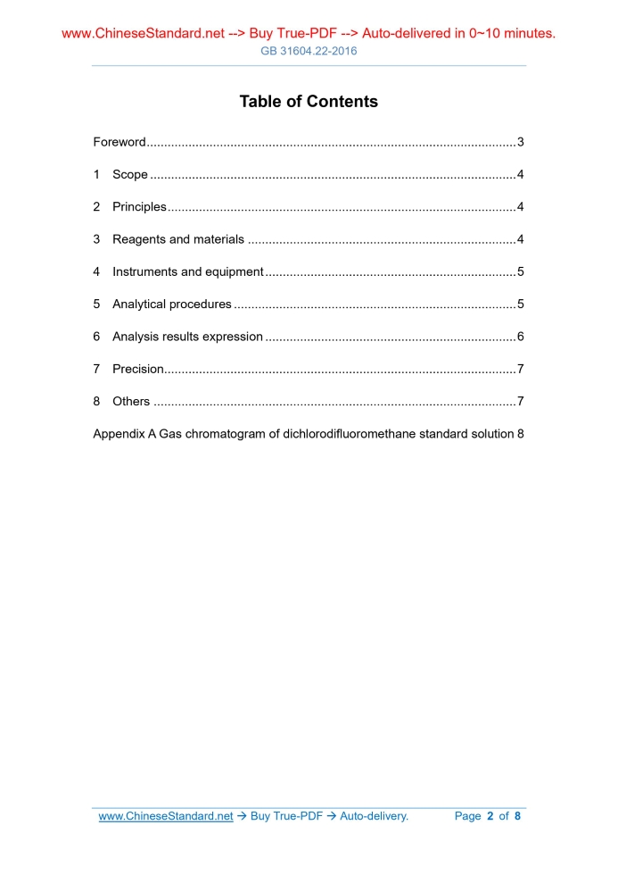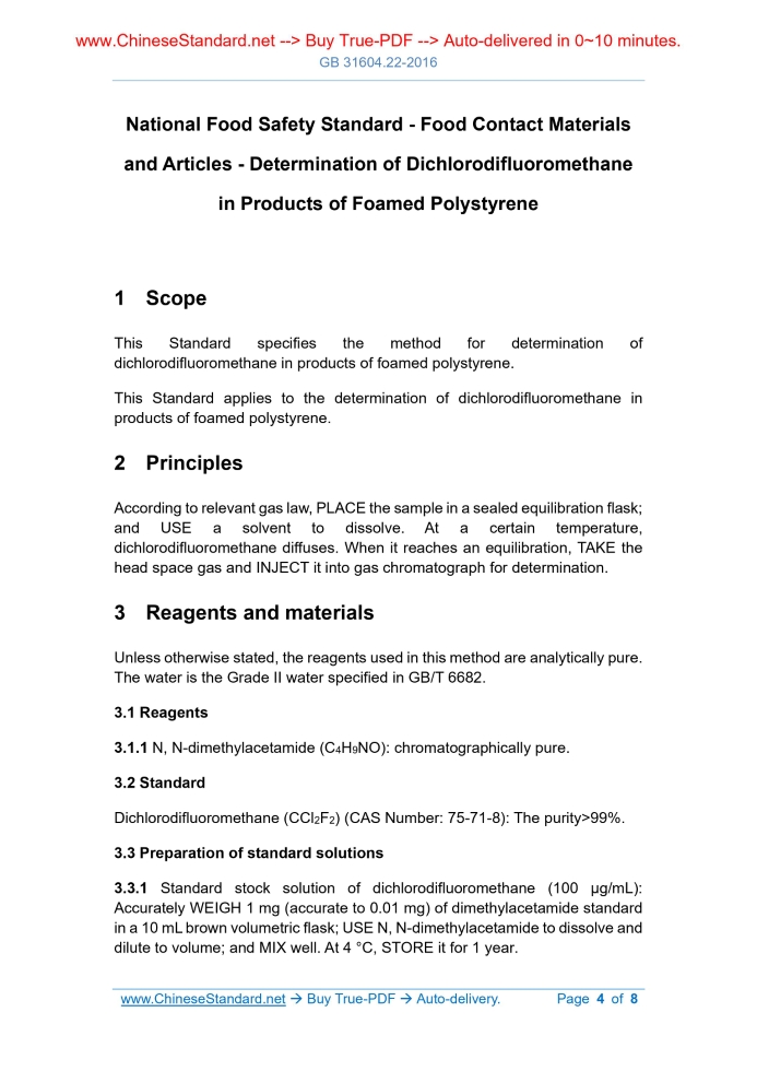 Similar standardsGB 31604.22-2016: Method for analysis of hygienic standard of products of foamed polystyrene for food packaging---This is an excerpt. Full copy of true-PDF in English version (including equations, symbols, images, flow-chart, tables, and figures etc.), auto-downloaded/delivered in 9 seconds, can be purchased online: https://www.ChineseStandard.net/PDF.aspx/GB31604.22-2016 GB NATIONAL STANDARD OF THE PEOPLE’S REPUBLIC OF CHINA National Food Safety Standard - Food Contact Materials and Articles - Determination of Dichlorodifluoromethane in Products of Foamed Polystyrene Issued on: OCTOBER 19, 2016 Implemented on: APRIL 19, 2017 Issued by. National Health and Family Planning Commission of the PRC Table of ContentsForeword . 3 1 Scope .. 4 2 Principles . 4 3 Reagents and materials .. 4 4 Instruments and equipment . 5 5 Analytical procedures . 5 6 Analysis results expression . 6 7 Precision. 7 8 Others . 7 Appendix A Gas chromatogram of dichlorodifluoromethane standard solution 8 National Food Safety Standard - Food Contact Materials and Articles - Determination of Dichlorodifluoromethane in Products of Foamed Polystyrene1 ScopeThis Standard specifies the method for determination of dichlorodifluoromethane in products of foamed polystyrene. This Standard applies to the determination of dichlorodifluoromethane in products of foamed polystyrene.2 PrinciplesAccording to relevant gas law, PLACE the sample in a sealed equilibration flask; and USE a solvent to dissolve. At a certain temperature, dichlorodifluoromethane diffuses. When it reaches an equilibration, TAKE the head space gas and INJECT it into gas chromatograph for determination.3 Reagents and materialsUnless otherwise stated, the reagents used in this method are analytically pure. The water is the Grade II water specified in GB/T 6682. 3.1 Reagents 3.1.1 N, N-dimethylacetamide (C4H9NO). chromatographically pure. 3.2 Standard Dichlorodifluoromethane (CCl2F2) (CAS Number. 75-71-8). The purity >99%. 3.3 Preparation of standard solutions 3.3.1 Standard stock solution of dichlorodifluoromethane (100 μg/mL). Accurately WEIGH 1 mg (accurate to 0.01 mg) of dimethylacetamide standard in a 10 mL brown volumetric flask; USE N, N-dimethylacetamide to dissolve and dilute to volume; and MIX well. At 4 °C, STORE it for 1 year. c) Inlet temperature. 250 °C; d) Detector temperature. 300 °C; e) Carrier gas. nitrogen; the purity is greater than or equal to 99.999%. Constant current mode; flow rate. 1.0 mL/min; f) Injection volume. 1.0 mL, split injection; the split ratio is 20.1; g) Make-up gas. nitrogen, 60 mL/min. 5.3 Making of standard curve ADD 3 mL of N, N-dimethylacetamide in each of 5 equilibration flasks; CAP the plugs; USE a microsyringe to take 0 μL, 3 μL, 15 μL, 30 μL, 150 μL, 300 μL of standard working solution of dichlorodifluoromethane (1 μg/mL) and INJECT into the flasks through rubber plug; gently SHAKE well and PUT in a constant temperature water bath at 65 °C to equilibrate for 15 min. The standard curve concentrations are 0 ng/mL, 1 ng/mL, 5 ng/mL, 10 ng/mL, 50 ng/mL,100 ng/mL. Respectively TAKE 1 mL of the head space gas and INJECT into gas chromatograph; TAKE the dichlorodifluoromethane content as the abscissa; TAKE the peak area as the ordinate and DRAW standard curve. The gas chromatogram of dichlorodifluoromethane standard solution is as shown in Figure A.1. 5.4 Determination of sample solution Manually or automatically INJECT the head space gas, which contains 1 mL of the sample, into gas chromatograph to determine; and OBTAIN the peak area. According to the standard curve, OBTAIN the content of dichlorodifluoromethane in the sample solution. At the same time, CARRY out blank test.6 Analysis results expressionThe content of dichlorodifluoromethane in the sample is calculated according to the equation (1). Where. X - The content of dichlorodifluoromethane in the sample, in micrograms per kilogram (mg/kg); ......Source: Above contents are excerpted from the full-copy PDF -- translated/reviewed by: www.ChineseStandard.net / Wayne Zheng et al. Tips & Frequently Asked Questions:Question 1: How long will the true-PDF of English version of GB 31604.22-2016 be delivered?Answer: The full copy PDF of English version of GB 31604.22-2016 can be downloaded in 9 seconds, and it will also be emailed to you in 9 seconds (double mechanisms to ensure the delivery reliably), with PDF-invoice.Question 2: Can I share the purchased PDF of GB 31604.22-2016_English with my colleagues?Answer: Yes. The purchased PDF of GB 31604.22-2016_English will be deemed to be sold to your employer/organization who actually paid for it, including your colleagues and your employer's intranet.Question 3: Does the price include tax/VAT?Answer: Yes. Our tax invoice, downloaded/delivered in 9 seconds, includes all tax/VAT and complies with 100+ countries' tax regulations (tax exempted in 100+ countries) -- See Avoidance of Double Taxation Agreements (DTAs): List of DTAs signed between Singapore and 100+ countriesQuestion 4: Do you accept my currency other than USD?Answer: Yes. www.ChineseStandard.us -- GB 31604.22-2016 -- Click this link and select your country/currency to pay, the exact amount in your currency will be printed on the invoice. Full PDF will also be downloaded/emailed in 9 seconds.How to buy and download a true PDF of English version of GB 31604.22-2016?A step-by-step guide to download PDF of GB 31604.22-2016_EnglishStep 1: Visit website https://www.ChineseStandard.net (Pay in USD), or https://www.ChineseStandard.us (Pay in any currencies such as Euro, KRW, JPY, AUD).Step 2: Search keyword "GB 31604.22-2016". Step 3: Click "Add to Cart". If multiple PDFs are required, repeat steps 2 and 3 to add up to 12 PDFs to cart. Step 4: Select payment option (Via payment agents Stripe or PayPal). Step 5: Customize Tax Invoice -- Fill up your email etc. Step 6: Click "Checkout". Step 7: Make payment by credit card, PayPal, Google Pay etc. A