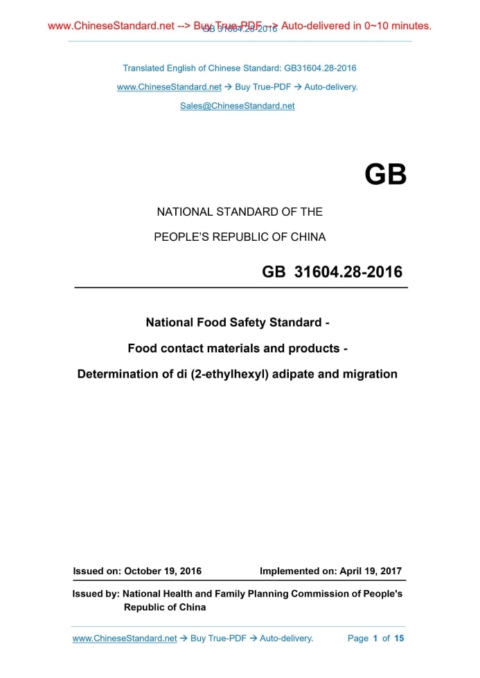 GB 31604.28-2016: National food safety standard - Food contact materials and products - Determination of di (2-ethylhexyl) adipate and migration Delivery: 9 seconds. True-PDF full-copy in English & invoice will be downloaded + auto-delivered via email. See step-by-step procedure Status: Valid