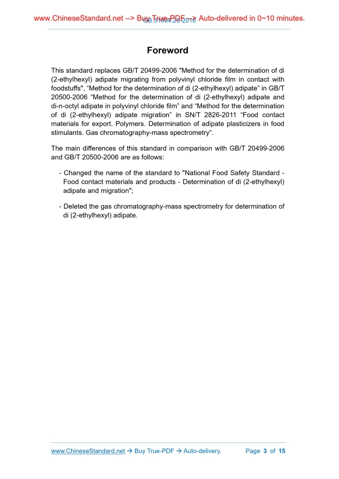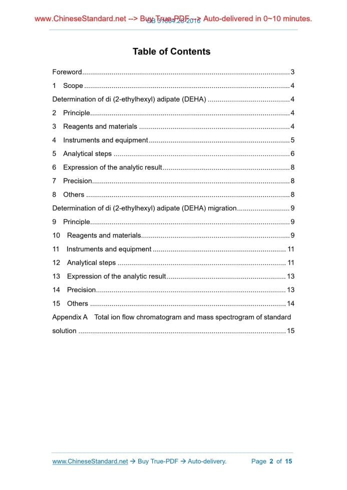 Similar standardsGB 31604.28-2016: National food safety standard - Food contact materials and products - Determination of di (2-ethylhexyl) adipate and migration---This is an excerpt. Full copy of true-PDF in English version (including equations, symbols, images, flow-chart, tables, and figures etc.), auto-downloaded/delivered in 9 seconds, can be purchased online: https://www.ChineseStandard.net/PDF.aspx/GB31604.28-2016 GB NATIONAL STANDARD OF THE PEOPLE’S REPUBLIC OF CHINA National Food Safety Standard - Food contact materials and products - Determination of di (2-ethylhexyl) adipate and migration Issued on: OCTOBER 19, 2016 Implemented on: APRIL 19, 2017 Issued by. National Health and Family Planning Commission of People's Republic of China Table of ContentsForeword ... 3 1 Scope ... 4 Determination of di (2-ethylhexyl) adipate (DEHA) ... 4 2 Principle... 4 3 Reagents and materials ... 4 4 Instruments and equipment ... 5 5 Analytical steps ... 6 6 Expression of the analytic result ... 8 7 Precision... 8 8 Others ... 8 Determination of di (2-ethylhexyl) adipate (DEHA) migration ... 9 9 Principle... 9 10 Reagents and materials... 9 11 Instruments and equipment ... 11 12 Analytical steps ... 11 13 Expression of the analytic result ... 13 14 Precision ... 13 15 Others ... 14 Appendix A Total ion flow chromatogram and mass spectrogram of standard solution ... 15ForewordThis standard replaces GB/T 20499-2006 "Method for the determination of di (2-ethylhexyl) adipate migrating from polyvinyl chloride film in contact with foodstuffs", “Method for the determination of di (2-ethylhexyl) adipate” in GB/T 20500-2006 “Method for the determination of di (2-ethylhexyl) adipate and di-n-octyl adipate in polyvinyl chloride film” and “Method for the determination of di (2-ethylhexyl) adipate migration” in SN/T 2826-2011 “Food contact materials for export. Polymers. Determination of adipate plasticizers in food stimulants. Gas chromatography-mass spectrometry”. The main differences of this standard in comparison with GB/T 20499-2006 and GB/T 20500-2006 are as follows. - Changed the name of the standard to "National Food Safety Standard - Food contact materials and products - Determination of di (2-ethylhexyl) adipate and migration"; - Deleted the gas chromatography-mass spectrometry for determination of di (2-ethylhexyl) adipate. National Food Safety Standard - Food contact materials and products - Determination of di (2-ethylhexyl) adipate and migration1 ScopeThis standard specifies the methods of determination of di (2-ethylhexyl) adipate (DEHA) and migration in food contact materials and products. This standard is applicable to the determination of di (2-ethylhexyl) adipate and migration in polyvinyl chloride products. Determination of di (2-ethylhexyl) adipate (DEHA)2 PrincipleDissolve the sample with tetrahydrofuran and precipitate the polymer by methanol. After filtration, DEHA remains in the filtrate. Determine by gas chromatography-mass spectrometer and quantify by external standard method.3 Reagents and materials3.1 Reagent Unless otherwise stated, the reagents used in this method shall be analytical pure. The water shall be the primary water specified in GB/T 6682. 3.1.1 Tetrahydrofuran (C4H8O, CAS No..109-99-9) 3.1.2 Methanol (CH4O,CAS No..67-56-1) 3.1.3 N-hexane (C6H12,CAS No..110-54-3). Chromatographic pure 3.2 Standard product di (2-ethylhexyl) adipate (C22H42O4, CAS No.. 103-23-1). purity≥99.8%, or a standard substance certified by the State and granted the standard The mass spectrum conditions are as follows. a) Mass spectrum interface temperature. 250°C; b) Temperature of ion source. 250°C; c) Ionization mode. EI; d) Ionization energy. 70 eV; e) Determination method. select the ion monitoring mode, the monitoring ion range(m/z) of DEHA. 40~370, the DEHA characteristic ions of are. 129, 147, 112, 71, of which 129 is quantitative ion; f) Solvent delay by. 5 min. 5.5 Making of standard curve According to the determination conditions listed in 5.4, inject the standard working solution (3.3.3) into the gas chromatography-mass spectrometer in turn. The standard curve was drawn with the concentration of the standard working solution as the horizontal coordinate with the unit of mg per liter (mg/L), and the corresponding peak area of DEHA as the vertical coordinate. See figure A.1. for a standard chromatogram. 5.6 Determination of sample solution 5.6.1 Qualitative determination In accordance with the determination conditions listed in 5.4, inject the sample solution (5.2) and the blank solution (5.3) into the gas chromatography-mass spectrometer for determination. When determine the sample under the same experimental conditions, if the deviation of the chromatographic peak retention time of the substance to be determined in the sample solution is within ±2.5% of the chromatographic peak retention time of the standard substance; and all the selected ions appear in the sample mass spectrometry after background subtraction; and the deviation of the relative abundance of the qualitative ion in the sample spectrum compared with the relative abundance of the qualitative ion in the standard solution with similar concentration does not exceed the range specified in Table 1, then it can be determined that there is such substance in the sample. The characteristic ions and their abundance ratios of DEHA are shown in Table 2. For DEHA chromatogram see figure A.2. Table 1 -- Maximum allowable deviation of relative ion abundance in qualitative confirmation Relative ion abundance K /% >50 20~50 10~20 ≤10 DEHA concentration of 2mg/mL is obtained. Store the solution in the refrigerator for validity period of 1 month. 10.4.2 DEHA standard intermediate solution (Water, acidic, alcohol based food simulants analysis) Draw 2.5mL DEHA standard reserve solution (10.4.1) with graduated pipette to 50mL volumetric bottle, dilute to the scale with n-hexane. The standard intermediate solution of DE