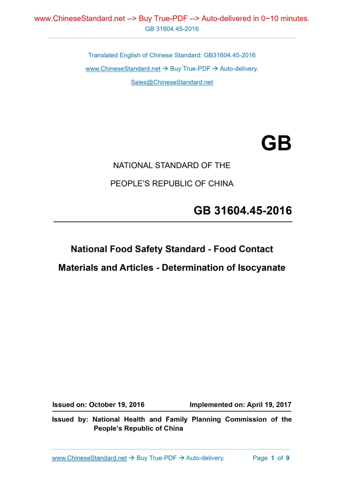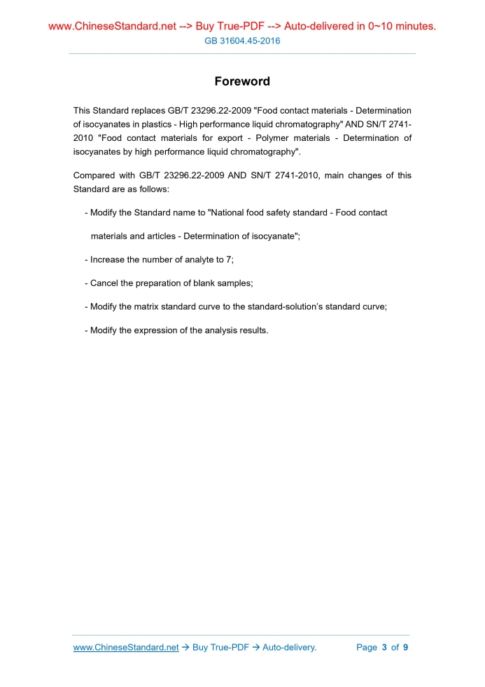 GB 31604.45-2016: Food contact materials for export -- Polymer materials -- Determination of isocyanates by high performance liquid chromatography Delivery: 9 seconds. True-PDF full-copy in English & invoice will be downloaded + auto-delivered via email. See step-by-step procedure Status: Valid