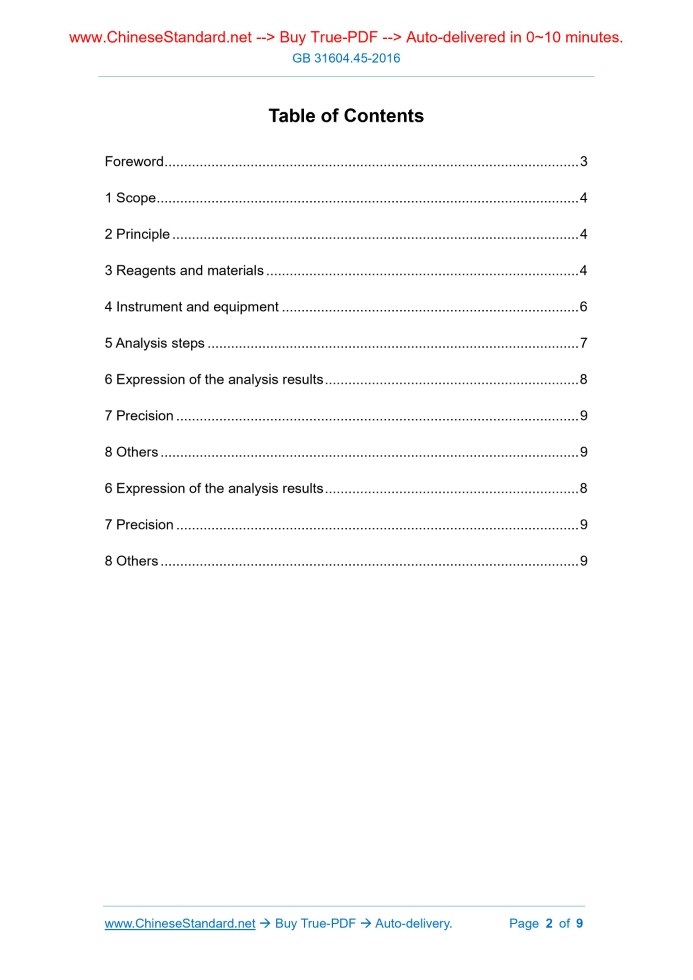 Similar standardsGB 31604.45-2016: Food contact materials for export -- Polymer materials -- Determination of isocyanates by high performance liquid chromatography---This is an excerpt. Full copy of true-PDF in English version (including equations, symbols, images, flow-chart, tables, and figures etc.), auto-downloaded/delivered in 9 seconds, can be purchased online: https://www.ChineseStandard.net/PDF.aspx/GB31604.45-2016 GB NATIONAL STANDARD OF THE PEOPLE’S REPUBLIC OF CHINA National Food Safety Standard - Food Contact Materials and Articles - Determination of Isocyanate Issued on: OCTOBER 19, 2016 Implemented on: APRIL 19, 2017 Issued by. National Health and Family Planning Commission of the People’s Republic of China Table of ContentsForeword . 3 1 Scope .. 4 2 Principle . 4 3 Reagents and materials . 4 4 Instrument and equipment . 6 5 Analysis steps . 7 6 Expression of the analysis results .. 8 7 Precision . 9 8 Others . 9 6 Expression of the analysis results .. 8 7 Precision . 9 8 Others . 9 Foreword This Standard replaces GB/T 23296.22-2009 "Food contact materials - Determination of isocyanates in plastics - High performance liquid chromatography" AND SN/T 2741- 2010 "Food contact materials for export - Polymer materials - Determination of isocyanates by high performance liquid chromatography". Compared with GB/T 23296.22-2009 AND SN/T 2741-2010, main changes of this Standard are as follows. - Modify the Standard name to "National food safety standard - Food contact materials and articles - Determination of isocyanate"; - Increase the number of analyte to 7; - Cancel the preparation of blank samples; - Modify the matrix standard curve to the standard-solution’s standard curve; - Modify the expression of the analysis results. National Food Safety Standard - Food Contact Materials and Articles - Determination of Isocyanate1 ScopeThis Standard specifies the determination methods for toluene-2,6-diisocyanate, diphenylmethane-4,4'-diisocyanate, toluene-2,4-diisocyanate, naphthalene-1,5- diisocyanate, phenyl isocyanate, hexamethylene diisocyanate and cyclohexyl isocyanate in plastics for food contact material and their products; this Standard specifies the determination method for the total amount of the above 7 isocyanates. This Standard applies to the detection of toluene-2,6-diisocyanate, diphenylmethane- 4,4'-diisocyanate, toluene-2,4-diisocyanate, naphthalene-1,5-diisocyanate, phenyl isocyanate, hexamethylene diisocyanate and cyclohexyl isocyanate in polyurethane plastics and their products; this Standard applies to the detection of the total amount of the above 7 isocyanates.2 PrincipleIn the sample, after isocyanate is vibrated-extracted by dichloromethane, isocyanate starts derivative reaction with 9-N-methylaminomethyl hydrazine. The derivatized products are separated by C18 liquid chromatography column, determined by fluorescence detector AND quantified by external standard method.3 Reagents and materialsUnless otherwise specified, all reagents shall be the analytically pure. The water shall be the Grade-1 water specified in GB/T 6682. 3.1 Reagents 3.1.1 Dichloromethane (CH2Cl2). it shall be dried by 5A molecular sieves, stay for overnight for standby application. 3.1.2 Ethyl ether (C2H6O). 3.1.3 Phosphoric acid (HPO3). 3.1.4 Acetonitrile (C2H3N). chromatographic purity. 3.4 Preparation of the standard solution 3.4.1 Isocyanate stock solution (1000 mg/L). weigh and take 0.01 g (accurate to 0.1 mg) of various isocyanate standard materials; dissolve the dichloromethane; then transfer it to a volumetric flask of 10 mL; dilute the dichloromethane to the constant volume. Stock solution shall be stored at -20 °C under dry preservation; it shall be kept from the light. The term of validity is 1 month. 3.4.2 Standard intermediate-solution of isocyanate (100 mg/L). respectively weigh and take 5mL of dichloromethane in six 10 mL volumetric flasks; respectively transfer them into various 1.0 mL of isocyanate stock solution; dilute them to the constant volume with dichloromethane. The standard intermediate-solution shall be stored at -20 °C under dry preservation; it shall be kept from the light. The term of validity is 1 month. 3.4.3 Standard working solution of Isocyanate (1 mg/L). respectively weigh and take 5mL of dichloromethane into six 10mL volumetric flasks; respectively add 100 μL of various standard intermediate-solutions of isocyanate; dilute them to the constant volume with dichloromethane; mix them evenly. Standard working solution shall be stored at -20 °C under dry preservation; it shall be kept from the light. The term of validity is 2 weeks. 3.4.4 Standard working solution of mixed isocyanate. respectively weigh and take 5 mL of dichloromethane into six 10 mL volumetric flasks; successively add 0.00 mL, 0.01 mL, 0.05 mL, 0.10 mL, 0.25 mL and 0.50 mL of various standard intermediate- solutions of isocyanate; dilute them to the constant volume with dichloromethane; mix them evenly; the mixed standard working solutions whose isocyanate’s concentration are respectively 0 mg/L, 0.10 mg/L, 0.50 mg/L, 1.0 mg/L, 2.5 mg/L and 5.0 mg/L can be acquired. These mixed standard working solutions shall be stored at -20 °C under dry preservation; they shall be kept from the light. The term of validity is 2 weeks.4 Instrument and equipment4.1 Liquid chromatograph. configure the fluorescence detector. 4.2 Glass bottle. 20 mL, with PTFE cap; it should be dried before use. 4.3 Aqueous filter membrane. 0.45 μm. 4.4 pH meter. 4.5 Analytical balance. the sensitivity shall be 0.0001 g and 0.01 g. ......Source: Above contents are excerpted from the full-copy PDF -- translated/reviewed by: www.ChineseStandard.net / Wayne Zheng et al. Tips & Frequently Asked Questions:Question 1: How long will the true-PDF of English version of GB 31604.45-2016 be delivered?Answer: The full copy PDF of English version of GB 31604.45-2016 can be downloaded in 9 seconds, and it will also be emailed to yo