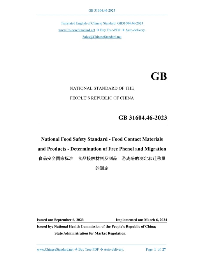 GB 31604.46-2023: National food safety standard - Food contact materials and products - Determination of free phenol and migration Delivery: 9 seconds. True-PDF full-copy in English & invoice will be downloaded + auto-delivered via email. See step-by-step procedure Status: Valid GB 31604.46: Historical versions
