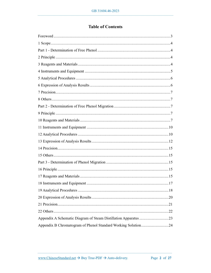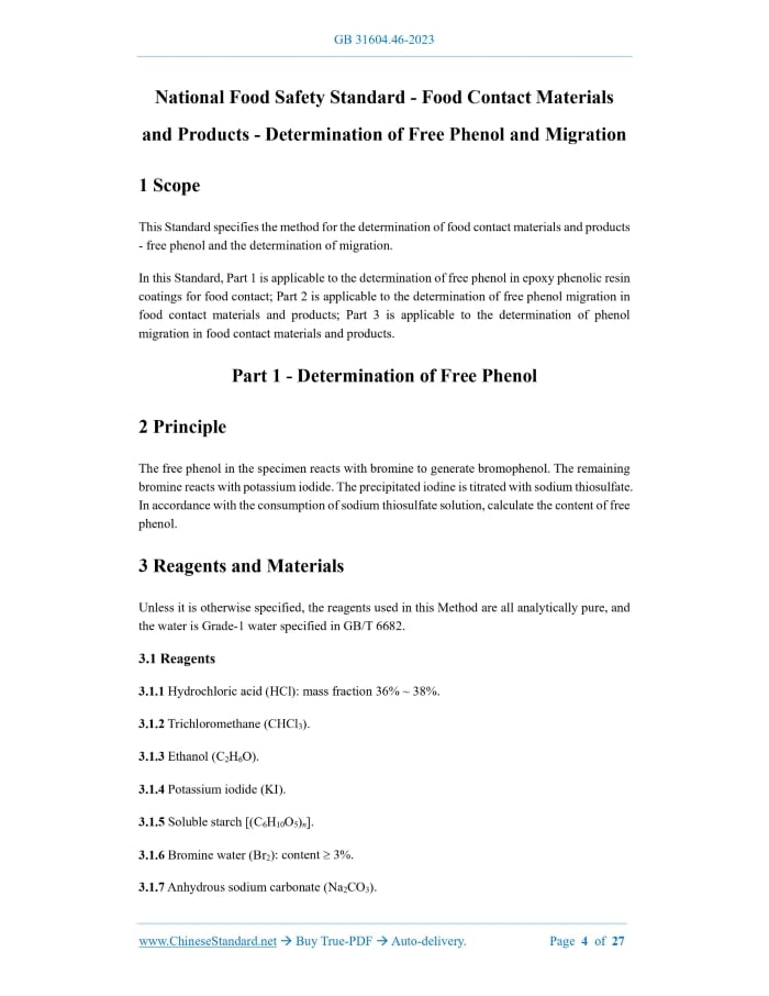 Similar standardsGB 31604.46-2023: National food safety standard - Food contact materials and products - Determination of free phenol and migration---This is an excerpt. Full copy of true-PDF in English version (including equations, symbols, images, flow-chart, tables, and figures etc.), auto-downloaded/delivered in 9 seconds, can be purchased online: https://www.ChineseStandard.net/PDF.aspx/GB31604.46-2023 GB NATIONAL STANDARD OF THE PEOPLE’S REPUBLIC OF CHINA National Food Safety Standard - Food Contact Materials and Products - Determination of Free Phenol and Migration Issued on. SEPTEMBER 6, 2023 Implemented on. MARCH 6, 2024 Issued by. National Health Commission of the People’s Republic of China; State Administration for Market Regulation. Table of ContentsForeword... 3 1 Scope... 4 Part 1 - Determination of Free Phenol... 4 2 Principle... 4 3 Reagents and Materials... 4 4 Instruments and Equipment... 5 5 Analytical Procedures... 6 6 Expression of Analysis Results... 6 7 Precision... 7 8 Others... 7 Part 2 - Determination of Free Phenol Migration... 7 9 Principle... 7 10 Reagents and Materials... 7 11 Instruments and Equipment... 10 12 Analytical Procedures... 10 13 Expression of Analysis Results... 12 14 Precision... 15 15 Others... 15 Part 3 - Determination of Phenol Migration... 15 16 Principle... 15 17 Reagents and Materials... 15 18 Instruments and Equipment... 17 19 Analytical Procedures... 18 20 Expression of Analysis Results... 20 21 Precision... 21 22 Others... 22 Appendix A Schematic Diagram of Steam Distillation Apparatus... 23 Appendix B Chromatogram of Phenol Standard Working Solution... 24ForewordThis Standard serves as a replacement of GB 31604.46-2016 National Food Safety Standard - Food Contact Materials and Articles - Determination of Free Phenols and Determination of Migration. In comparison with GB 31604.46-2016, the main changes are as follows. ---The Scope is modified; ---The detection limit and quantitation limit in Part 1 are modified; ---The analytical procedures and result expression in Part 2 are modified; ---Part 3 - The Determination of Phenol Migration is added. National Food Safety Standard - Food Contact Materials and Products - Determination of Free Phenol and Migration1 ScopeThis Standard specifies the method for the determination of food contact materials and products - free phenol and the determination of migration. In this Standard, Part 1 is applicable to the determination of free phenol in epoxy phenolic resin coatings for food contact; Part 2 is applicable to the determination of free phenol migration in food contact materials and products; Part 3 is applicable to the determination of phenol migration in food contact materials and products. Part 1 - Determination of Free Phenol2 PrincipleThe free phenol in the specimen reacts with bromine to generate bromophenol. The remaining bromine reacts with potassium iodide. The precipitated iodine is titrated with sodium thiosulfate. In accordance with the consumption of sodium thiosulfate solution, calculate the content of free phenol.3 Reagents and MaterialsUnless it is otherwise specified, the reagents used in this Method are all analytically pure, and the water is Grade-1 water specified in GB/T 6682. 3.1 Reagents 3.1.1 Hydrochloric acid (HCl). mass fraction 36% ~ 38%. 3.1.2 Trichloromethane (CHCl3). 3.1.3 Ethanol (C2H6O). 3.2 Preparation of Reagents 3.3 Reference Materials 3.3.1 Sodium thiosulfate pentahydrate (Na2S2O3 5H2O, CAS No.. 10102-17-7). working reference reagent, or a standard substance certified by the state and awarded a reference material certificate. 3.3.2 Potassium bromate (KBrO3, CAS No.. 7758-01-2). working reference reagent, or a standard substance certified by the state and awarded a reference material certificate. 3.4 Preparation of Standard Solutions4 Instruments and Equipment4.1 Balance. with a division value of 0.01 g and 0.1 mg, respectively.5 Analytical Procedures5.1 Distillation of Specimens Weigh-take 1.0 g (accurate to 0.01 g) of epoxy phenolic resin coating specimen for food contact, put it into a distillation bottle, add 20 mL of ethanol to dissolve it (for water-based modified epoxy resin coatings, add 20 mL of water). Add 50 mL of water, then, use steam to distill off free phenol. Collect the distilled solution in a 500 mL conical flash. Within 40 min ~ 50 min, distill 300 mL ~ 400 mL of distilled liquid. 5.2 Titration Transfer-take 100 mL of distilled liquid, place it in a 500 mL stoppered conical flask, add 25 mL of bromine standard solution and 5 mL of hydrochloric acid. At room temperature, use a stopper to cover it to avoid light, and react for 15 min. 5.3 Blank Test Take 20 mL of ethanol and use water to dilute it to 500 mL, then, transfer-take 100 mL of the diluted solution (for water-based modified epoxy resin coatings, transfer-take 100 mL of water). In accordance with the method of 5.2, conduct the determination.6 Expression of Analysis ResultsThe content of free phenol in the sample is calculated in accordance with Formula (1).7 PrecisionThe absolute difference between the results of two independent determinations obtained under repeatability conditions shall not exceed 5% of the arithmetic mean.8 OthersIn this method, the detection limit is 0.4 g/kg and the quantitation limit is 2.0 g/kg.9 PrincipleUnder alkaline conditions (pH 9.0 ~ 10.5), free phenol reacts with 4-aminoantipyrine under the catalysis of potassium ferricyanide to generate antipyrine dye. The antipyrine dye in water is extracted with chloroform.10 Reagents and MaterialsUnless it is otherwise specified, the reagents used in this Method are all analytically pure, and the water is Grade-1 water specified in GB/T 6682. 10.1 Reagents 10.1.1 Absolute ethanol (C2H6O). 10.1.2 Glacial acetic acid (C2H4O2). 10.1.3 Isooctane (C8H18). 10.2 Preparation of Reagents 10.2.1 Water-based food simulants. in accordance with the stipulations of GB 5009.156, conduct the preparation. 10.3 Reference Material 