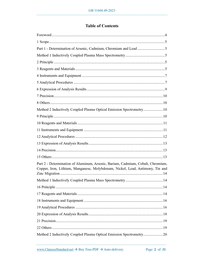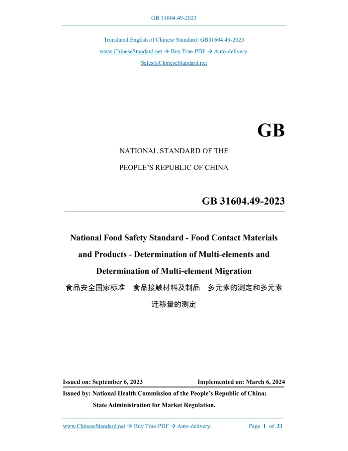 GB 31604.49-2023: National food safety standard - Food contact materials and products - Determination of multi-elements and determination of multi-element migration Delivery: 9 seconds. True-PDF full-copy in English & invoice will be downloaded + auto-delivered via email. See step-by-step procedure Status: Valid GB 31604.49: Historical versions