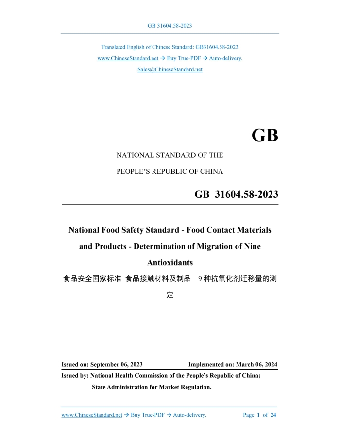 GB 31604.58-2023: National food safety standard - Food contact materials and products - Determination of migration of nine antioxidants Delivery: 9 seconds. True-PDF full-copy in English & invoice will be downloaded + auto-delivered via email. See step-by-step procedure Status: Valid