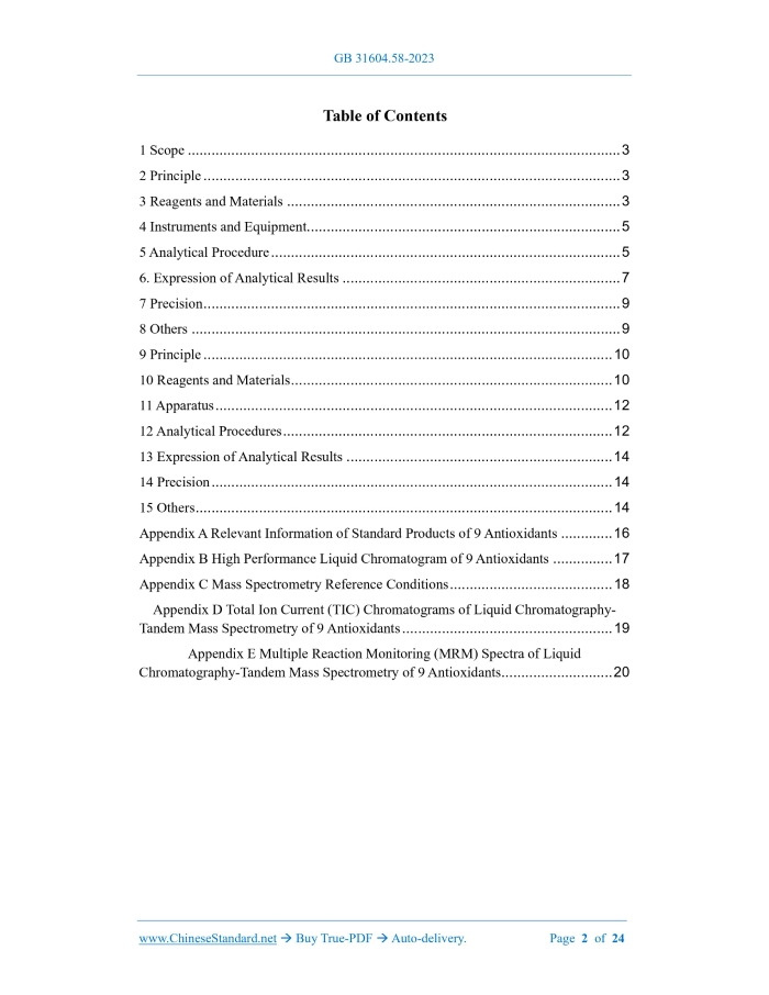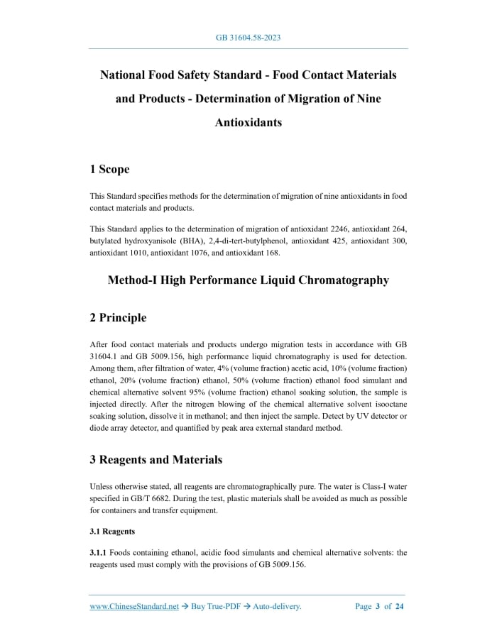 Similar standardsGB 31604.58-2023: National food safety standard - Food contact materials and products - Determination of migration of nine antioxidants---This is an excerpt. Full copy of true-PDF in English version (including equations, symbols, images, flow-chart, tables, and figures etc.), auto-downloaded/delivered in 9 seconds, can be purchased online: https://www.ChineseStandard.net/PDF.aspx/GB31604.58-2023 GB NATIONAL STANDARD OF THE PEOPLE’S REPUBLIC OF CHINA National Food Safety Standard - Food Contact Materials and Products - Determination of Migration of Nine Antioxidants Issued on: SEPTEMBER 06, 2023 Implemented on: MARCH 06, 2024 Issued by. National Health Commission of the People’s Republic of China; State Administration for Market Regulation. Table of Contents1 Scope... 3 2 Principle... 3 3 Reagents and Materials... 3 4 Instruments and Equipment... 5 5 Analytical Procedure... 5 6.Expression of Analytical Results... 7 7 Precision... 9 8 Others... 9 9 Principle... 10 10 Reagents and Materials... 10 11 Apparatus... 12 12 Analytical Procedures... 12 13 Expression of Analytical Results... 14 14 Precision... 14 15 Others... 14 Appendix A Relevant Information of Standard Products of 9 Antioxidants... 16 Appendix B High Performance Liquid Chromatogram of 9 Antioxidants... 17 Appendix C Mass Spectrometry Reference Conditions... 18 Appendix D Total Ion Current (TIC) Chromatograms of Liquid Chromatography- Tandem Mass Spectrometry of 9 Antioxidants... 19 Appendix E Multiple Reaction Monitoring (MRM) Spectra of Liquid Chromatography-Tandem Mass Spectrometry of 9 Antioxidants... 20 National Food Safety Standard - Food Contact Materials and Products - Determination of Migration of Nine Antioxidants1 ScopeThis Standard specifies methods for the determination of migration of nine antioxidants in food contact materials and products. This Standard applies to the determination of migration of antioxidant 2246, antioxidant 264, butylated hydroxyanisole (BHA), 2,4-di-tert-butylphenol, antioxidant 425, antioxidant 300, antioxidant 1010, antioxidant 1076, and antioxidant 168. Method-I High Performance Liquid Chromatography2 PrincipleAfter food contact materials and products undergo migration tests in accordance with GB 31604.1 and GB 5009.156, high performance liquid chromatography is used for detection. Among them, after filtration of water, 4% (volume fraction) acetic acid, 10% (volume fraction) ethanol, 20% (volume fraction) ethanol, 50% (volume fraction) ethanol food simulant and chemical alternative solvent 95% (volume fraction) ethanol soaking solution, the sample is injected directly. After the nitrogen blowing of the chemical alternative solvent isooctane soaking solution, dissolve it in methanol; and then inject the sample. Detect by UV detector or diode array detector, and quantified by peak area external standard method.3 Reagents and MaterialsUnless otherwise stated, all reagents are chromatographically pure. The water is Class-I water specified in GB/T 6682.During the test, plastic materials shall be avoided as much as possible for containers and transfer equipment. 3.1 Reagents 3.1.1 Foods containing ethanol, acidic food simulants and chemical alternative solvents. the reagents used must comply with the provisions of GB 5009.156. 3.1.2 Methanol (CH4O). 3.1.3 Ethyl acetate (C4H8O2). 3.2 Preparation of reagent Foods containing ethanol, acidic food simulants and chemical alternative solvents. Prepared according to the requirements of GB 5009.156. 3.3 Standard product 9 antioxidant standard products (see Table A.1 in Appendix A), with purity ≥98%, or standard products certified by the country and awarded a reference material certificate. 3.4 Preparation of standard solution 3.4.1 9 Antioxidant standard stock solutions (1000 mg/L). Accurately weigh 25mg of each of the 9 antioxidant standard products (accurate to 0.1mg); dissolve them in 1mL of ethyl acetate. And then transfer to 9 pieces of 25mL brown volumetric flask; and make constant volume by adding methanol and shake well. Transfer the solution to a brown glass container and store it in an airtight container away from light in a 4°C refrigerator. The shelf life is 6 months. 3.4.2 9 antioxidant standard intermediate solution A (solvent is methanol). Accurately pipet 2.50mL of each of BHA and antioxidant 300 standard stock solutions, and 5.00mL of each of the other 7 antioxidants standard stock solutions into the same 50mL brown volumetric flask; make constant volume by methanol to obtain standard intermediate solution A of BHA and antioxidant 300 with mass concentration of 50.0 mg/L, and of the other 7 antioxidants with the mass concentration of 100 mg/L. Transfer the solution to a brown glass container and store it in an airtight container away from light in a 4°C refrigerator. The storage period is 3 months. 3.4.3 9 antioxidant standard intermediate solution B (solvent is ethyl acetate). Accurately pipet 2.50mL of each of BHA and antioxidant 300 standard stock solutions, and 5.00mL of each of the other 7 standard stock solutions into the same 50mL brown volumetric flask; make constant volume by ethyl acetate to obtain a standard intermediate solution B of BHA and antioxidant 300 with mass concentration of 50 mg/L, and the other 7 antioxidants with mass concentration of 100 mg/L. Transfer the solution to a brown glass container and store it in an airtight container away from light in a 4°C refrigerator. The storage period is 3 months. 3.4.4 Preparation of standard working solution 3.4.4.1 Chemical alternative solvent isooctane standard working solution Accurately transfer 0.03mL, 0.1mL, 0.3mL, 1mL, and 3mL of 9 antioxidant standard intermediate solutions B into 5 pieces of 10mL volumetric flasks; and make constant volume with isooctane to obtain the standard working solutions of BHA and antioxidant 300 with mass concentration of 0.15 mg/L, 0.50 mg/L, 1.5mg/L, 5mg/L, 15mg/L, respectively; and other 7 antioxidants with the ma