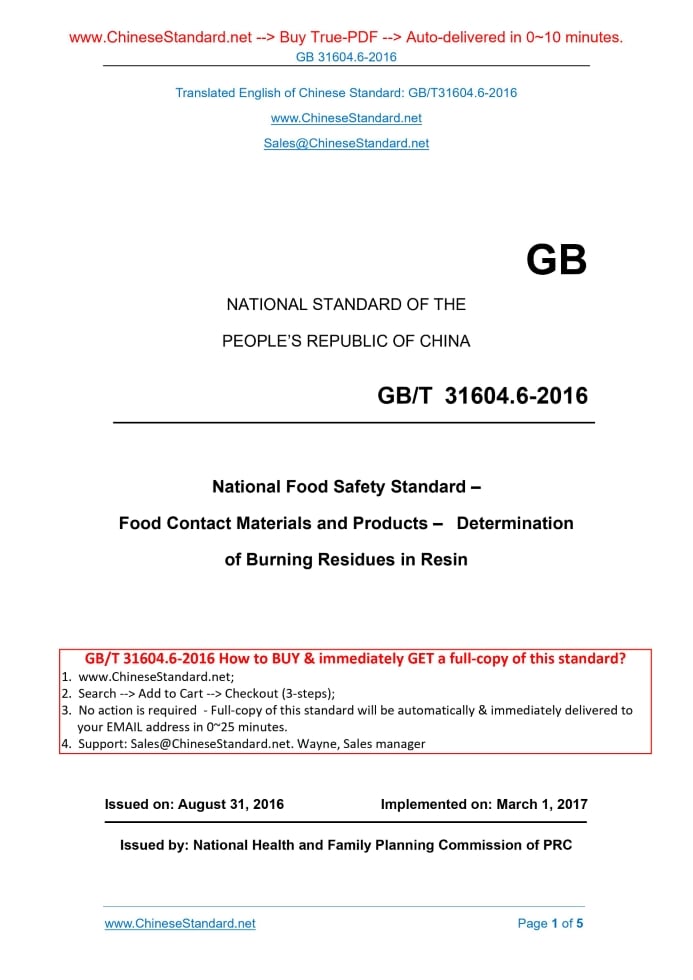 GB 31604.6-2016: National Food Safety Standard -- Food Contact Materials and Articles -- Determination of Ignition Residue in Resin Delivery: 9 seconds. True-PDF full-copy in English & invoice will be downloaded + auto-delivered via email. See step-by-step procedure Status: Valid
