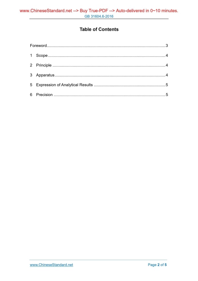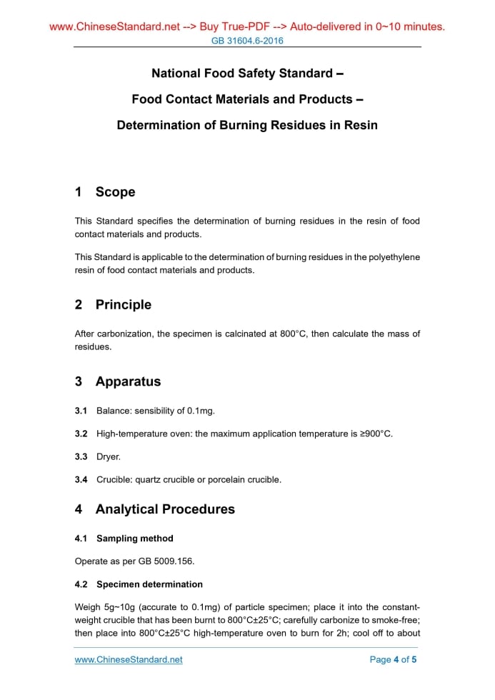 Similar standardsGB 31604.6-2016: National Food Safety Standard -- Food Contact Materials and Articles -- Determination of Ignition Residue in Resin---This is an excerpt. Full copy of true-PDF in English version (including equations, symbols, images, flow-chart, tables, and figures etc.), auto-downloaded/delivered in 9 seconds, can be purchased online: https://www.ChineseStandard.net/PDF.aspx/GB31604.6-2016 GB NATIONAL STANDARD OF THE PEOPLE’S REPUBLIC OF CHINA GB/T 31604.6-2016 National Food Safety Standard – Food Contact Materials and Products – Determination of Burning Residues in Resin Issued on: AUGUST 31, 2016 Implemented on: MARCH 1, 2017 Issued by. National Health and Family Planning Commission of PRC Table of ContentsForeword ... 3 1 Scope ... 4 2 Principle ... 4 3 Apparatus ... 4 5 Expression of Analytical Results ... 5 6 Precision ... 5 National Food Safety Standard – Food Contact Materials and Products – Determination of Burning Residues in Resin1 ScopeThis Standard specifies the determination of burning residues in the resin of food contact materials and products. This Standard is applicable to the determination of burning residues in the polyethylene resin of food contact materials and products.2 PrincipleAfter carbonization, the specimen is calcinated at 800°C, then calculate the mass of residues.3 Apparatus3.1 Balance. sensibility of 0.1mg. 3.2 High-temperature oven. the maximum application temperature is ≥900°C. 3.3 Dryer. 3.4 Crucible. quartz crucible or porcelain crucible. 4 Analytical Procedures 4.1 Sampling method Operate as per GB 5009.156. 4.2 Specimen determination Weigh 5g~10g (accurate to 0.1mg) of particle specimen; place it into the constant- weight crucible that has been burnt to 800°C±25°C; carefully carbonize to smoke-free; then place into 800°C±25°C high-temperature oven to burn for 2h; cool off to about ......Source: Above contents are excerpted from the full-copy PDF -- translated/reviewed by: www.ChineseStandard.net / Wayne Zheng et al. Tips & Frequently Asked Questions:Question 1: How long will the true-PDF of English version of GB 31604.6-2016 be delivered?Answer: The full copy PDF of English version of GB 31604.6-2016 can be downloaded in 9 seconds, and it will also be emailed to you in 9 seconds (double mechanisms to ensure the delivery reliably), with PDF-invoice.Question 2: Can I share the purchased PDF of GB 31604.6-2016_English with my colleagues?Answer: Yes. The purchased PDF of GB 31604.6-2016_English will be deemed to be sold to your employer/organization who actually paid for it, including your colleagues and your employer's intranet.Question 3: Does the price include tax/VAT?Answer: Yes. Our tax invoice, downloaded/delivered in 9 seconds, includes all tax/VAT and complies with 100+ countries' tax regulations (tax exempted in 100+ countries) -- See Avoidance of Double Taxation Agreements (DTAs): List of DTAs signed between Singapore and 100+ countriesQuestion 4: Do you accept my currency other than USD?Answer: Yes. www.ChineseStandard.us -- GB 31604.6-2016 -- Click this link and select your country/currency to pay, the exact amount in your currency will be printed on the invoice. Full PDF will also be downloaded/emailed in 9 seconds.How to buy and download a true PDF of English version of GB 31604.6-2016?A step-by-step guide to download PDF of GB 31604.6-2016_EnglishStep 1: Visit website https://www.ChineseStandard.net (Pay in USD), or https://www.ChineseStandard.us (Pay in any currencies such as Euro, KRW, JPY, AUD).Step 2: Search keyword "GB 31604.6-2016". Step 3: Click "Add to Cart". If multiple PDFs are required, repeat steps 2 and 3 to add up to 12 PDFs to cart. Step 4: Select payment option (Via payment agents Stripe or PayPal). Step 5: Customize Tax Invoice -- Fill up your email etc. Step 6: Click "Checkout". Step 7: Make payment by credit card, PayPal, Google Pay etc. After the payment is completed and in 9 seconds, you will receive 2 emails attached with the purchased PDFs and PDF-invoice, respectively. Step 8: Optional -- Go to download PDF. Step 9: Optional -- Click Open/Download PDF to download PDFs and invoice. See screenshots for above steps: Steps 1~3 Steps 4~6 Step 7 Step 8 Step 9 |