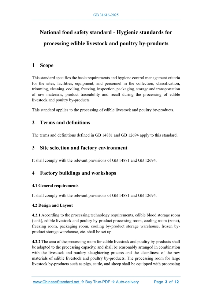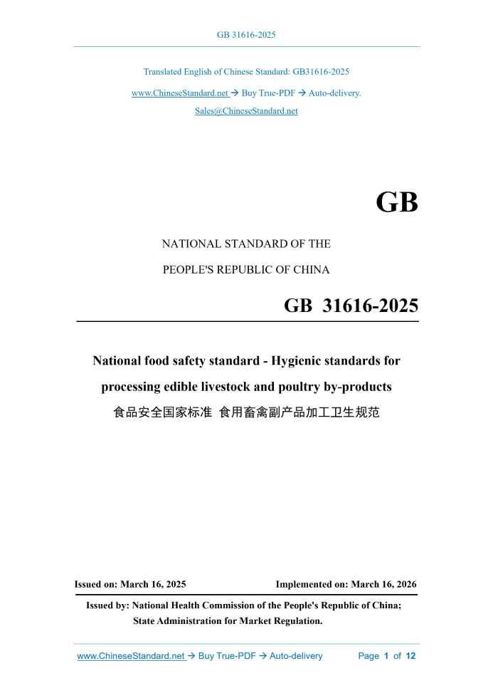 GB 31616-2025: National food safety standard - Hygienic code for processing edible livestock and poultry by-products Delivery: 9 seconds. True-PDF full-copy in English & invoice will be downloaded + auto-delivered via email. See step-by-step procedure Status: Valid