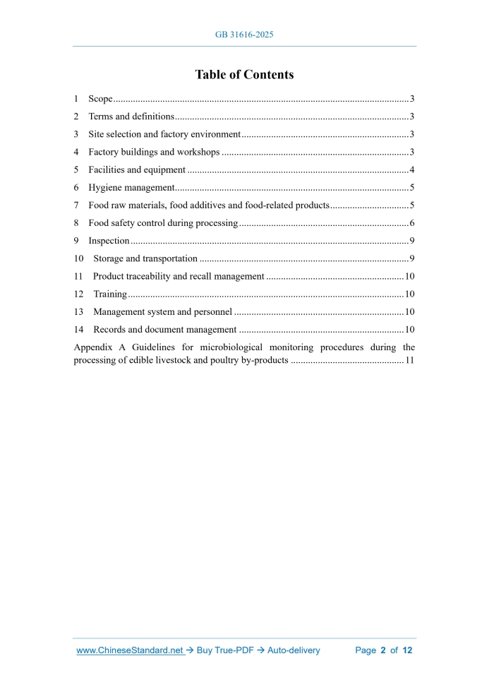 Similar standardsGB 31616-2025: National food safety standard - Hygienic code for processing edible livestock and poultry by-products---This is an excerpt. Full copy of true-PDF in English version (including equations, symbols, images, flow-chart, tables, and figures etc.), auto-downloaded/delivered in 9 seconds, can be purchased online: https://www.ChineseStandard.net/PDF.aspx/GB31616-2025 GB NATIONAL STANDARD OF THE PEOPLE'S REPUBLIC OF CHINA National food safety standard - Hygienic standards for processing edible livestock and poultry by-products Issued on: MARCH 16, 2025 Implemented on: MARCH 16, 2026 Issued by. National Health Commission of the People's Republic of China; State Administration for Market Regulation. Table of Contents1 Scope... 3 2 Terms and definitions... 3 3 Site selection and factory environment... 3 4 Factory buildings and workshops... 3 5 Facilities and equipment... 4 6 Hygiene management... 5 7 Food raw materials, food additives and food-related products... 5 8 Food safety control during processing... 6 9 Inspection... 9 10 Storage and transportation... 9 11 Product traceability and recall management... 10 12 Training... 10 13 Management system and personnel... 10 14 Records and document management... 10 Appendix A Guidelines for microbiological monitoring procedures during the processing of edible livestock and poultry by-products... 11 National food safety standard - Hygienic standards for processing edible livestock and poultry by-products1 ScopeThis standard specifies the basic requirements and hygiene control management criteria for the sites, facilities, equipment, and personnel in the collection, classification, trimming, cleaning, cooling, freezing, inspection, packaging, storage and transportation of raw materials, product traceability and recall during the processing of edible livestock and poultry by-products. This standard applies to the processing of edible livestock and poultry by-products.2 Terms and definitionsThe terms and definitions defined in GB 14881 and GB 12694 apply to this standard.3 Site selection and factory environmentIt shall comply with the relevant provisions of GB 14881 and GB 12694.4 Factory buildings and workshops4.1 General requirements It shall comply with the relevant provisions of GB 14881 and GB 12694. 4.2 Design and Layout 4.2.1 According to the processing technology requirements, edible blood storage room (tank), edible livestock and poultry by-product processing room, cooling room (zone), freezing room, packaging room, cooling by-product storage warehouse, frozen by- product storage warehouse, etc. shall be set up. 4.2.2 The area of the processing room for edible livestock and poultry by-products shall be adapted to the processing capacity, and shall be reasonably arranged in combination with the livestock and poultry slaughtering process and the cleanliness of the raw materials of edible livestock and poultry by-products. The processing room for large livestock by-products such as pigs, cattle, and sheep shall be equipped with processing rooms for organs such as heart, liver, and lungs, processing rooms for spleen, stomach, intestines, and bladder, and processing rooms for heads, hooves, and tails. The processing room for edible poultry and rabbit by-products shall be equipped with processing rooms (zones) for viscera, and processing rooms (zones) for heads and claws. 4.2.3 A temporary waste storage area shall be set up in the edible livestock and poultry by-product processing room. 4.2.4 There shall be separate dedicated exits for finished products and waste such as digestive tract contents. The dedicated exit for finished products shall be far away from the dedicated exit for waste.5 Facilities and equipment5.1 General requirements 5.1.1 It shall comply with the relevant provisions of GB 14881 and GB 12694. 5.1.2 Based on processing requirements, exhaust facilities shall be installed in areas where hot air or strong odors are generated. 5.2 Water supply and drainage facilities 5.2.1 According to the processing technology requirements, cold and hot water pipes shall be installed separately at the water use location of the edible livestock and poultry by-product processing room. The cold and hot water pipes shall be clearly distinguished and marked with the flow direction. 5.2.2 Drainage facilities shall be equipped according to the processing technology requirements. The floor drains of the workshop shall be equipped with solid waste collection and floor drains with water seals to prevent solid waste from clogging the drainage pipes and prevent foul air from escaping. 5.3 Cleaning and disinfection facilities 5.3.1 Cleaning and disinfection facilities shall be set up separately according to the different cleanliness requirements of edible livestock and poultry by-product processing areas. 5.3.2 Cleaning and disinfection facilities shall be made of non-toxic, corrosion-resistant and easy-to-clean materials. 5.4 Temperature and humidity monitoring facilities Edible livestock and poultry by-product processing rooms, cooling rooms, freezing rooms, packaging rooms, cooling by-product storage warehouses, and frozen by- product storage warehouses shall be equipped with temperature display devices and the temperature shall be monitored. Cooling rooms and cooling by-product storage warehouses shall be equipped with hygrometers. 5.5 Equipment 5.5.1 Appropriate processing equipment shall be equipped based on the characteristics of edible livestock and poultry by-products and set up according to different processing procedures to avoid cross-contamination. 5.5.2 Equipment and tools in different processing rooms (zones) shall not be mixed. 5.5.3 Cleaning equipment and tools shall be made of stainless steel or non-toxic, harmless, non-corrosive materials. The containers shall be watertight and made of non- toxic, odorless, corrosion-resistant, non-deformable, non-falling materials that can be repeatedly cleaned and disinfected. 5.5.4