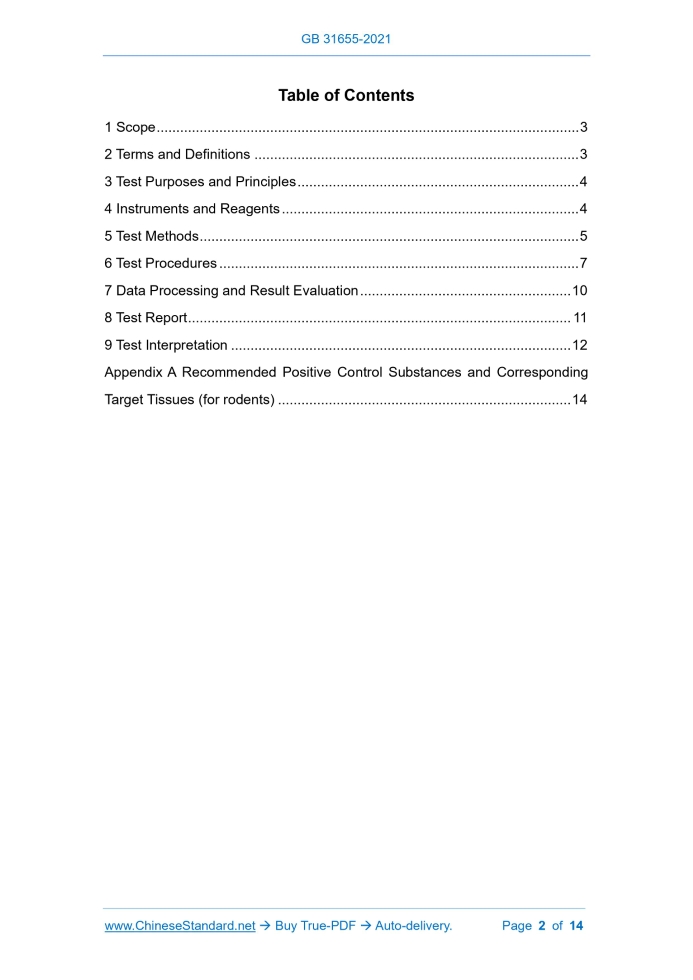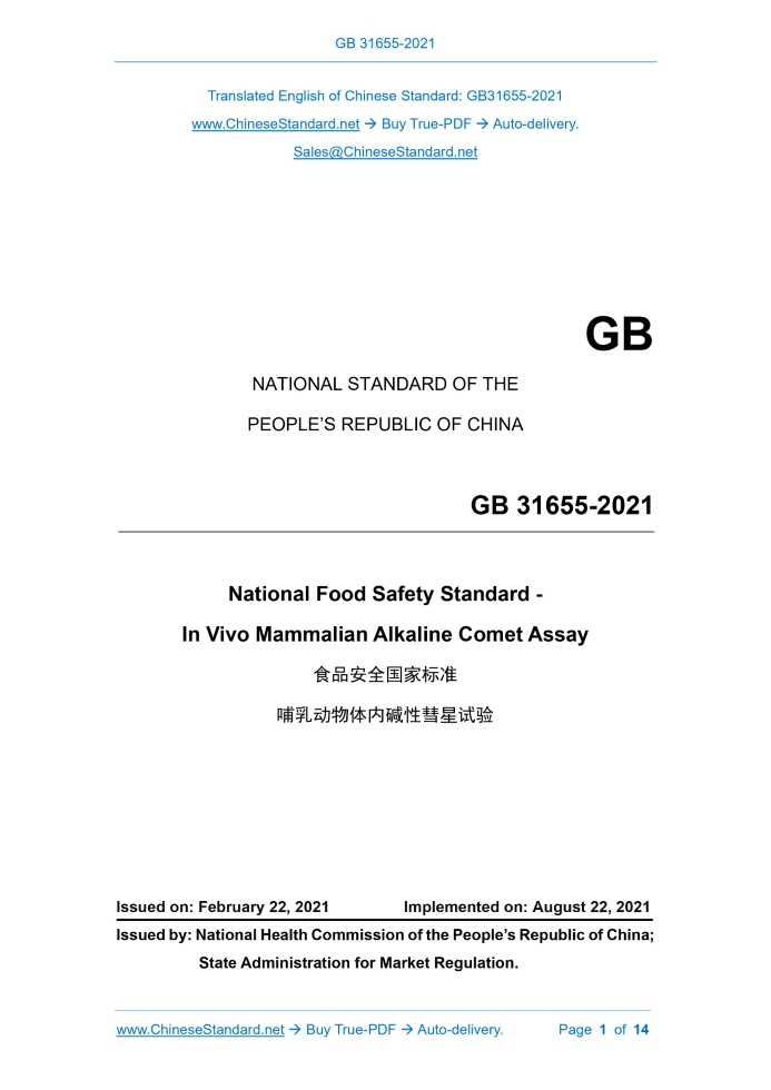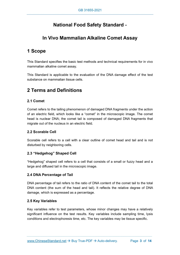 GB 31655-2021: National food safety standard - In vivo mammalian alkaline comet assay---This is an excerpt. Full copy of true-PDF in English version (including equations, symbols, images, flow-chart, tables, and figures etc.), auto-downloaded/delivered in 9 seconds, can be purchased online: https://www.ChineseStandard.net/PDF.aspx/GB31655-2021GB NATIONAL STANDARD OF THE PEOPLE’S REPUBLIC OF CHINA National Food Safety Standard - In Vivo Mammalian Alkaline Comet Assay Issued on: FEBRUARY 22, 2021 Implemented on: AUGUST 22, 2021 Issued by. National Health Commission of the People’s Republic of China; State Administration for Market Regulation. Table of Contents1 Scope... 3 2 Terms and Definitions... 3 3 Test Purposes and Principles... 4 4 Instruments and Reagents... 4 5 Test Methods... 5 6 Test Procedures... 7 7 Data Processing and Result Evaluation... 10 8 Test Report... 11 9 Test Interpretation... 12 Appendix A Recommended Positive Control Substances and Corresponding Target Tissues (for rodents)... 14 National Food Safety Standard - In Vivo Mammalian Alkaline Comet Assay1 ScopeThis Standard specifies the basic test methods and technical requirements for in vivo mammalian alkaline comet assay. This Standard is applicable to the evaluation of the DNA damage effect of the test substance on mammalian tissue cells.2 Terms and Definitions2.1 Comet Comet refers to the tailing phenomenon of damaged DNA fragments under the action of an electric field, which looks like a “comet” in the microscopic image. The comet head is nuclear DNA; the comet tail is composed of damaged DNA fragments that migrate out of the nucleus in an electric field. 2.2 Scorable Cell Scorable cell refers to a cell with a clear outline of comet head and tail and is not disturbed by neighboring cells. 2.3 “Hedgehog” Shaped Cell “Hedgehog” shaped cell refers to a cell that consists of a small or fuzzy head and a large and diffused tail in the microscopic image. 2.4 DNA Percentage of Tail DNA percentage of tail refers to the ratio of DNA content of the comet tail to the total DNA content (the sum of the head and tail). It reflects the relative degree of DNA damage, which is expressed as a percentage. 2.5 Key Variables Key variables refer to test parameters, whose minor changes may have a relatively significant influence on the test results. Key variables include sampling time, lysis conditions and electrophoresis time, etc. The key variables may be tissue specific. 4.2.4 Electrophoresis buffer. weigh-take EDTA disodium salt and sodium hydroxide (analytically pure); use pure water to prepare a solution (final concentrations are. 0.001 mol/L EDTA disodium salt and 0.3 mol/L sodium hydroxide). Prepare it right before use. Adjust pH to make pH ≥ 13.Before use, keep it refrigerated at below 10 °C for storage. 4.2.5 Neutralization buffer. weigh-take tris (hydroxymethyl) methyl aminomethane (analytically pure); use pure water to prepare a solution; the final concentration is 0.4 mol/L. Adjust pH to 7.5.Before use, keep it refrigerated at below 10 °C for storage. 4.2.6 Shearing buffer. weigh-take EDTA disodium salt (analytically pure); use Hank’s balanced salt solution (HBSS) (pH 6.7 ~ 7.8, excluding Ca2+, Mg2+ and phenol red) to dissolve it and prepare a solution; the final concentration is. 0.02 mol/L. Adjust pH to 7.5.Right before use, add dimethyl sulfoxide; the final concentration is 10% (V/V). Before use, keep it refrigerated at below 10 °C for storage. 4.2.7 Staining solution. DNA fluorescent dyes (for example, SYBR Gold, SYBR Green I, Gelred, propidium iodide or ethidium bromide); in accordance with the product requirements, prepare and use it.5 Test Methods5.1 Test Substance 5.1.1 Method of preparation. the test substance shall be dissolved or suspended in a suitable solvent. The optimal solvent is water. For test substances that are insoluble in water, vegetable oils (such as. olive oil and corn oil, etc.) may be used. For test substances that are insoluble in water or oil, carboxymethyl cellulose and starch may also be used to prepare suspensions or pastes. The test substance shall be prepared right before use, unless there is data suggesting that its solution or suspension is stable in storage. 5.1.2 Administration route. the test substance shall be administrated by gavage. Generally speaking, the gavage volume does not exceed 10 mL/kg body weight for rats and 20 mL/kg body weight for mice. If it is an aqueous solution, the maximum gavage volume may reach 20 mL/kg body weight; if it is an oily liquid, the gavage volume shall not exceed 4 mL/kg body weight; the gavage volume shall be consistent in each group. 5.2 Positive Control The positive control substance shall be able to induce DNA strand breaks in the target tissue of the test substance. Ethyl methane sulfonate (EMS) may be selected as the positive control substance. The mode, in which, the positive control substance is handled is not necessarily the same as that of the test substance. The positive control substances and their corresponding target tissues (for rodents) are shown in Appendix A. group shall follow the following sequence. a) 10 g/kg body weight; b) 100 times of possible intake by human beings; c) Maximum gavage volume at one time. In addition, there is also a negative (solvent) control group. The positive control substance may be administrated by oral gavage of 200 mg/kg body weight of ethyl methane sulfonate.6 Test Procedures6.1 Animal Observation During the test, observe and record animal health at least once a day (preferably at the same time). Meanwhile, the peak period of expected effects after the test substance is administrated shall be taken into consideration. 6.2 Sampling Time 6.2.1 The sampling time is a key variable, which shall be after the DNA strand is induced to break, and before the break is removed and repaired, or before cell death. The duration of some damages that cause DNA strand breaks detected by the alkaline