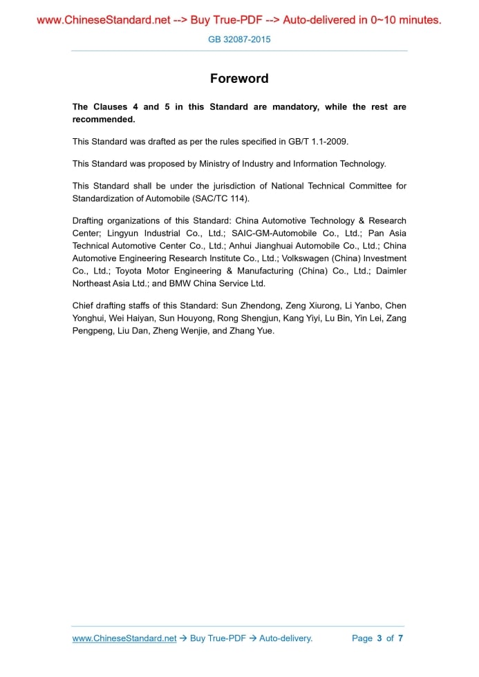 Similar standardsGB 32087-2015: Towing devices for light-duty vehicle---This is an excerpt. Full copy of true-PDF in English version (including equations, symbols, images, flow-chart, tables, and figures etc.), auto-downloaded/delivered in 9 seconds, can be purchased online: https://www.ChineseStandard.net/PDF.aspx/GB32087-2015NATIONAL STANDARD OF THE PEOPLE’S REPUBLIC OF CHINA ICS 43.020 T 09 Towing Devices for Light-Duty Vehicle Issued on. OCTOBER 09, 2015 Implemented on. JULY 01, 2016 Issued by. General Administration of Quality Supervision, Inspection and Quarantine; Standardization Administration of PRC. Table of ContentsForeword... 3 1 Scope... 4 2 Normative References... 4 3 Terms and Definitions... 4 4 Technical Requirements... 4 5 Test Methods... 6 6 Transition Period Requirements for Standard Implementation... 7ForewordThe Clauses 4 and 5 in this Standard are mandatory, while the rest are recommended. This Standard was drafted as per the rules specified in GB/T 1.1-2009. This Standard was proposed by Ministry of Industry and Information Technology. This Standard shall be under the jurisdiction of National Technical Committee for Standardization of Automobile (SAC/TC 114). Drafting organizations of this Standard. China Automotive Technology & Research Center; Lingyun Industrial Co., Ltd.; SAIC-GM-Automobile Co., Ltd.; Pan Asia Technical Automotive Center Co., Ltd.; Anhui Jianghuai Automobile Co., Ltd.; China Automotive Engineering Research Institute Co., Ltd.; Volkswagen (China) Investment Co., Ltd.; Toyota Motor Engineering & Manufacturing (China) Co., Ltd.; Daimler Northeast Asia Ltd.; and BMW China Service Ltd. Chief drafting staffs of this Standard. Sun Zhendong, Zeng Xiurong, Li Yanbo, Chen Yonghui, Wei Haiyan, Sun Houyong, Rong Shengjun, Kang Yiyi, Lu Bin, Yin Lei, Zang Pengpeng, Liu Dan, Zheng Wenjie, and Zhang Yue. Towing Devices for Light-Duty Vehicle1 ScopeThis Standard specifies the technical requirements and test methods of the towing devices for light-duty vehicle. This Standard is applicable to the Type-M and Type-N1 vehicles with the maximum allowable total mass of no greater than 3500kg.2 Normative ReferencesThe following documents are essential to the application of this document. For the dated documents, only the versions with the dates indicated are applicable to this document; for the undated documents, only the latest version (including all the amendments) are applicable to this document. GB/T 3730.2 Road Vehicle – Masses - Vocabulary and Codes GB/T 15089 Classification of Power-Driven Vehicles and Trailers3 Terms and DefinitionsFor the purposes of this document, the terms and definitions given in GB/T 15089 and GB/T 3730.2 and the following apply. 3.1 Towing device The components fixed or mounted on the vehicle, connected by means of tow rope, towline or tow bar, so that realize the towing or being towed of the vehicle.4 Technical Requirements4.1 General requirements 4.1.1 The vehicle shall be fixed or mounted at least one towing device on the front. 4.1.2 If the vehicle is equipped with towing device at the rear part, then the towing device shall meet the technical requirements of this Standard. 4.1.3 The outermost end of the towing device shall not protrude from the vertical projection of the outer contour of the vehicle on the horizontal plane, except when in traction state. 4.2 Strength requirements 4.2.1 Test according to the provisions of Clause 5 in this Standard, the minimum static load F that the towing device can be able to withstand is calculated as per the Formula (1).5 Test Methods5.1 Test conditions 5.1.1 The test shall be carried out on the same vehicle using the same towing device; the vehicle under test shall be in the kerb mass state, and fixed on a horizontal surface. 5.1.2 It is allowed to be carried out on a body or chassis that is completely equivalent to the actual vehicle; 5.2 Static load test 5.2.1 Separately apply the static load F of the horizontal tension and horizontal compression to the towing device; the direction of static load F is parallel to the longitudinal centerline of the vehicle.6 Transition Period Requirements for Standard ImplementationFor the production model, it shall be implemented 12 months after the implementation date of this Standard. ......Source: Above contents are excerpted from the full-copy PDF -- translated/reviewed by: www.ChineseStandard.net / Wayne Zheng et al. Tips & Frequently Asked Questions:Question 1: How long will the true-PDF of English version of GB 32087-2015 be delivered?Answer: The full copy PDF of English version of GB 32087-2015 can be downloaded in 9 seconds, and it will also be emailed to you in 9 seconds (double mechanisms to ensure the delivery reliably), with PDF-invoice.Question 2: Can I share the purchased PDF of GB 32087-2015_English with my colleagues?Answer: Yes. The purchased PDF of GB 32087-2015_English will be deemed to be sold to your employer/organization who actually paid for it, including your colleagues and your employer's intranet.Question 3: Does the price include tax/VAT?Answer: Yes. Our tax invoice, downloaded/delivered in 9 seconds, includes all tax/VAT and complies with 100+ countries' tax regulations (tax exempted in 100+ countries) -- See Avoidance of Double Taxation Agreements (DTAs): List of DTAs signed between Singapore and 100+ countriesQuestion 4: Do you accept my currency other than USD?Answer: Yes. www.ChineseStandard.us -- GB 32087-2015 -- Click this link and select your country/currency to pay, the exact amount in your currency will be printed on the invoice. Full PDF will also be downloaded/emailed in 9 seconds.How to buy and download a true PDF of English version of GB 32087-2015?A step-by-step guide to download PDF of GB 32087-2015_EnglishStep 1: Visit website https://www.ChineseStandard.net (Pay in USD), or https://www.ChineseStandard.us (Pay in any currencies such as Euro, KRW, JPY, AUD).Step 2: Search keyword "GB 32087-2015". Step 3: Click "Ad