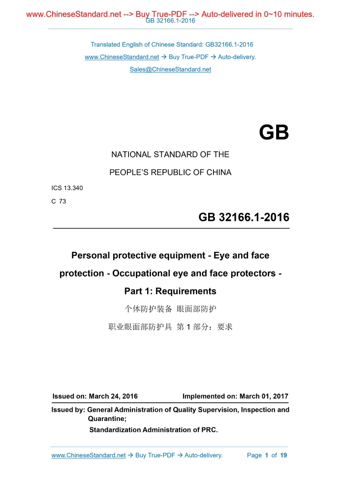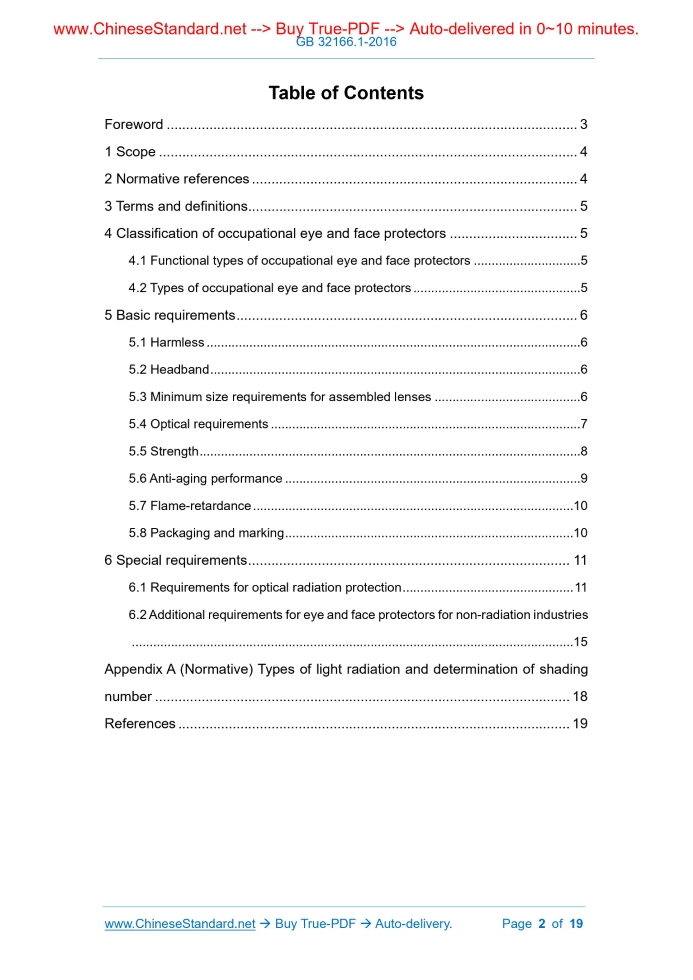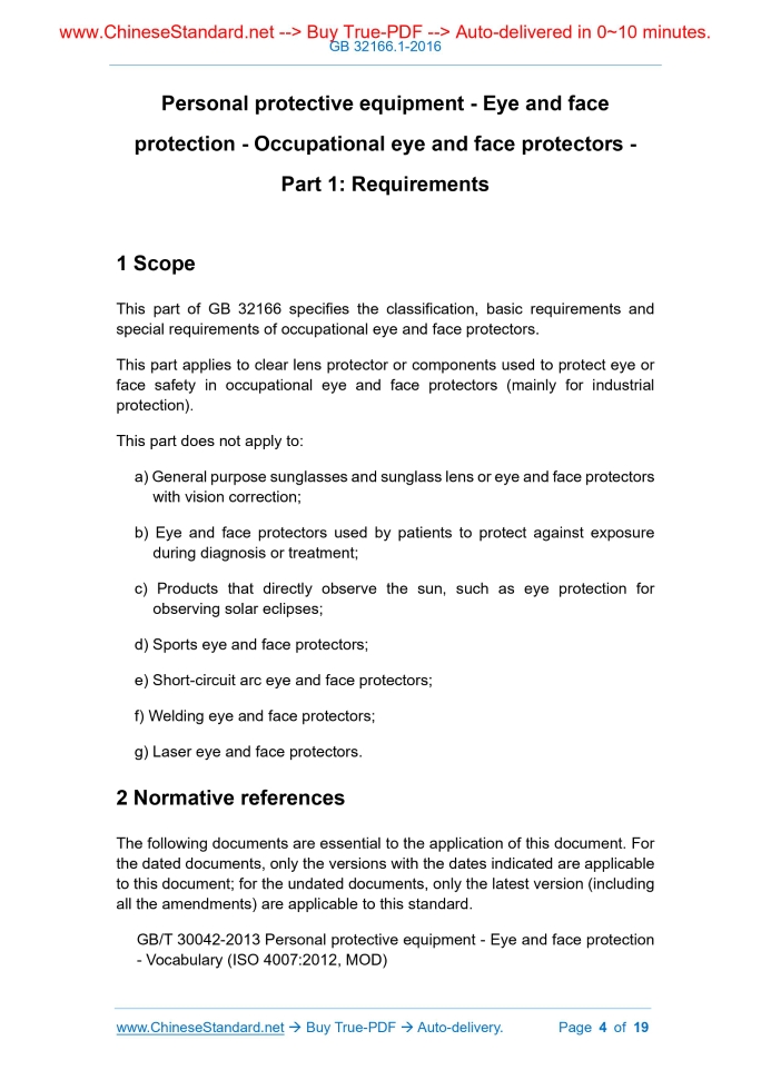 Similar standardsGB 32166.1-2016: Personal protective equipment - Eye and face protection - Occupational eye and face protectors - Part 1: Requirements---This is an excerpt. Full copy of true-PDF in English version (including equations, symbols, images, flow-chart, tables, and figures etc.), auto-downloaded/delivered in 9 seconds, can be purchased online: https://www.ChineseStandard.net/PDF.aspx/GB32166.1-2016 NATIONAL STANDARD OF THE PEOPLE’S REPUBLIC OF CHINA ICS 13.340 C 73 Personal protective equipment - Eye and face protection - Occupational eye and face protectors - Part 1.Requirements Issued on. MARCH 24, 2016 Implemented on. MARCH 01, 2017 Issued by. General Administration of Quality Supervision, Inspection and Quarantine; Standardization Administration of PRC. Table of ContentsForeword... 3 1 Scope... 4 2 Normative references... 4 3 Terms and definitions... 5 4 Classification of occupational eye and face protectors... 5 4.1 Functional types of occupational eye and face protectors... 5 4.2 Types of occupational eye and face protectors... 5 5 Basic requirements... 6 5.1 Harmless... 6 5.2 Headband... 6 5.3 Minimum size requirements for assembled lenses... 6 5.4 Optical requirements... 7 5.5 Strength... 8 5.6 Anti-aging performance... 9 5.7 Flame-retardance... 10 5.8 Packaging and marking... 10 6 Special requirements... 11 6.1 Requirements for optical radiation protection... 11 6.2 Additional requirements for eye and face protectors for non-radiation industries ... 15 Appendix A (Normative) Types of light radiation and determination of shading number... 18 References... 19ForewordChapter 5 of this part is mandatory; the rest are recommended. “Personal protective equipment - Eye and face protection - Occupational eye and face protectors” is divided into two parts. - Part 1.Requirements (GB 32166.1); - Part 2.Measurement method (GB/T 32166.2). This part is the first part of GB 32166. This part was drafted in accordance with the rules given in GB/T 1.1-2009. This part was proposed by the State Administration of Work Safety. This part shall be under the jurisdiction of the National Personal Protective Equipment Technical Committee (SAC/TC 112). Drafting organizations of this part. China National Institute of Standardization, Shanghai Institute of Work Safety Science, Honeywell Safety Equipment (Shanghai) Co., Ltd., Taizhou Yuyuan Safety Protective Products Co., Ltd., Guangzhou Institute of Metrology and Testing Technology. The main drafters of this part. Huang Shuai, Guo Dehua, Shang Jinglin, Wang Xiang, Guo Ya, Xu Sheng, Chen Wenbin, Ma Shengnan, Li Yuhao. Personal protective equipment - Eye and face protection - Occupational eye and face protectors - Part 1.Requirements1 ScopeThis part of GB 32166 specifies the classification, basic requirements and special requirements of occupational eye and face protectors. This part applies to clear lens protector or components used to protect eye or face safety in occupational eye and face protectors (mainly for industrial protection). This part does not apply to. a) General purpose sunglasses and sunglass lens or eye and face protectors with vision correction; b) Eye and face protectors used by patients to protect against exposure during diagnosis or treatment; c) Products that directly observe the sun, such as eye protection for observing solar eclipses; d) Sports eye and face protectors; e) Short-circuit arc eye and face protectors; f) Welding eye and face protectors; g) Laser eye and face protectors.2 Normative referencesThe following documents are essential to the application of this document. For the dated documents, only the versions with the dates indicated are applicable to this document; for the undated documents, only the latest version (including all the amendments) are applicable to this standard. GB/T 30042-2013 Personal protective equipment - Eye and face protection - Vocabulary (ISO 4007.2012, MOD)3 Terms and definitionsThe terms and definitions defined in GB/T 30042 apply to this document.4 Classification of occupational eye and faceprotectors 4.1 Functional types of occupational eye and face protectors The function of occupational eye and face protector refers to the ability to protect against one or more of the following dangers. 4.2 Types of occupational eye and face protectors According to the structure and style, occupational eye and face protector can be divided into the following types.5 Basic requirements5.1 Harmless Occupational eye and face protectors in contact with the skin shall meet the requirements of the purpose of use and the environment of use. There shall be no factors that endanger the user's health or safety. 5.2 Headband The headband shall be adjustable or self-adjusting. Without external force, the width of the contact between the headband that plays the main role in fixing the head and the face of the wearer shall not be less than 5 mm. 5.3 Minimum size requirements for assembled lenses The minimum size of the assembled lens shall meet the requirements of Table 1. 5.4 Optical requirements 5.4.1 Spherical, cylindrical, prismatic degrees 5.4.2 Visible light transmittance Test according to the method specified in 5.3 of GB/T 32166.2-2015.For colorless lenses, the visible light transmittance at the reference point shall not be less than 85%. 5.4.3 Scattered light 5.4.3.1 Wide-angle scattering (haze) When the visible light transmittance of the occupational eye and face protector is greater than or equal to 15%, the test is performed according to the method specified in 5.4 of GB/T 32166.2-2015. 5.5 Strength 5.5.1 Minimum strength of unassembled lens Perform the test according to the method specified in 6.1.1 of GB/T 32166.2- 2015.After the test, the sample shall not show the following conditions. 5.5.2 Minimum strength for occupational eye and face protector Perform the test according to the method specified in 6.1.2 of GB/T 32166.2- 2015.After the test, the sample shall not show the following conditions.