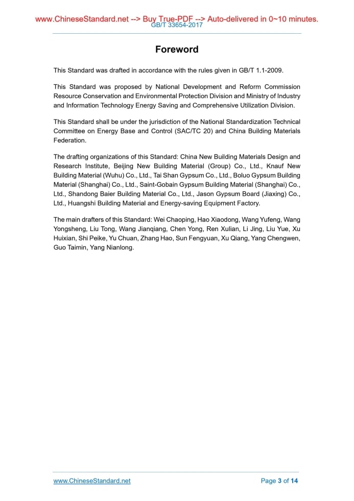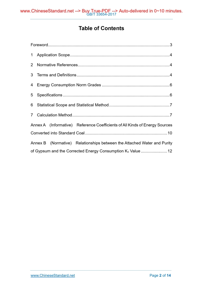 Similar standardsGB 33654-2017: The Norm of Energy Consumption Per Unit Throughput of Gypsum Plaster---This is an excerpt. Full copy of true-PDF in English version (including equations, symbols, images, flow-chart, tables, and figures etc.), auto-downloaded/delivered in 9 seconds, can be purchased online: https://www.ChineseStandard.net/PDF.aspx/GB33654-2017GB NATIONAL STANDARD OF THE PEOPLE’S REPUBLIC OF CHINA ICS 27.010 F 01 The Norm of Energy Consumption Per Unit Throughput of Gypsum Plaster Issued on: MAY 12, 2017 Implemented on: JUNE 1, 2018 Issued by. General Administration of Quality Supervision, Inspection and Quarantine of the People's Republic of China; Standardization Administration of the People's Republic of China. 3. No action is required - Full-copy of this standard will be automatically & immediately delivered to your EMAIL address in 0~60 minutes. Table of ContentsForeword ... 3 1 Application Scope ... 4 2 Normative References ... 4 3 Terms and Definitions ... 4 4 Energy Consumption Norm Grades ... 6 5 Specifications ... 6 6 Statistical Scope and Statistical Method ... 7 7 Calculation Method ... 7 Annex A (Informative) Reference Coefficients of All Kinds of Energy Sources Converted into Standard Coal ... 10 Annex B (Normative) Relationships between the Attached Water and Purity of Gypsum and the Corrected Energy Consumption Kc Value ... 12ForewordThis Standard was drafted in accordance with the rules given in GB/T 1.1-2009. This Standard was proposed by National Development and Reform Commission Resource Conservation and Environmental Protection Division and Ministry of Industry and Information Technology Energy Saving and Comprehensive Utilization Division. This Standard shall be under the jurisdiction of the National Standardization Technical Committee on Energy Base and Control (SAC/TC 20) and China Building Materials Federation. The drafting organizations of this Standard. China New Building Materials Design and Research Institute, Beijing New Building Material (Group) Co., Ltd., Knauf New Building Material (Wuhu) Co., Ltd., Tai Shan Gypsum Co., Ltd., Boluo Gypsum Building Material (Shanghai) Co., Ltd., Saint-Gobain Gypsum Building Material (Shanghai) Co., Ltd., Shandong Baier Building Material Co., Ltd., Jason Gypsum Board (Jiaxing) Co., Ltd., Huangshi Building Material and Energy-saving Equipment Factory. The main drafters of this Standard. Wei Chaoping, Hao Xiaodong, Wang Yufeng, Wang Yongsheng, Liu Tong, Wang Jianqiang, Chen Yong, Ren Xulian, Li Jing, Liu Yue, Xu Huixian, Shi Peike, Yu Chuan, Zhang Hao, Sun Fengyuan, Xu Qiang, Yang Chengwen, Guo Taimin, Yang Nianlong. The Norm of Energy Consumption Per Unit Throughput of Gypsum Plaster1 Application ScopeThis Standard specifies the terms and definitions, specifications, statistical scope and method, and calculation method of the norm of energy consumption per unit throughput of gypsum plaster (hereinafter referred to as energy consumption). This Standard applies to the calculation, management and assessment of the energy consumption for gypsum plaster production of the gypsum plaster production enterprises and gypsum plaster products production enterprises, and the energy consumption control for the new or renovation and extension projects.2 Normative ReferencesThe following referenced documents are indispensable for the application of this document. For dated references, only the edition dated applies to this document. For undated references, the latest edition of the referenced documents (including all amendments) applies to this Standard. GB/T 213, Determination of Calorific Value of Coal GB/T 384, Determination of Calorific Value of Petroleum Products GB/T 2589, General Principles for Calculation of the Comprehensive Energy Consumption GB/T 9776, Calcined Gypsum GB/T 12723, General Principles for Establishing Allowance of Energy Consumption Per Unit Throughput GB/T 17608, Division of Variety and Grading for Coal Products GB 17820, Natural Gas3 Terms and DefinitionsFor the purposes of this document, those defined in GB/T 12723 and the following terms and definitions apply. 3.1 gypsum The material whose main constituent is calcium sulphate dihydrate (CaSO4·2H2O) containing two crystal waters, including natural gypsum and industrial by-product gypsum. NOTE Also known as plaster stone. 3.2 industrial by-product gypsum The by-product which is produced by chemical reactions during the industrial production process and contains much calcium sulphate dihydrate, such as flue gas desulfurization gypsum, phosphorous gypsum, fluorine gypsum, titanium gypsum and citrate gypsum. 3.3 purity of gypsum The mass fraction (%) of calcium sulphate dihydrate in unit mass of a material after attached water is removed. 3.4 gypsum plaster The powdery cementing material which is made by calcining gypsum, with β semi- hydrated gypsum (β-CaSO4·1/2H2O) as the main constituent and without adding any additives, including natural gypsum plaster and industrial by-product gypsum plaster. 3.5 natural gypsum plaster Gypsum plaster which is made of natural gypsum. 3.6 gypsum plaster from industrial by-product Gypsum plaster which is made of industrial by-product gypsum. 3.7 comprehensive energy consumption for gypsum plaster The total of all kinds of energy sources consumed in the production process of gypsum plaster during the period of statistics.6 Statistical Scope and Statistical Method6.1 The energy consumption per unit throughput for gypsum plaster shall be accounted based on the accounting unit of the per unit throughput of acceptable products conforming to GB/T 9776. 6.2 The comprehensive energy consumption per unit throughput for gypsum plaster shall be calculated in accordance with all energy sources consumed during the production process specified in GB/T 2589, including the energy consumption of main production system, auxiliary production system and subsidiary production system. 6.3 The loss of fuel in storage shall be reckoned