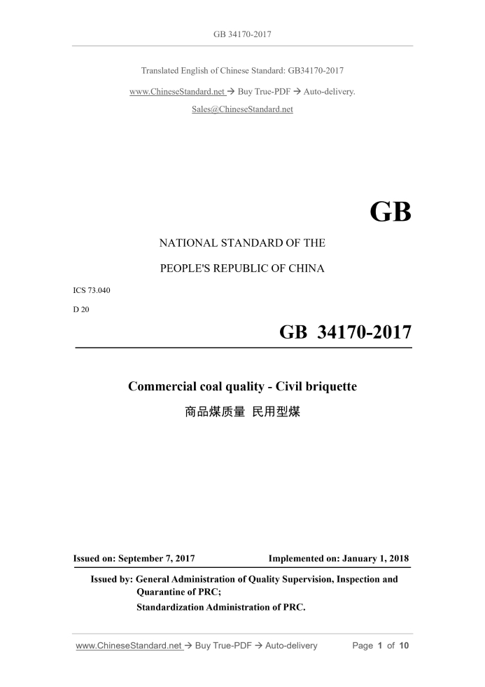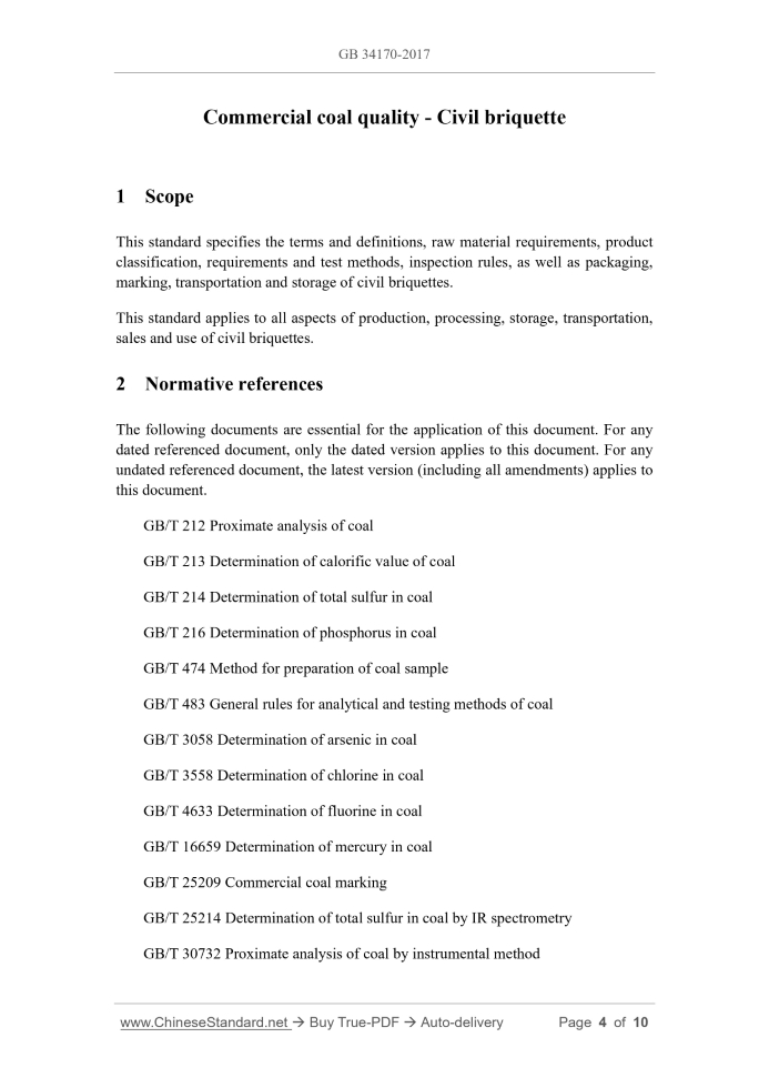 GB 34170-2017: Commercial coal quality -- Civil briquette Delivery: 9 seconds. True-PDF full-copy in English & invoice will be downloaded + auto-delivered via email. See step-by-step procedure Status: Valid
