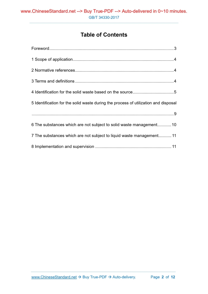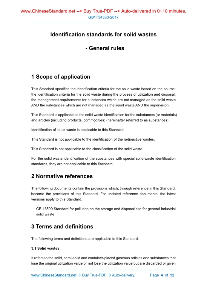 GB 34330-2017: Identification standards for solid wastes - General rules---This is an excerpt. Full copy of true-PDF in English version (including equations, symbols, images, flow-chart, tables, and figures etc.), auto-downloaded/delivered in 9 seconds, can be purchased online: https://www.ChineseStandard.net/PDF.aspx/GB34330-2017GB NATIONAL STANDARD OF THE PEOPLE’S REPUBLIC OF CHINA ICS 13.030 Z 70 Identification standards for solid wastes - General rules Issued on. AUGUST 31, 2017 Implemented on. OCTOBER 1, 2017 Issued by. Ministry of Environmental Protection of the People’s Republic of China; General Administration of Quality Supervision, Inspection and Quarantine of the People’s Republic of China. Table of ContentsForeword... 3 1 Scope of application... 4 2 Normative references... 4 3 Terms and definitions... 4 4 Identification for the solid waste based on the source... 5 5 Identification for the solid waste during the process of utilization and disposal ... 9 6 The substances which are not subject to solid waste management... 10 7 The substances which are not subject to liquid waste management... 11 8 Implementation and supervision... 11ForewordIn carrying out the Environmental Protection Law of the People's Republic of China and the Law of the People's Republic of China on the Prevention and Control of Environment Protection Caused by Solid Wastes, protecting the environment, and ensuring the health of the human body, this Standard is formulated. This Standard is organized-formulated by the Department of Soil Environment Management and the Department of Science, Technology and Standards of the Ministry of Environmental Protection of the PRC. The main drafting organizations of this Standard. Chinese Research Academy of Environmental Sciences. This Standard was approved by the Ministry of Environmental Protection of the PRC on May 27, 2017. This Standard was implemented from October 1, 2017. This standard shall be interpreted by the Ministry of Environmental Protection of the PRC. Identification standards for solid wastes - General rules1 Scope of applicationThis Standard specifies the identification criteria for the solid waste based on the source; the identification criteria for the solid waste during the process of utilization and disposal; the management requirements for substances which are not managed as the solid waste AND the substances which are not managed as the liquid waste AND the supervision. This Standard is applicable to the solid waste identification for the substances (or materials) and articles (including products, commodities) (hereinafter referred to as substances). Identification of liquid waste is applicable to this Standard. This Standard is not applicable to the identification of the radioactive wastes. This Standard is not applicable to the classification of the solid waste. For the solid waste identification of the substances with special solid-waste identification standards, they are not applicable to this Standard.2 Normative referencesThe following documents contain the provisions which, through reference in this Standard, become the provisions of this Standard. For undated reference documents, the latest versions apply to this Standard. GB 18599 Standard for pollution on the storage and disposal site for general industrial solid waste3 Terms and definitionsThe following terms and definitions are applicable to this Standard. 3.1 Solid wastes It refers to the solid, semi-solid and container-placed gaseous articles and substances that lose the original utilization value or not lose the utilization value but are discarded or given up during the production, life and other activities; AND articles and substances which are specified in laws and administrative regulations and are included in the solid waste management. 3.2 Solid waste identification It refers to the activity which judges whether the substance belongs to the solid waste or not. 3.5 Disposal It refers to the activity of incinerating the solid wastes; AND the activity that, by means of other methods which can alter the physical, chemical and biological characteristics of the solid waste, can reach the purpose of reducing the amount of solid waste that has been generated, reducing the volume of the solid waste, and reducing or eliminating the hazardous components; or the activity that can eventually place the solid waste in the landfill which meets the requirements of the environmental protection regulations. 3.6 Target products It refers to one or multiple products, including by-products, that are desired to be obtained during the process of process design, construction and operation.4 Identification for the solid waste based on the sourceThe following substances are the solid wastes (except for the ones in Clause 6). 4.1 Substances which loses the original value of use, including the following categories.5 Identification for the solid waste during the process of utilization and disposal5.1 In any condition, when the solid waste is utilized or disposed in any of the following ways, it shall still be subject to solid waste management (except for the ones in Clause 6.2). 5.2 For the products which are generated by the solid waste, and which meet the following conditions at the same time, they shall not be subject to solid waste management; they shall be subject to the corresponding product management (except for the ones which perform the utilization or disposal according to the Clause 5.1).6 The substances which are not subject to solid waste management6.1 The following substances shall not be subject to solid waste management. 6.2 The substances which are treated according to the following methods shall not be subject to solid waste management. 6.3 The substances which are not identified as the solid waste management by the Administrative Department of Environmental Protection of the State Council.7 The substances which are not subject to liquid waste management7.1 The waste water and sewage