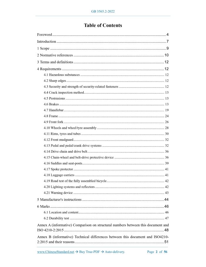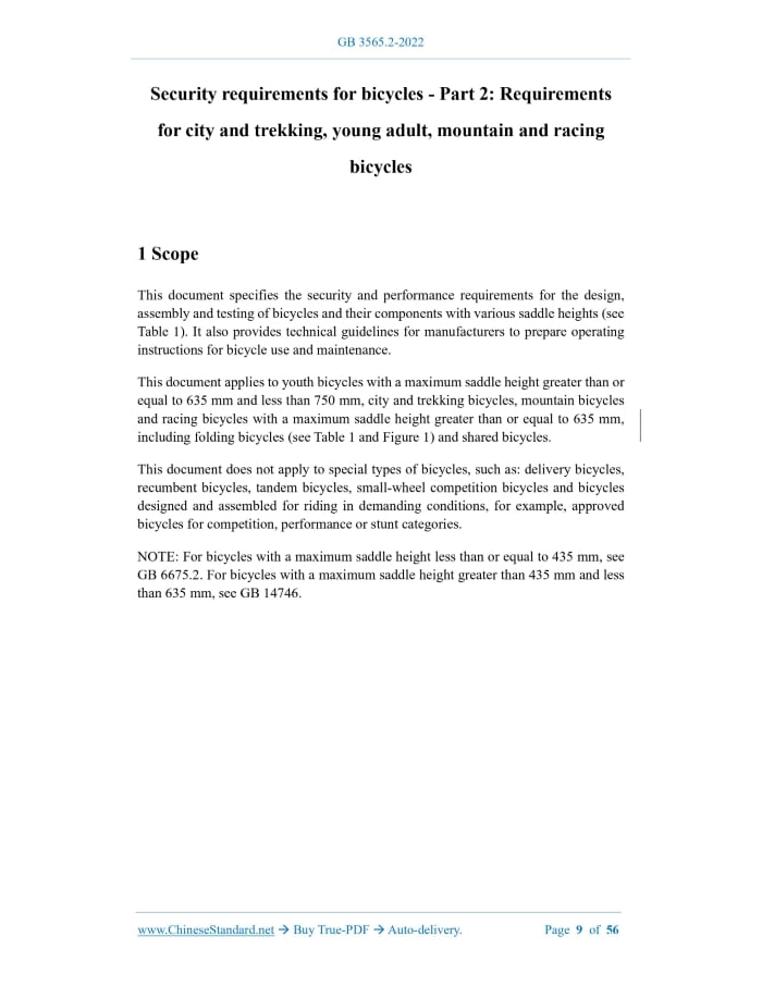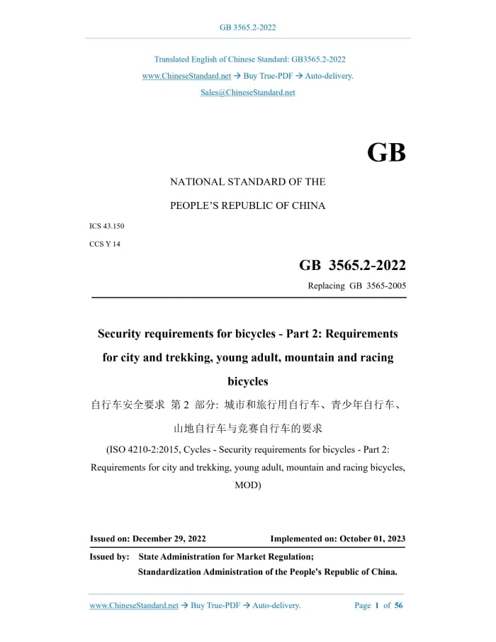 Similar standardsGB 3565.2-2022: Safety requirements for bicycles - Part 2: Requirements for city and trekking, young adult, mountain and racing bicycles---This is an excerpt. Full copy of true-PDF in English version (including equations, symbols, images, flow-chart, tables, and figures etc.), auto-downloaded/delivered in 9 seconds, can be purchased online: https://www.ChineseStandard.net/PDF.aspx/GB3565.2-2022 GB NATIONAL STANDARD OF THE PEOPLE’S REPUBLIC OF CHINA ICS 43.150 CCS Y 14 Replacing GB 3565-2005 Security requirements for bicycles - Part 2.Requirements for city and trekking, young adult, mountain and racing bicycles (ISO 4210-2.2015, Cycles - Security requirements for bicycles - Part 2. Requirements for city and trekking, young adult, mountain and racing bicycles, MOD) Issued on. DECEMBER 29, 2022 Implemented on. OCTOBER 01, 2023 Issued by. State Administration for Market Regulation; Standardization Administration of the People's Republic of China. Table of ContentsForeword... 4 Introduction... 7 1 Scope... 9 2 Normative references... 10 3 Terms and definitions... 12 4 Requirements... 12 4.1 Hazardous substances... 12 4.2 Sharp edges... 12 4.3 Security and strength of security-related fasteners... 12 4.4 Crack inspection method... 13 4.5 Protrusions... 13 4.6 Brakes... 13 4.7 Handlebar... 19 4.8 Frame... 24 4.9 Front fork... 26 4.10 Wheels and wheel/tyre assembly... 28 4.11 Rims, tyres and tubes... 30 4.12 Front mudguard... 32 4.13 Pedal and pedal/crank drive systems... 32 4.14 Drive chain and drive belt... 36 4.15 Chain-wheel and belt-drive protective device... 36 4.16 Saddles and seat-posts... 39 4.17 Spoke protector... 41 4.18 Luggage carriers... 41 4.19 Road test of the fully assembled bicycle... 42 4.20 Lighting systems and reflectors... 42 4.21 Warning device... 43 5 Manufacturer's instructions... 44 6 Marks... 46 6.1 Location and content... 46 6.2 Durability test... 47 Annex A (informative) Comparison on structural numbers between this document and ISO 4210-2.2015... 48 Annex B (informative) Technical differences between this document and ISO4210- 2.2015 and their reasons... 51 Annex C (informative) Geometric position of handlebar... 54 Bibliography... 56ForewordThis document was drafted in accordance with the rules given in GB/T 1.1-2020 "Directives for standardization - Part 1.Rules for the structure and drafting of standardizing documents". This document is Part 2 of GB(/T) 3565 "Security requirements for bicycles". The following parts of GB(/T) 3565 have been issued. - Part 1.Terms and definitions; - Part 2.Requirements for city and trekking, young adult, mountain and racing bicycles; - Part 3.Common test methods; - Part 4.Braking test methods; - Part 5.Steering test methods; - Part 6.Frame and fork test methods; - Part 7.Wheel and rim test methods; - Part 8.Pedal and drive system test methods; - Part 9.Saddle and seat-post test methods. This document replaces GB 3565-2005 "Security requirements for bicycles". Compared with GB 3565-2005, in addition to the structural and editorial changes, the main technical changes in this document are as follows. a) Change the scope of application to be consistent with the scope of application of ISO 4210.2015.Add "and shared bicycles" (see Chapter 1 of this Edition; Chapter 1 of Edition 2005); b) Change the terms and definitions (see Chapter 3 of this Edition; Chapter 3 of Edition 2005); c) Add requirements for hazardous substances (see 4.1 of this Edition); d) Add security-related fastener reliability and strength requirements (see 4.3 of this Edition); e) Add crack inspection method (see 4.4 of this Edition); f) Change the requirements for protrusions (see 4.5 of this Edition; 4.2 of Edition 2005); g) Change the requirements for brakes (see 4.6 of this Edition; Chapter 5 of Edition 2005); h) Change the requirements for handlebars (see 4.7 of this Edition; Chapter 6 of Edition 2005); i) Change the requirements for frames (see 4.8 of this Edition; Chapter 7 of Edition 2005); j) Change the requirements for front forks (see 4.9 of this Edition; Chapter 8 of Edition 2005); k) Changes to the requirements for wheels and wheel/tyre assembly (see 4.10 of this Edition; Chapter 9 of Edition 2005); l) Change the requirements for rims, tyres and tubes (see 4.11, Chapter 10 of t Edition 2005); m) Added requirements for front mudguard (see 4.12 of this Edition); n) Changes the requirements for pedals and pedal/crank drive systems (see 4.13 of this Edition; Chapter 11 of Edition 2005); o) Add the requirements for drive belts (see 4.14.2 of this Edition); p) Change the chain-wheel and belt-drive protective device (see 4.15 of this Edition; Chapter 14 of Edition 2005); q) Change the requirements for saddles and seat-posts (see 4.16 of this Edition; Chapter 12 of Edition 2005); r) Change the requirements for spoke protectors (see 4.17 of this Edition; Chapter 15 of Edition 2005); s) Add the requirements for luggage carriers (see 4.18 of this Edition); t) Change the requirements for road test of a fully assembled bicycle (see 4.19 of this Edition; Chapter 21 of Edition 2005); u) Change the requirements for lighting systems and reflectors (see 4.20 of this Edition; Chapter 17 of Edition 2005); v) Change the requirements for warning device (see 4.21 of this Edition; Chapter 18 of Edition 2005); w) Change the requirements for manufacturer's instructions (see Chapter 5 of this Edition; Chapter 19 of Edition 2005); x) Change the requirements for marks (see Chapter 6 of this Edition; Chapter 20 of Edition 2005); y) Delete the test methods (see Chapter 22~Chapter 31 of Edition 2005); z) Delete the description of the foot brake linearity test to obtain the best straight line and the least square of the ±20% limit line (see Annex A of Edition 2005). The revision of this document adopts ISO 4210-2.2015 "Cycles - Security requirements for bicycles - Part 2.Requirements for city and trekking, young adult, mountain and racing bicycles". Compared with ISO 42