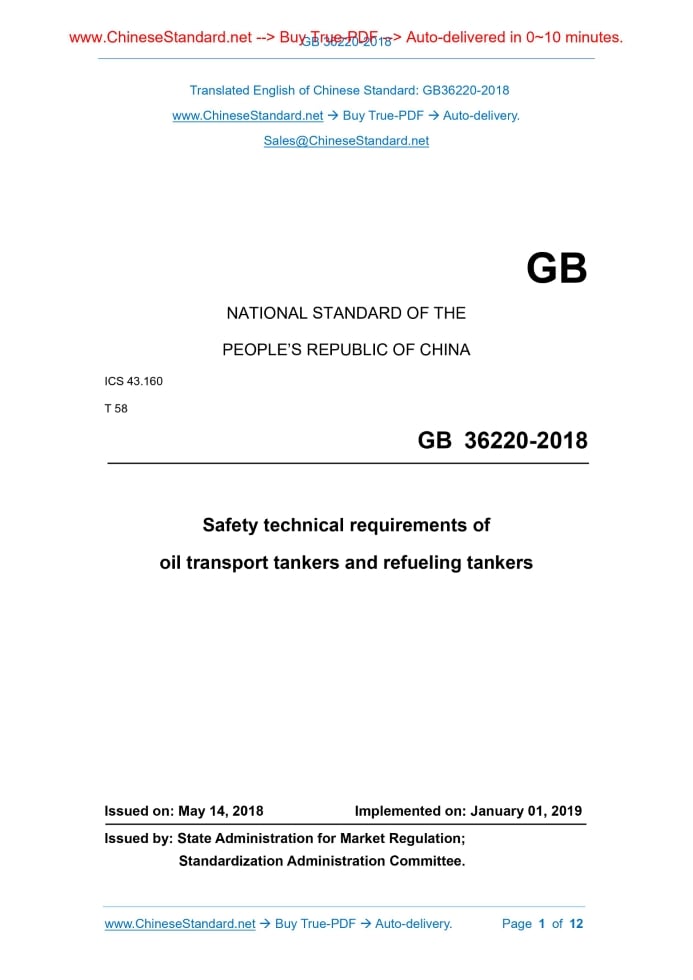 GB 36220-2018: Safety technical requirements of oil transport tankers and refueling tankers Delivery: 9 seconds. True-PDF full-copy in English & invoice will be downloaded + auto-delivered via email. See step-by-step procedure Status: Valid