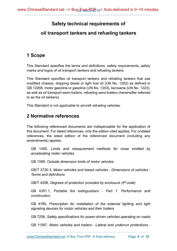 Similar standardsGB 36220-2018: Safety technical requirements of oil transport tankers and refueling tankers---This is an excerpt. Full copy of true-PDF in English version (including equations, symbols, images, flow-chart, tables, and figures etc.), auto-downloaded/delivered in 9 seconds, can be purchased online: https://www.ChineseStandard.net/PDF.aspx/GB36220-2018GB NATIONAL STANDARD OF THE PEOPLE’S REPUBLIC OF CHINA ICS 43.160 T 58 Safety technical requirements of oil transport tankers and refueling tankers Issued on: MAY 14, 2018 Implemented on: JANUARY 01, 2019 Issued by. State Administration for Market Regulation; Standardization Administration Committee. Table of ContentsForeword ... 3 1 Scope ... 4 2 Normative references ... 4 3 Terms and definitions ... 6 4 Safety requirements ... 6 5 Safety marks and logos ... 12 6 Requirements for transition period of standard implementation ... 12 Safety technical requirements of oil transport tankers and refueling tankers1 ScopeThis Standard specifies the terms and definitions, safety requirements, safety marks and logos of oil transport tankers and refueling tankers. This Standard specifies oil transport tankers and refueling tankers that use modified chassis, shipping diesel or light fuel oil (UN No. 1202) as defined in GB 12268, motor gasoline or gasoline (UN No. 1203), kerosene (UN No. 1223), as well as oil transport semi-trailers, refueling semi-trailers (hereinafter referred to as the oil tankers). This Standard is not applicable to aircraft refueling vehicles.2 Normative referencesThe following referenced documents are indispensable for the application of this document. For dated references, only the edition cited applies. For undated references, the latest edition of the referenced document (including any amendments) applies. GB 1495, Limits and measurement methods for noise emitted by accelerating motor vehicles GB 1589, Outside dimension limits of motor vehicles GB/T 3730.3, Motor vehicles and towed vehicles - Dimensions of vehicles - Terms and definitions GB/T 4208, Degrees of protection provided by enclosure (IP code) GB 4351.1, Portable fire extinguishers - Part 1. Performance and construction GB 4785, Prescription for installation of the external lighting and light signaling devices for motor vehicles and their trailers GB 7258, Safety specifications for power-driven vehicles operating on roads GB 11567, Motor vehicles and trailers - Lateral and underrun protections - Requirements GB 12268, List of dangerous goods GB 12676, Technical requirements and testing methods for commercial vehicle and trailer braking systems GB/T 18411, Power-driven vehicles manufacturers plate GB 18564.1, Road tanker for dangerous liquid goods transportation - Part 1. Technical requirements of atmospheric pressure metal tank GB/ T 19056, Vehicle travelling data recorder GB 20300, Safety specifications for road transportation vehicle of explosive substance and chemical toxic substance GB 20951-2007, Emission standard of air pollutant for gasoline transport GB 21668-2008, Provisions of vehicles for the carriage of dangerous goods with regard to their specific constructional features GB/T 24545, Requirement of speed limitation system for motor vehicles JT 230, Requirements and test methods of brake performance for city bus retarder JT/T 794, GNSS system for operating vehicles - Technical specification for vehicle terminals QC/T 518, Tightening torque for automotive threaded fasteners QC/T 932, Emergency shutoff valve of road tanker for dangerous liquid goods transportation QC/T 1061, Road transport lightweight fuel tank vehicle anti-overflow system QC/T 1062, Road transport lightweight fuel tank vehicle unloading value QC/T 1063, Road transport lightweight fuel tank vehicle oil and gas recovery components QC/T 1064, Road transport flammable liquid dangerous goods tank vehicle - breathing valve QC/T 1065, Road transport flammable liquid dangerous goods tank vehicle - manhole cover b) the oil tankers shall have grounding reel; the grounding wire of the reel shall be soft, flexible and retractable; the resistance between the grounding wire and the tanker shall be less than or equal to 5 Ω. 4.1.17 The oil tankers shall be installed with the vehicle driving recorder in accordance with GB/T 19056. The vehicle driving recorders shall be installed inside the cab and easy for the user to view and extract data. 4.1.18 The oil transport tankers and refueling tankers shall be equipped with satellite positioning system vehicle terminals in accordance with JT/T 794 regulations. The satellite positioning system vehicle terminal shall be installed in the cab. The main power supply of the satellite positioning system vehicle terminal shall be the vehicle power supply. It can be powered by the backup battery pack of the vehicle terminal when power to the vehicle is not available. Backup battery pack can support normal working time of not less than 8h. Power leads are clearly marked with different colors or labels (equal spacing). The antenna shall be kept away from other sensitive electronic devices. The grounding wire of the vehicle terminal shall be connected to the vehicle chassis. 4.1.19 A overturning protection device shall be provided at the top of the tanker of the oil tankers to prevent the safety attachments and loading-unloading attachments of the tanker roof from being damaged due to collision or overturning. This device can be configured as a reinforcement ring or a protective top cover, a lateral or longitudinal member, etc. The highest point of the safety accessories and loading-unloading attachments on the top of the tanker tank shall be at least 20 mm below the highest point of this device. There shall be no fluid accumulation in the overturning protection device. 4.1.20 The exhaust pipe outlet of the oil tanker engine shall be placed before the front end surface of the tanker and not higher than the upper plane of the longitudinal beam of the chassis. T